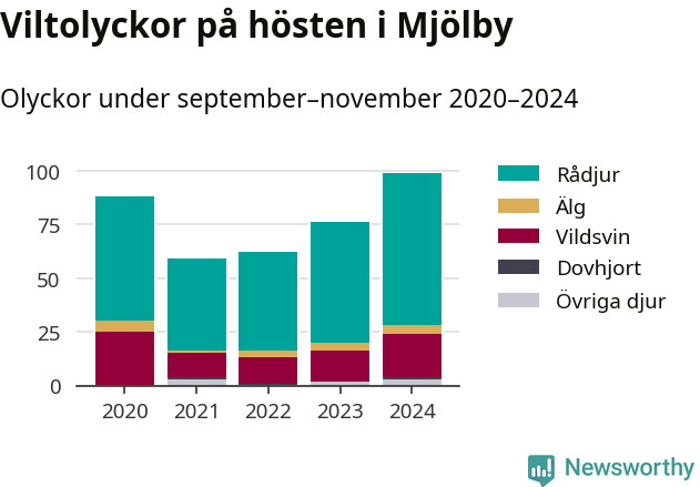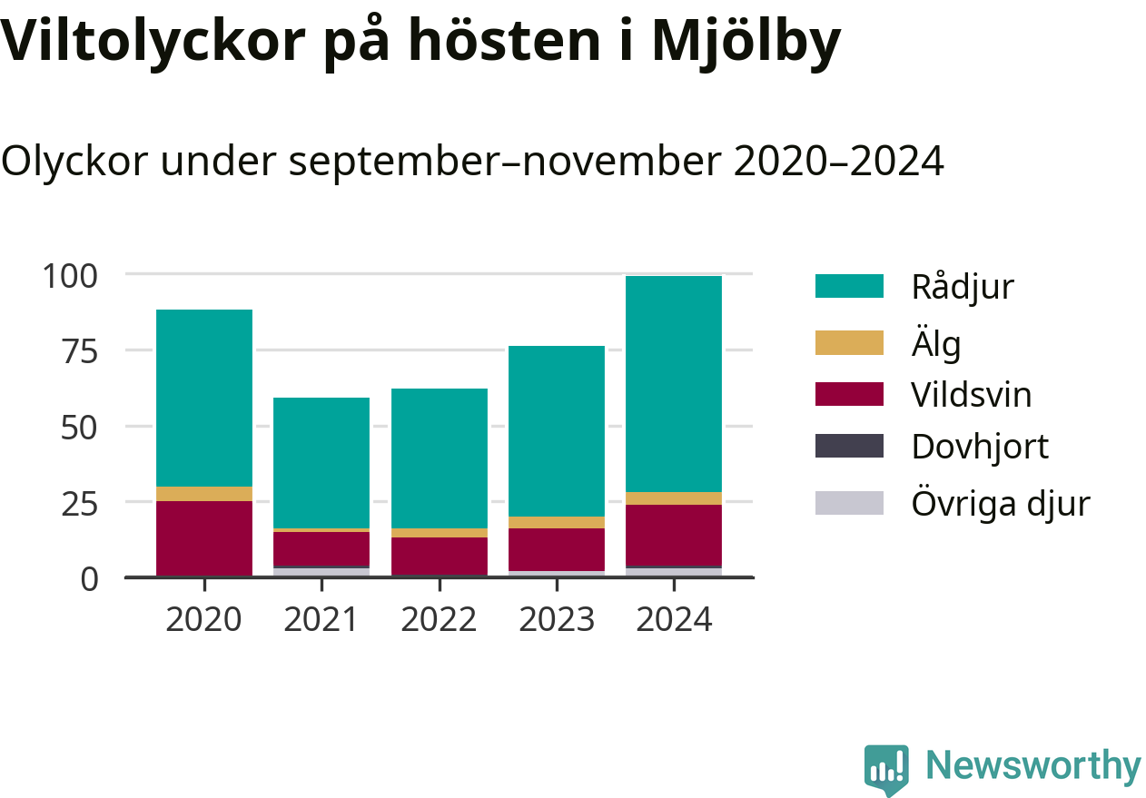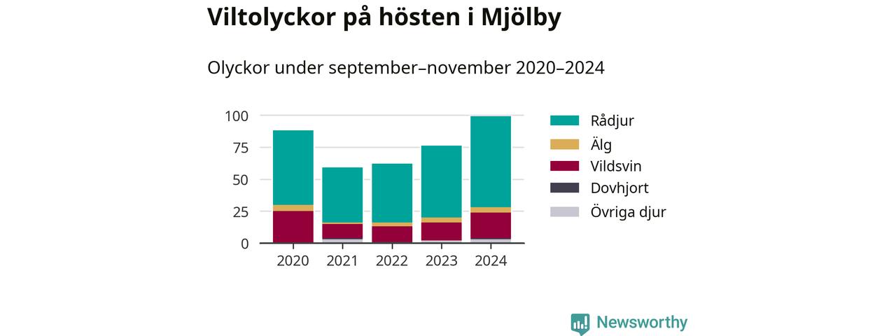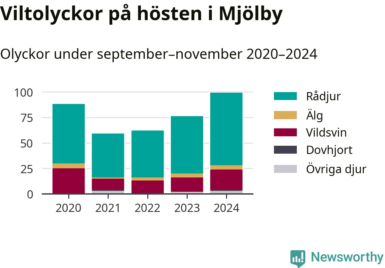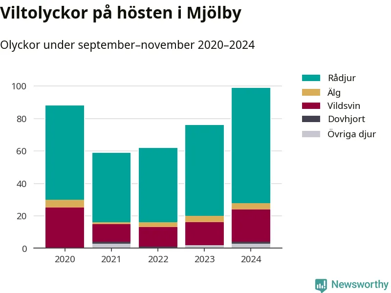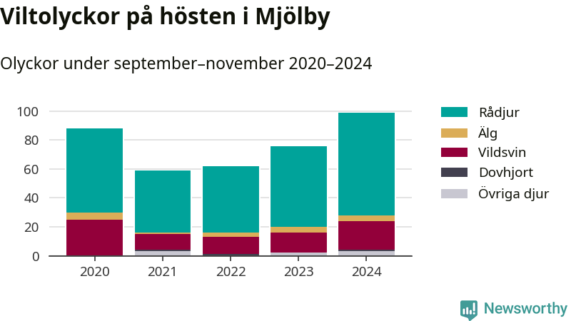Under de senaste höstarna har antalet viltolyckor ökat i Sverige. I fjol höst noterades också flest viltolyckor i Mjölby hittills under 2020-talet, totalt 99 stycken.