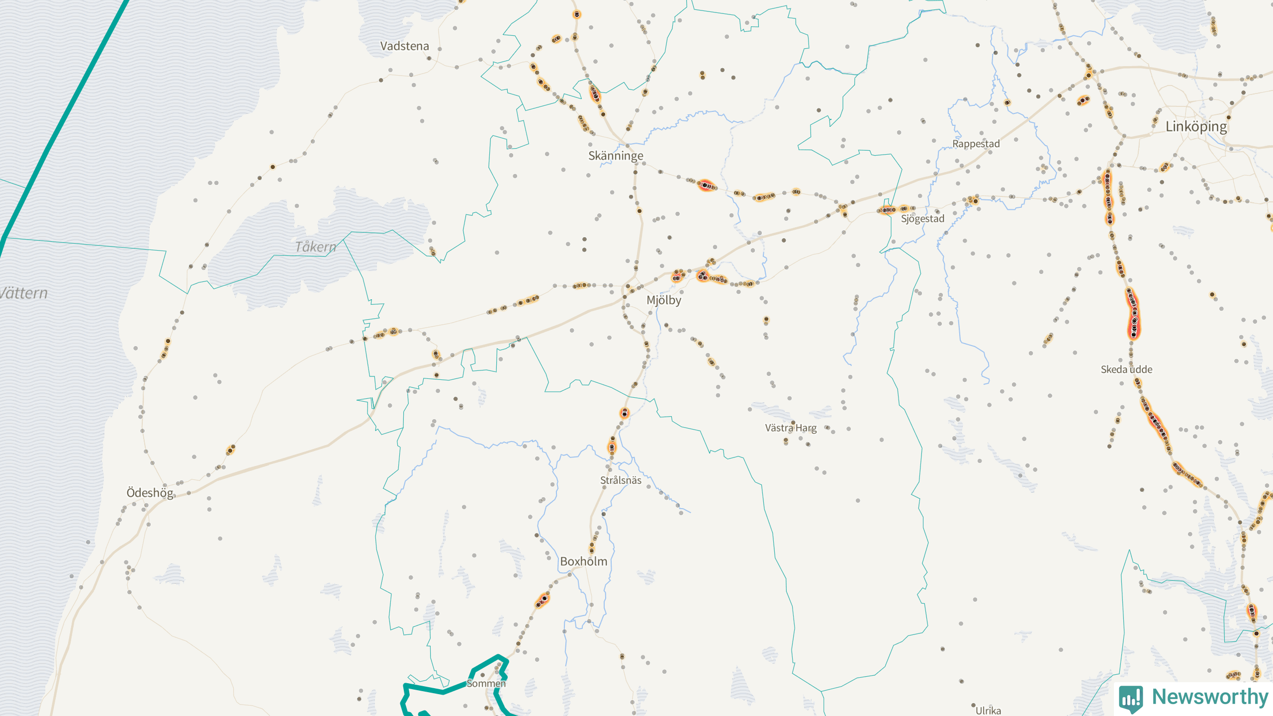 Den mest olycksdrabbade vägen i Östergötland är väg 35, med totalt 465 rapporterade viltolyckor i länet under femårsperioden. Flest olyckor längs väg 35 – 362 stycken – skedde i Åtvidabergs kommun. Linköping är den kommun med flest registrerade viltolyckor i länet totalt, 1 194 stycken under perioden september–november 2020–2024.