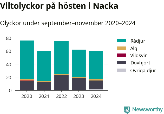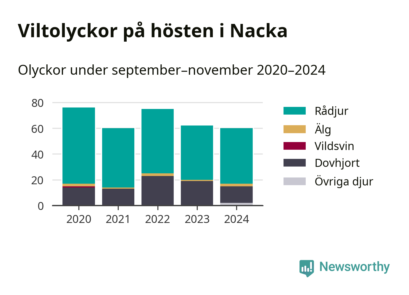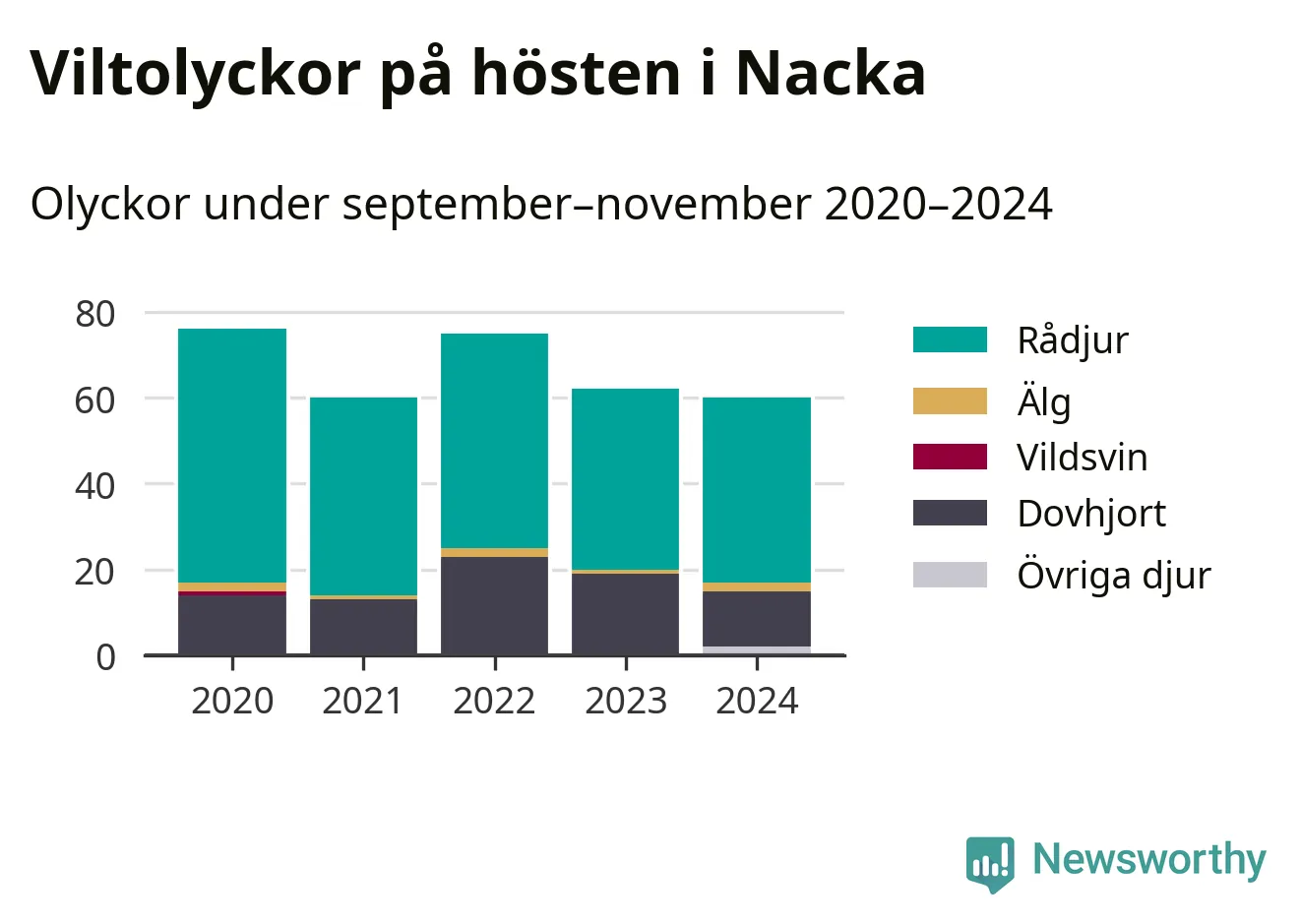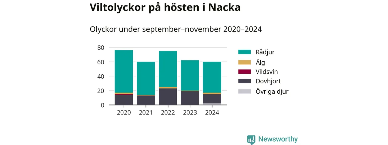 Viltolyckor i Nacka 2020–2024 uppdelat på viltslag