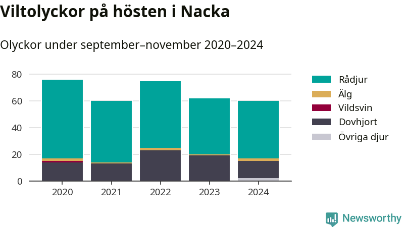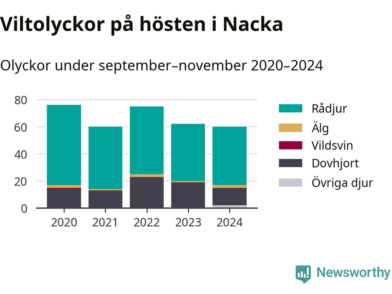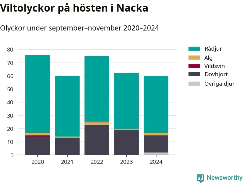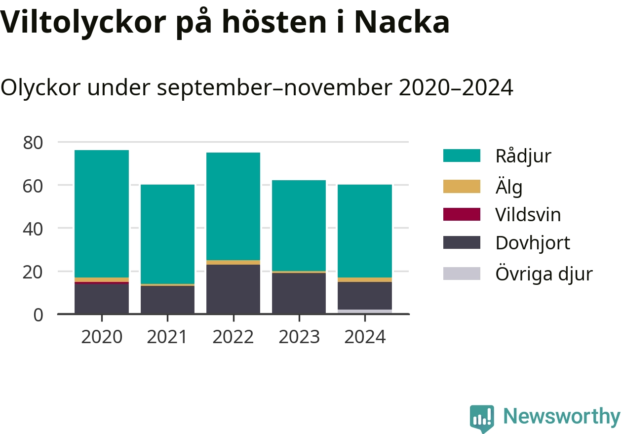 Viltolyckor i Nacka 2020–2024 uppdelat på viltslag