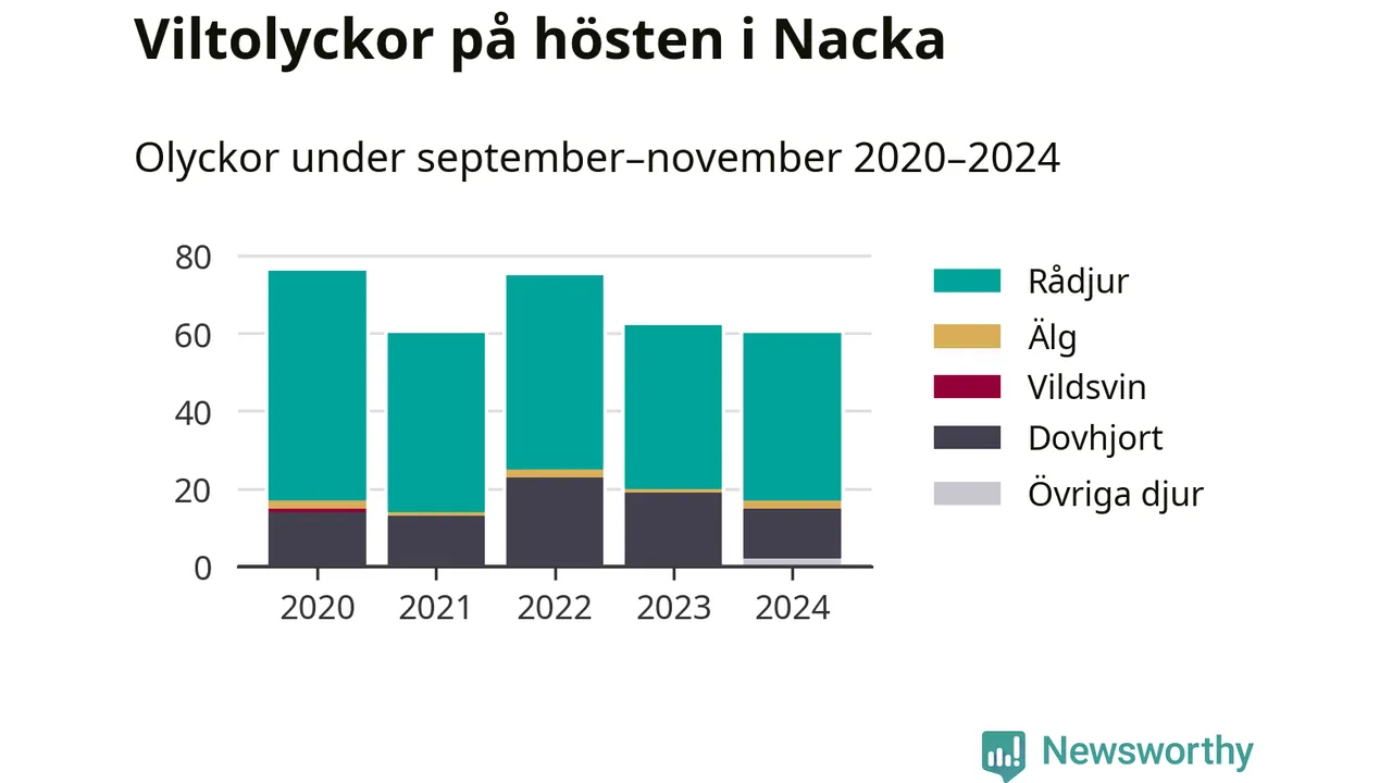 Under de senaste höstarna har antalet viltolyckor ökat i Sverige. I fjol höst noterades dock färst viltolyckor i Nacka hittills under 2020-talet, totalt 60 stycken.