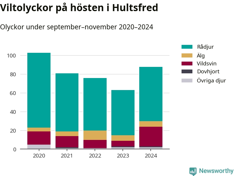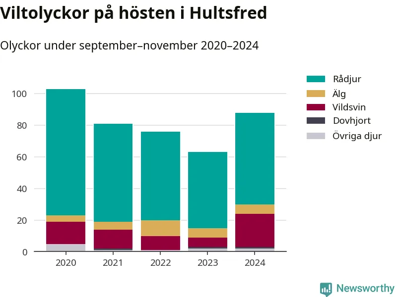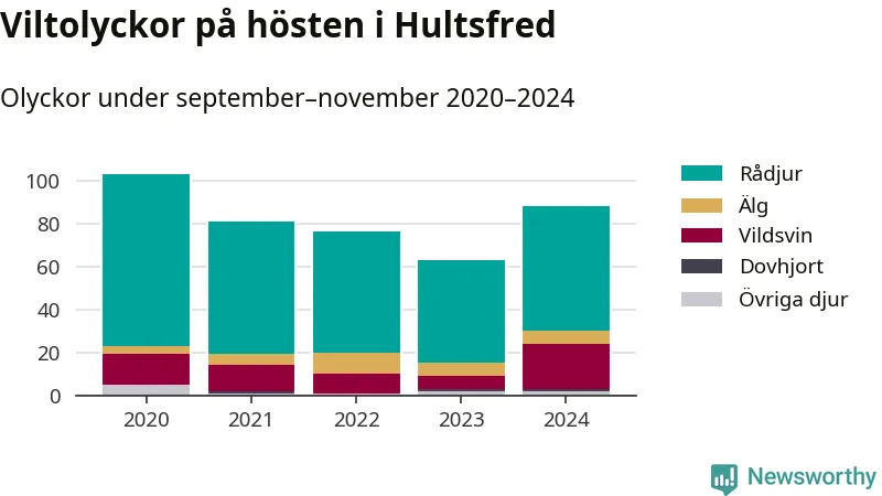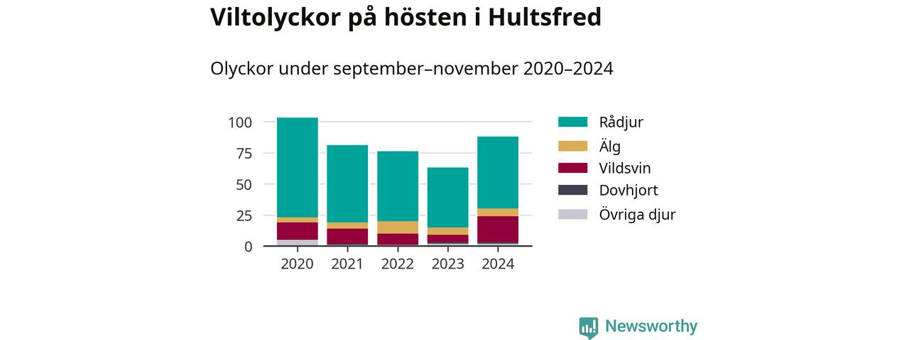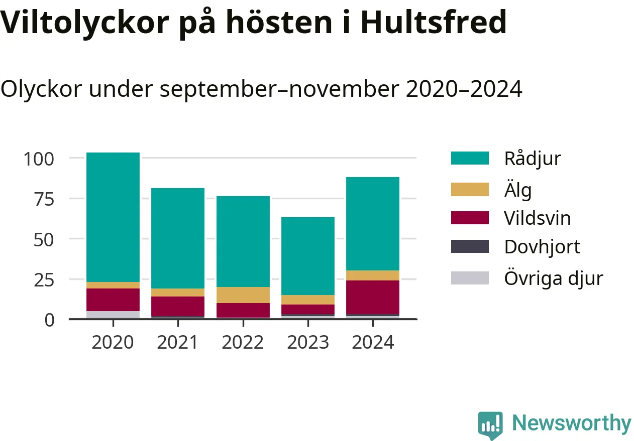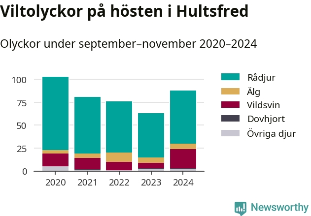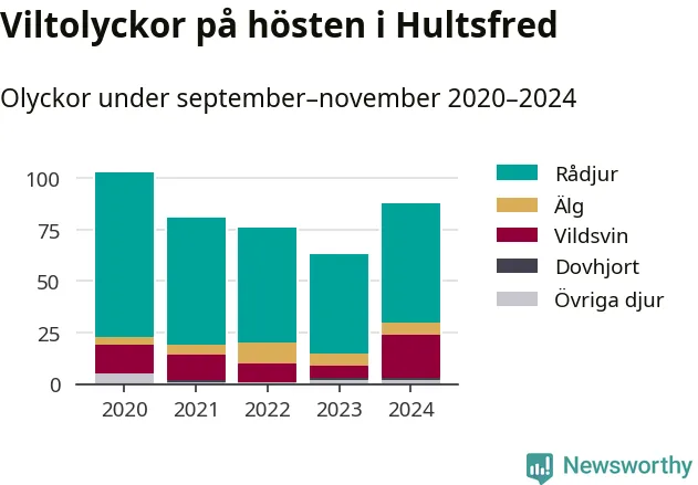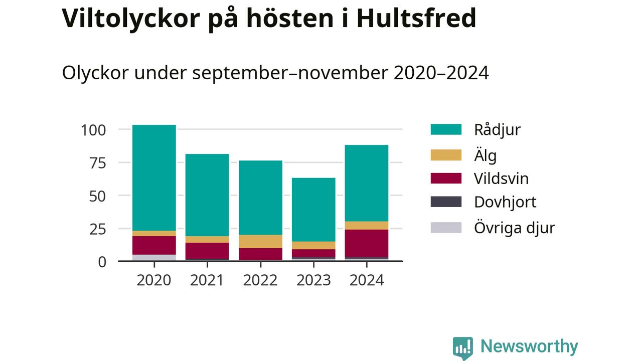 Under de senaste höstarna har antalet viltolyckor ökat i Sverige. Den höst med flest viltolyckor i Hultsfred hittills under 2020-talet var 2020, 103 olyckor. I fjol höst rapporterades totalt 88 olyckor.