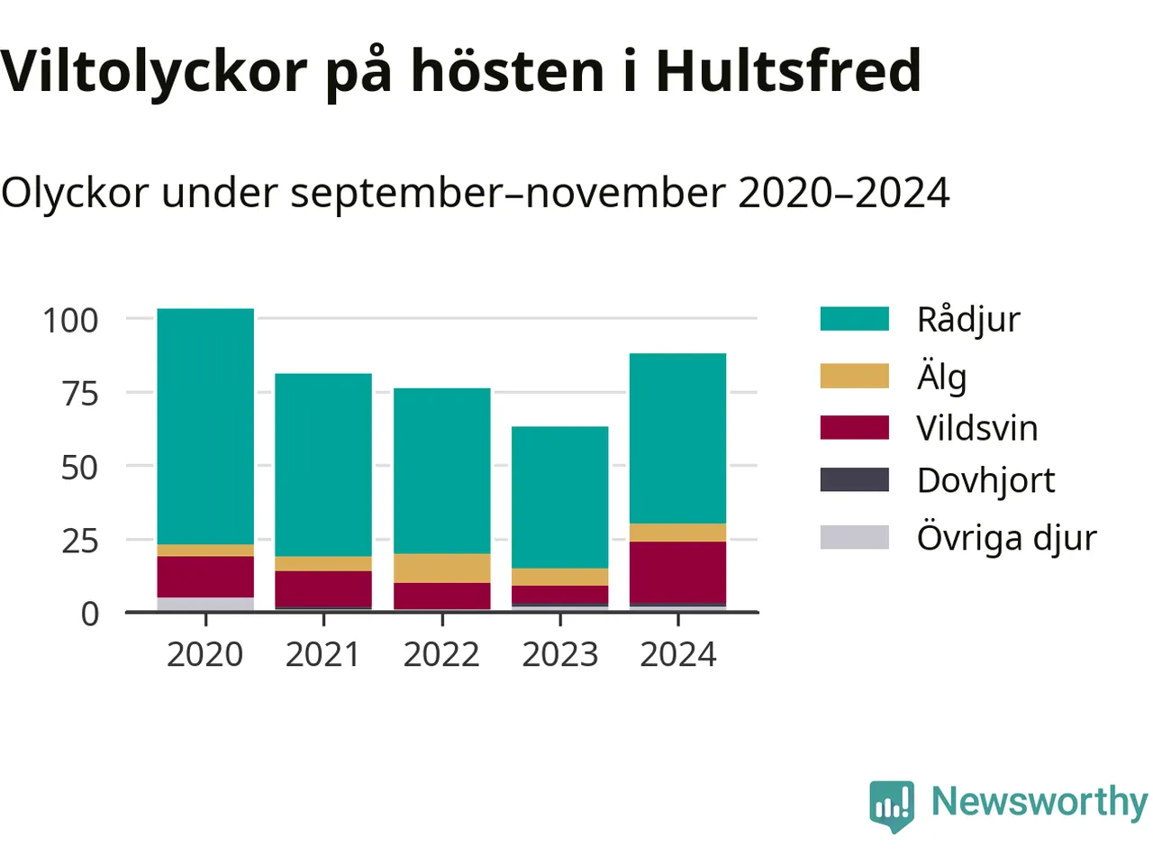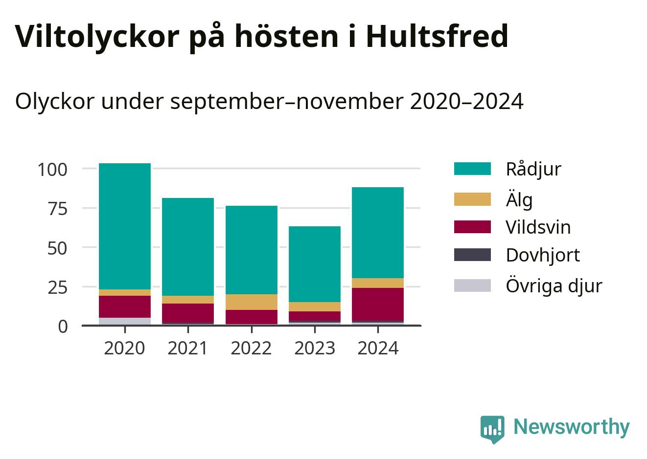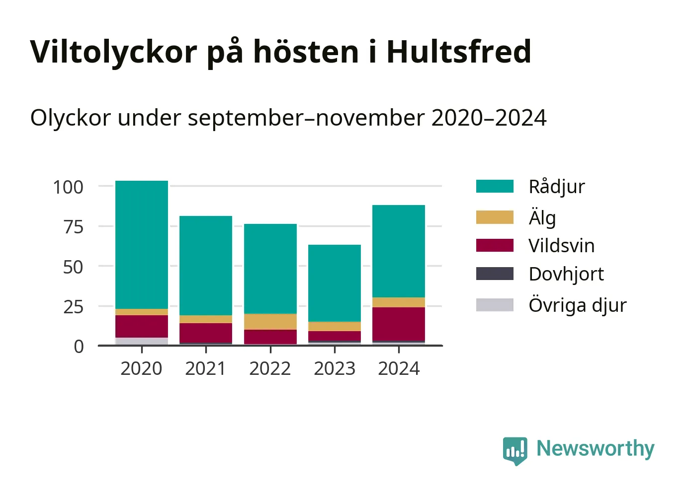 Källa: Nationella viltolycksrådet. Gäller olyckor under månaderna september–november 2020–2024.