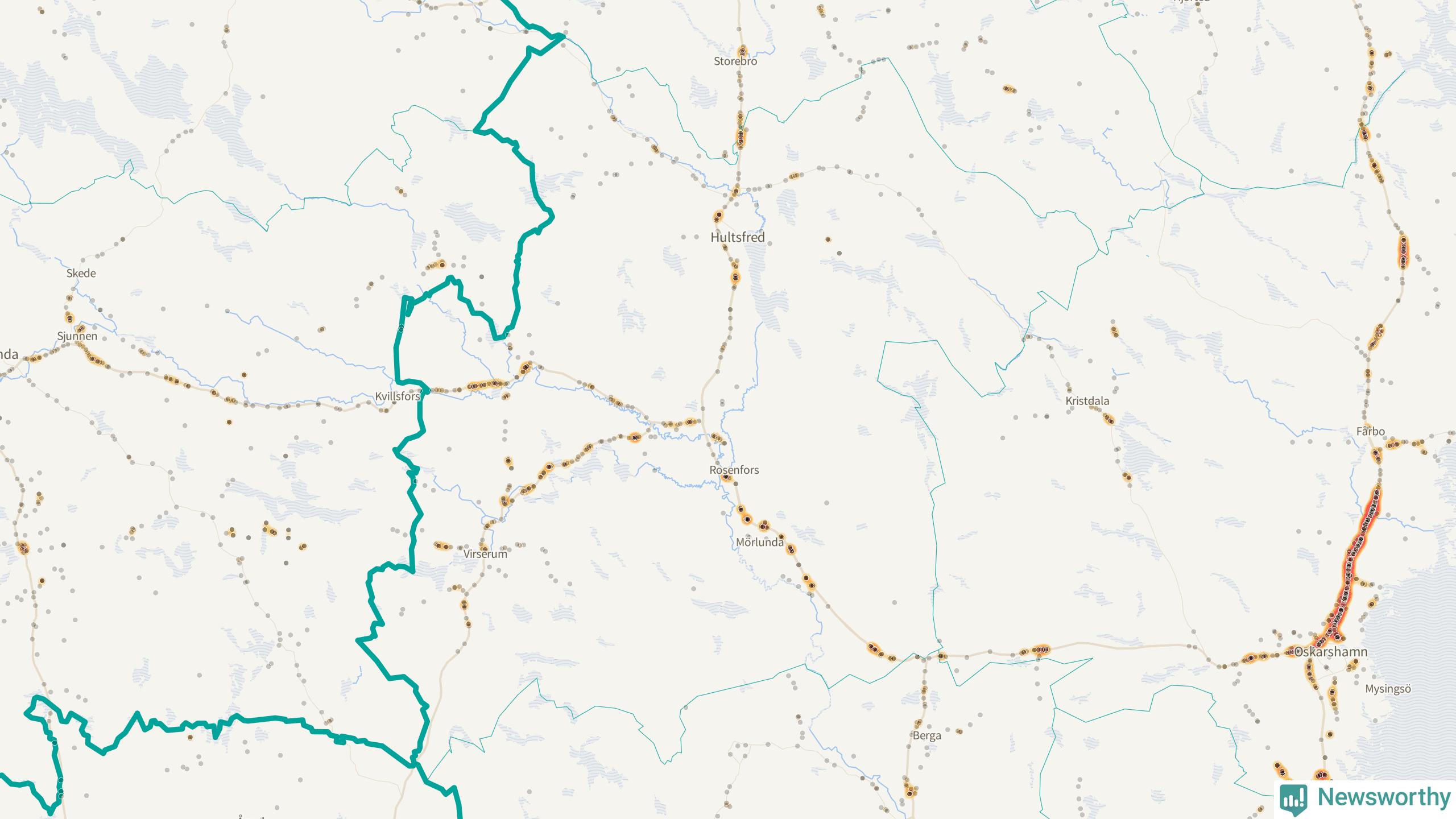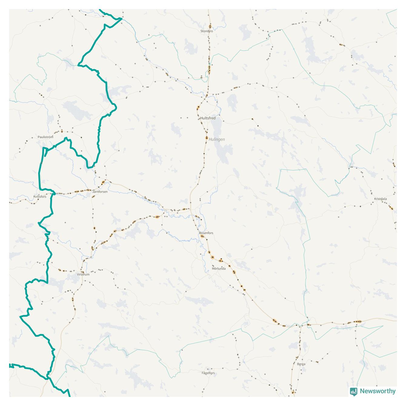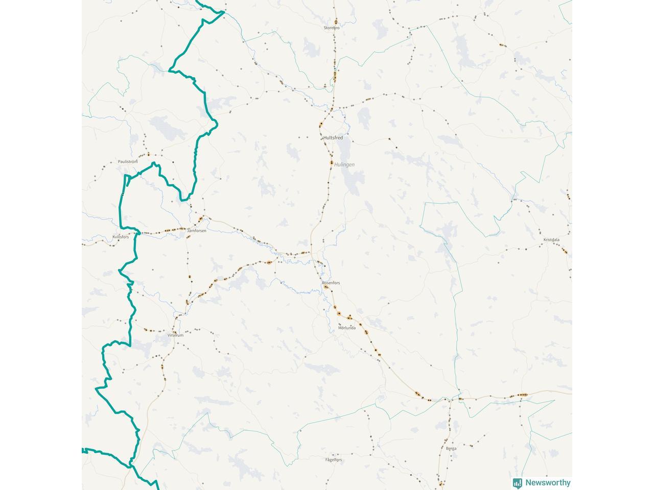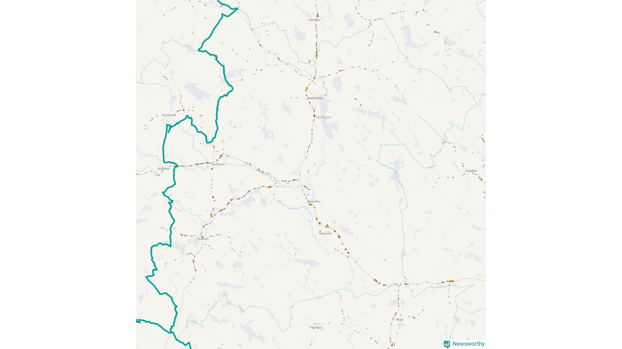 Flest olyckor i kommunen – 131 stycken – har skett längs väg 23 (då räknar vi in 50 olyckor där väg 23 har gemensam sträckning med väg 34 och elva olyckor där väg 23 har gemensam sträckning med väg 47). Av dessa orsakades 81 av rådjur. Längs väg 47 har 109 viltolyckor rapporterats under motsvarande period.