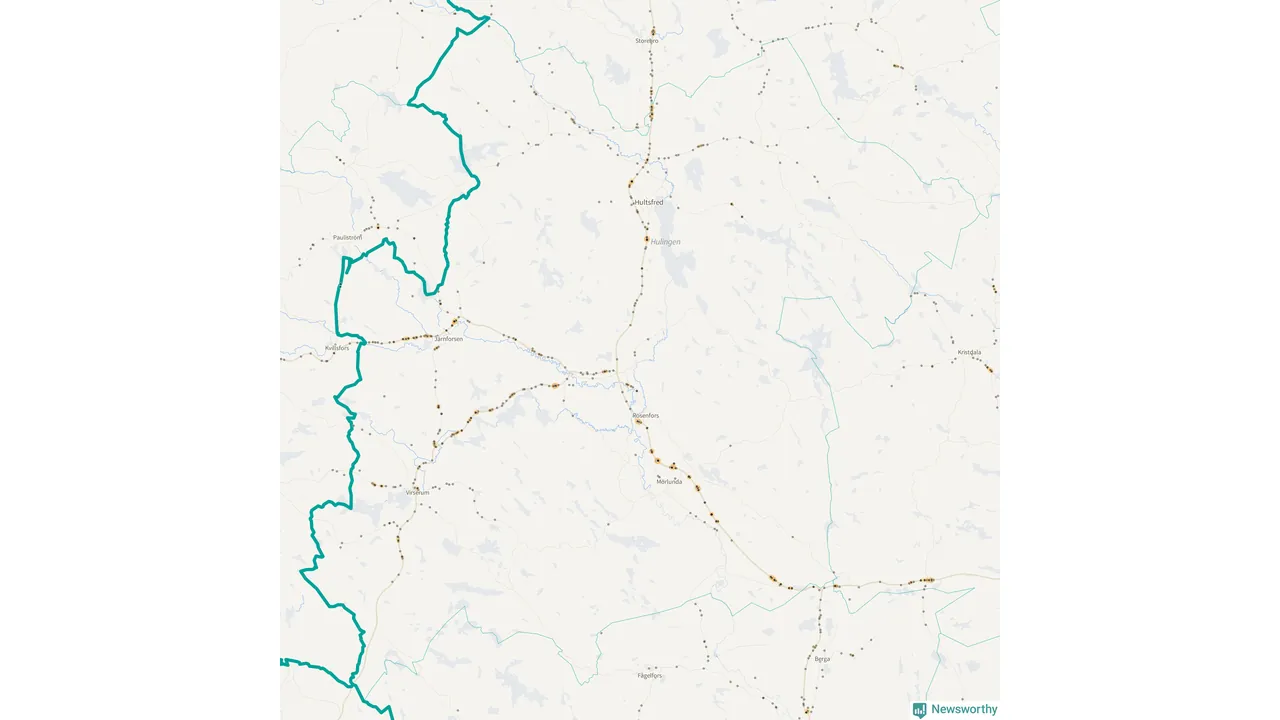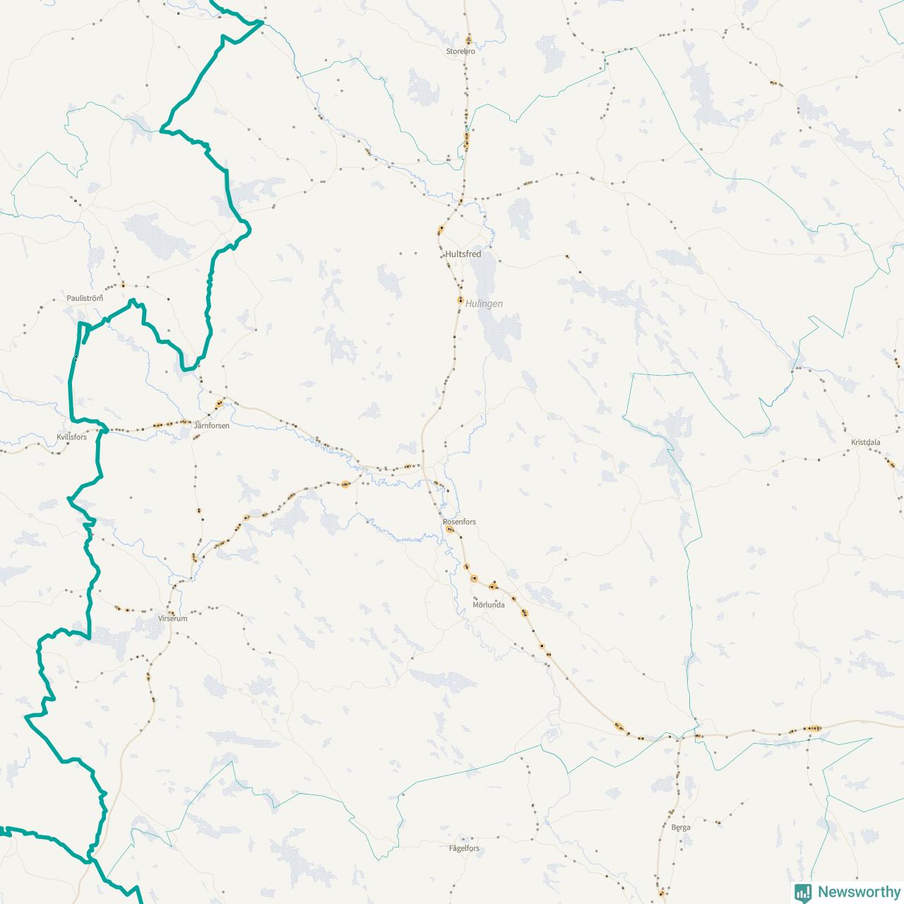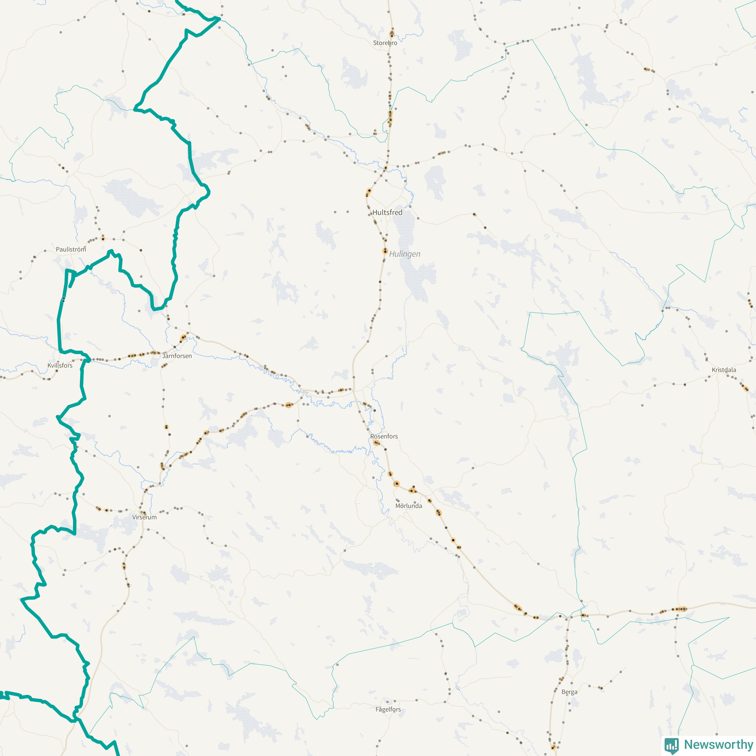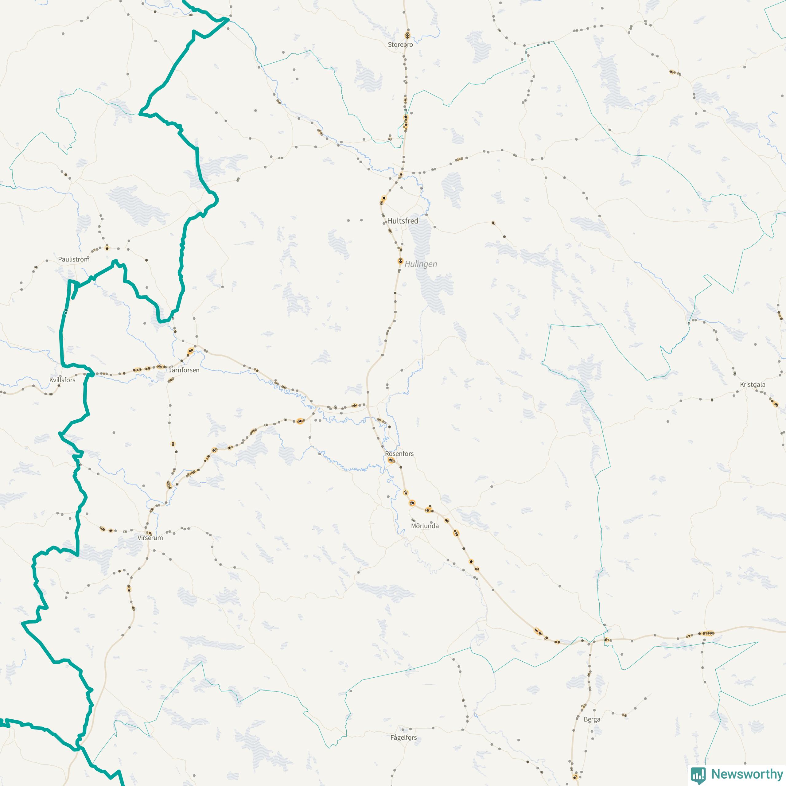 Flest olyckor i kommunen – 131 stycken – har skett längs väg 23 (då räknar vi in 50 olyckor där väg 23 har gemensam sträckning med väg 34 och elva olyckor där väg 23 har gemensam sträckning med väg 47). Av dessa orsakades 81 av rådjur. Längs väg 47 har 109 viltolyckor rapporterats under motsvarande period.