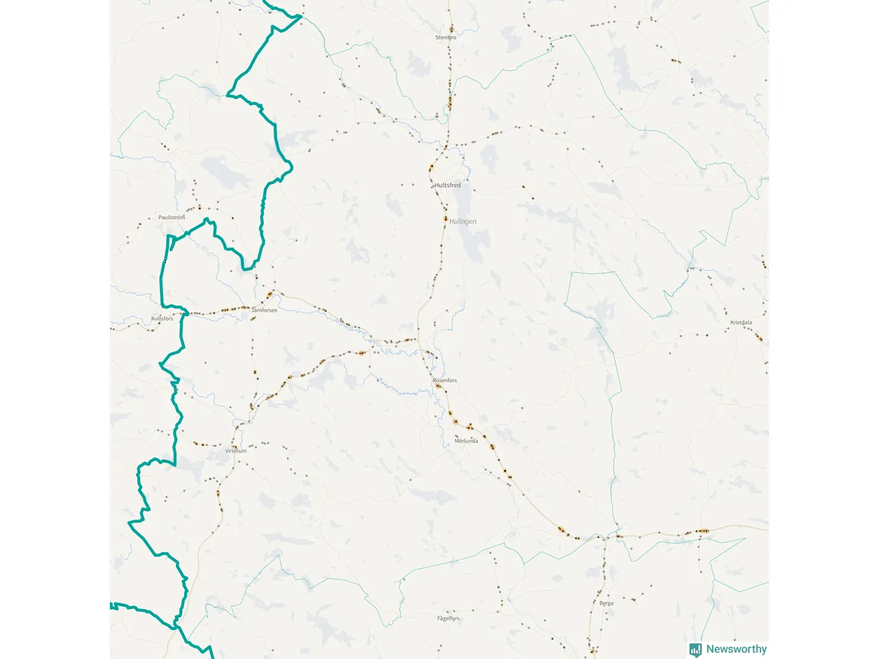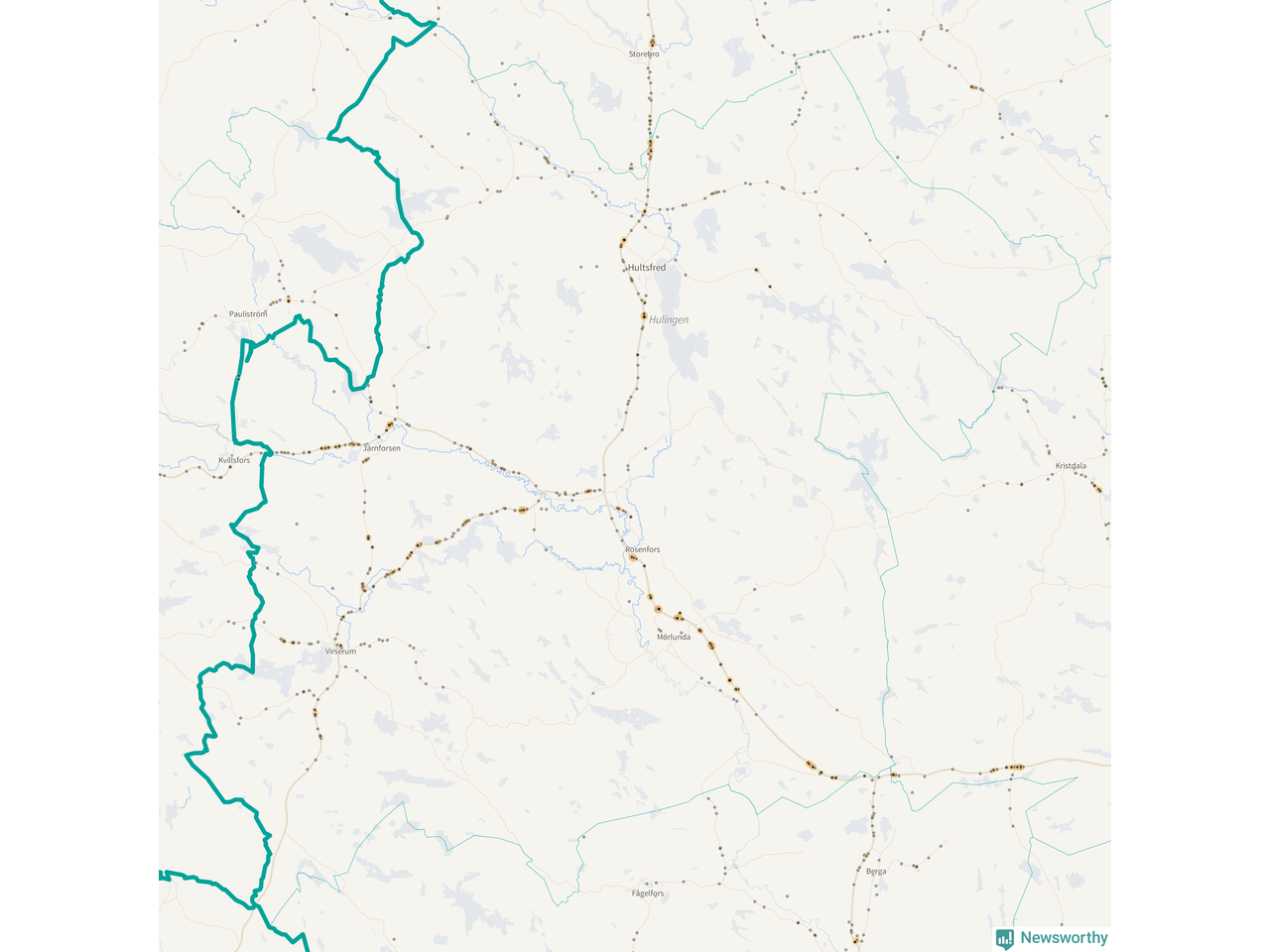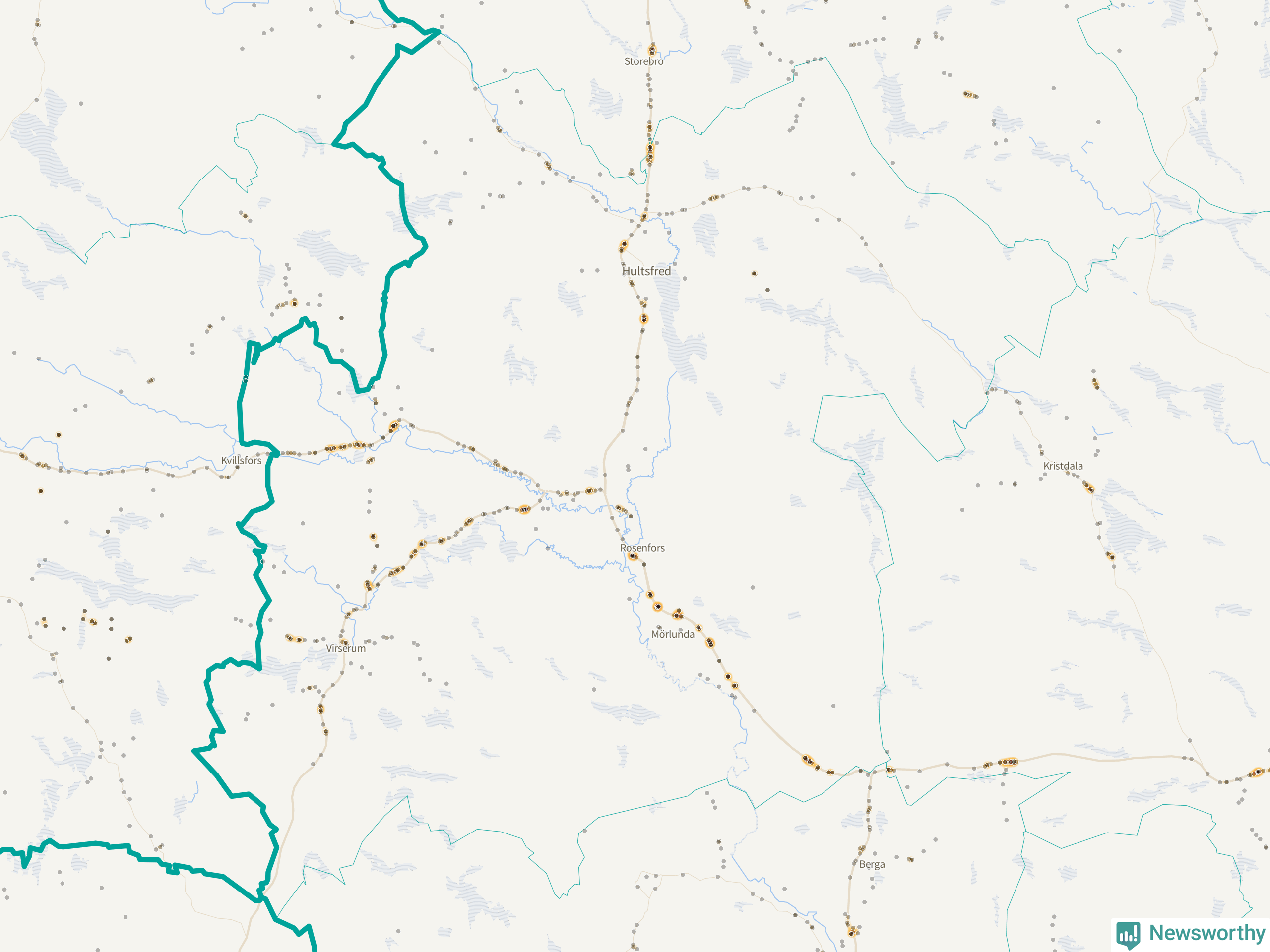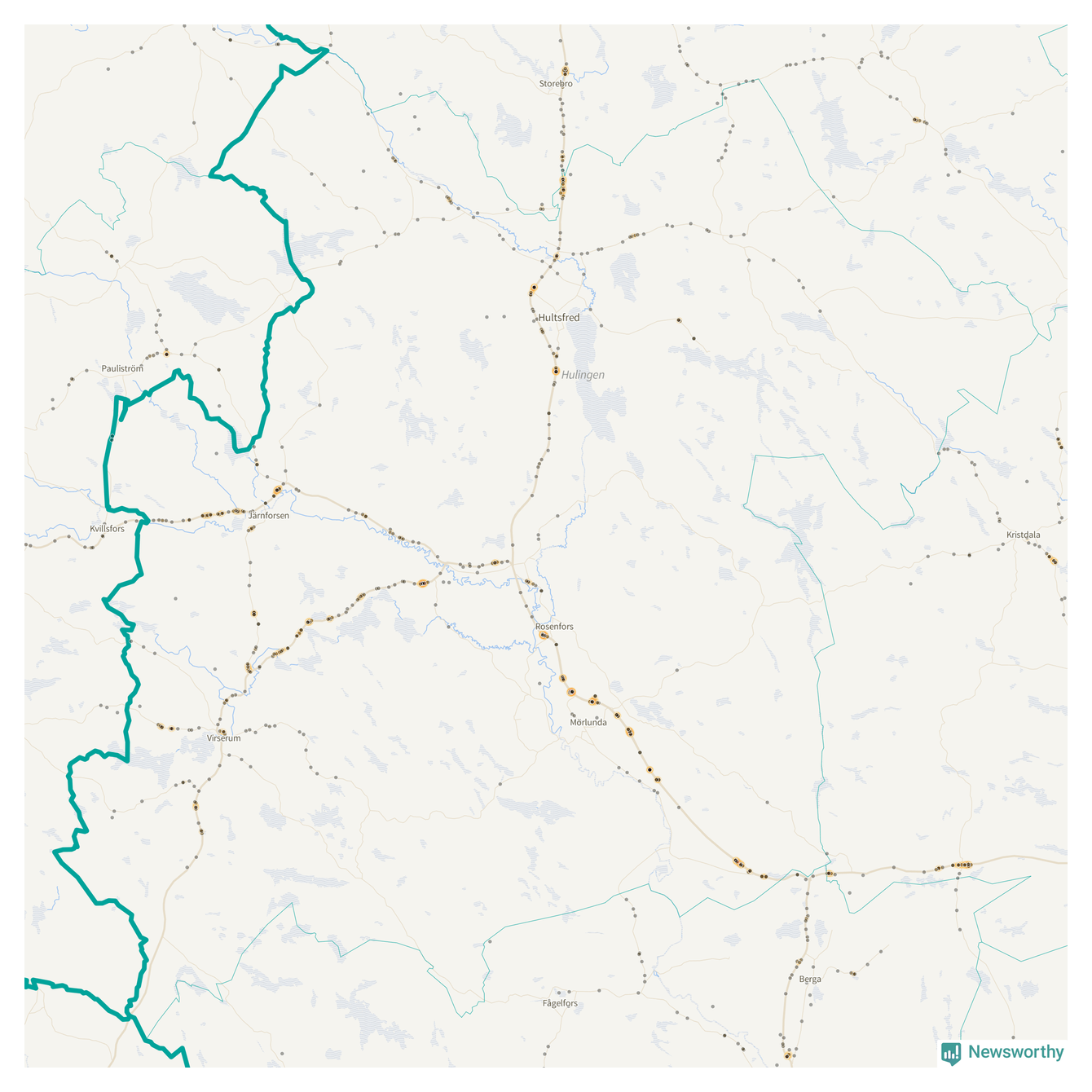 Flest olyckor i kommunen – 131 stycken – har skett längs väg 23 (då räknar vi in 50 olyckor där väg 23 har gemensam sträckning med väg 34 och elva olyckor där väg 23 har gemensam sträckning med väg 47). Av dessa orsakades 81 av rådjur. Längs väg 47 har 109 viltolyckor rapporterats under motsvarande period.