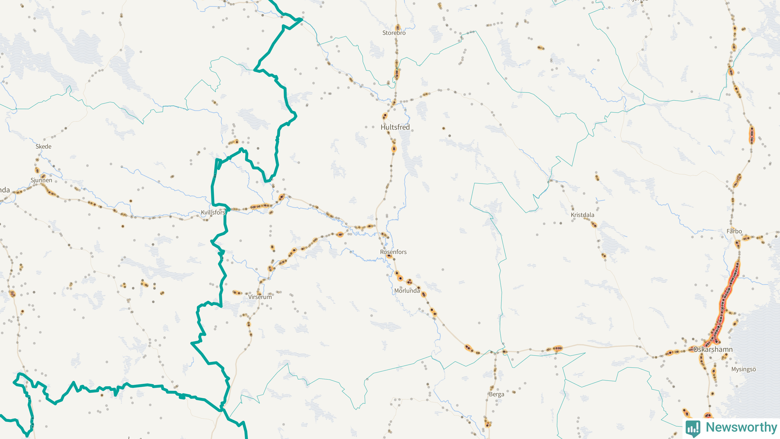 Den mest olycksdrabbade vägen i Kalmar län är E22 (inklusive väg 758/E22), med totalt 872 rapporterade viltolyckor i länet under femårsperioden. Flest olyckor längs E22 – 320 stycken – skedde i Västerviks kommun. Västervik är också den kommun med flest registrerade viltolyckor i länet totalt, 1 143 stycken under perioden september–november 2020–2024.
