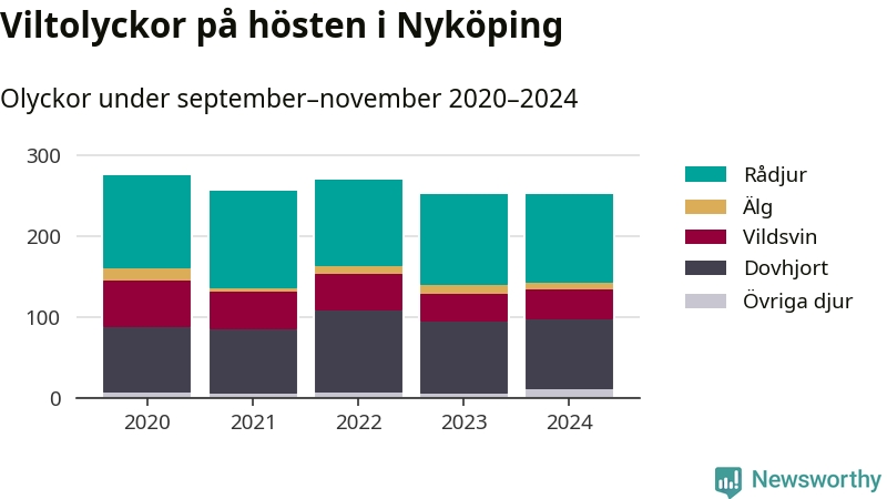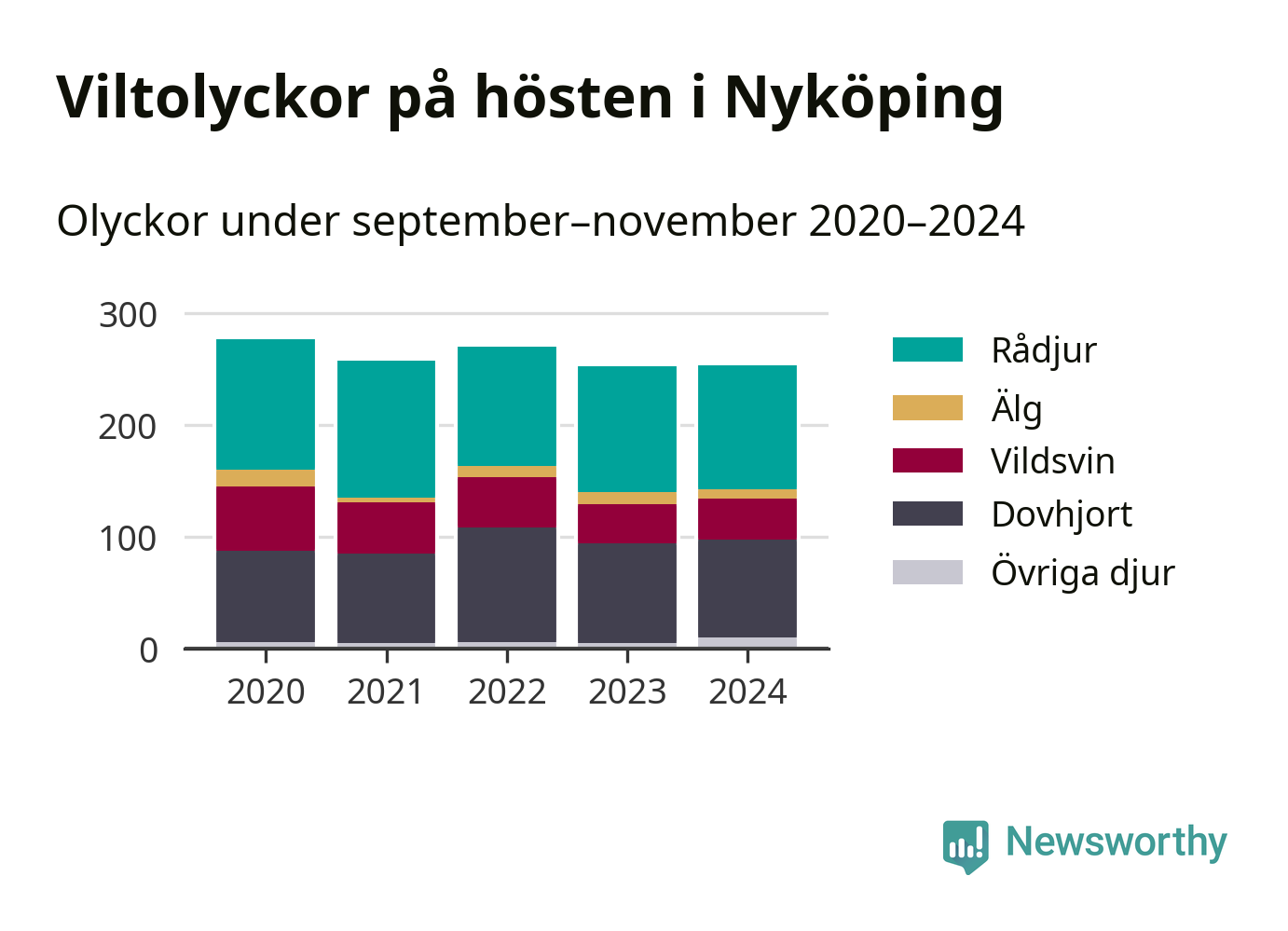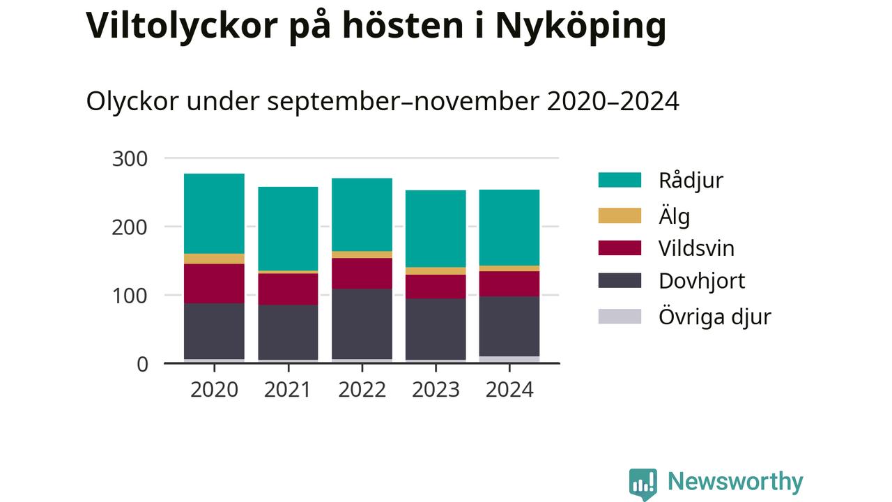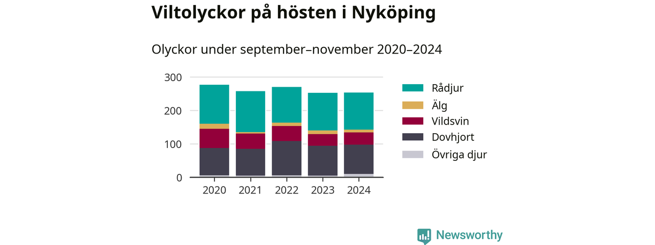 Under de senaste höstarna har antalet viltolyckor ökat i Sverige. Den höst med flest viltolyckor i Nyköping hittills under 2020-talet var 2020, 276 olyckor. I fjol höst rapporterades totalt 253 olyckor.