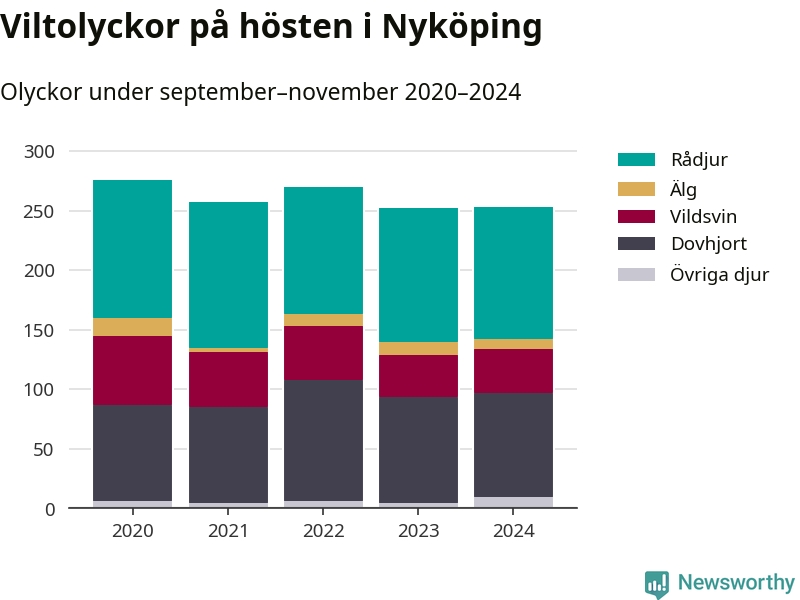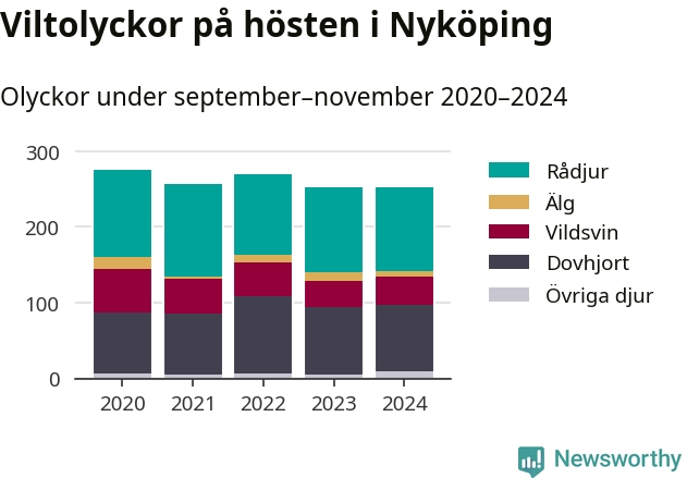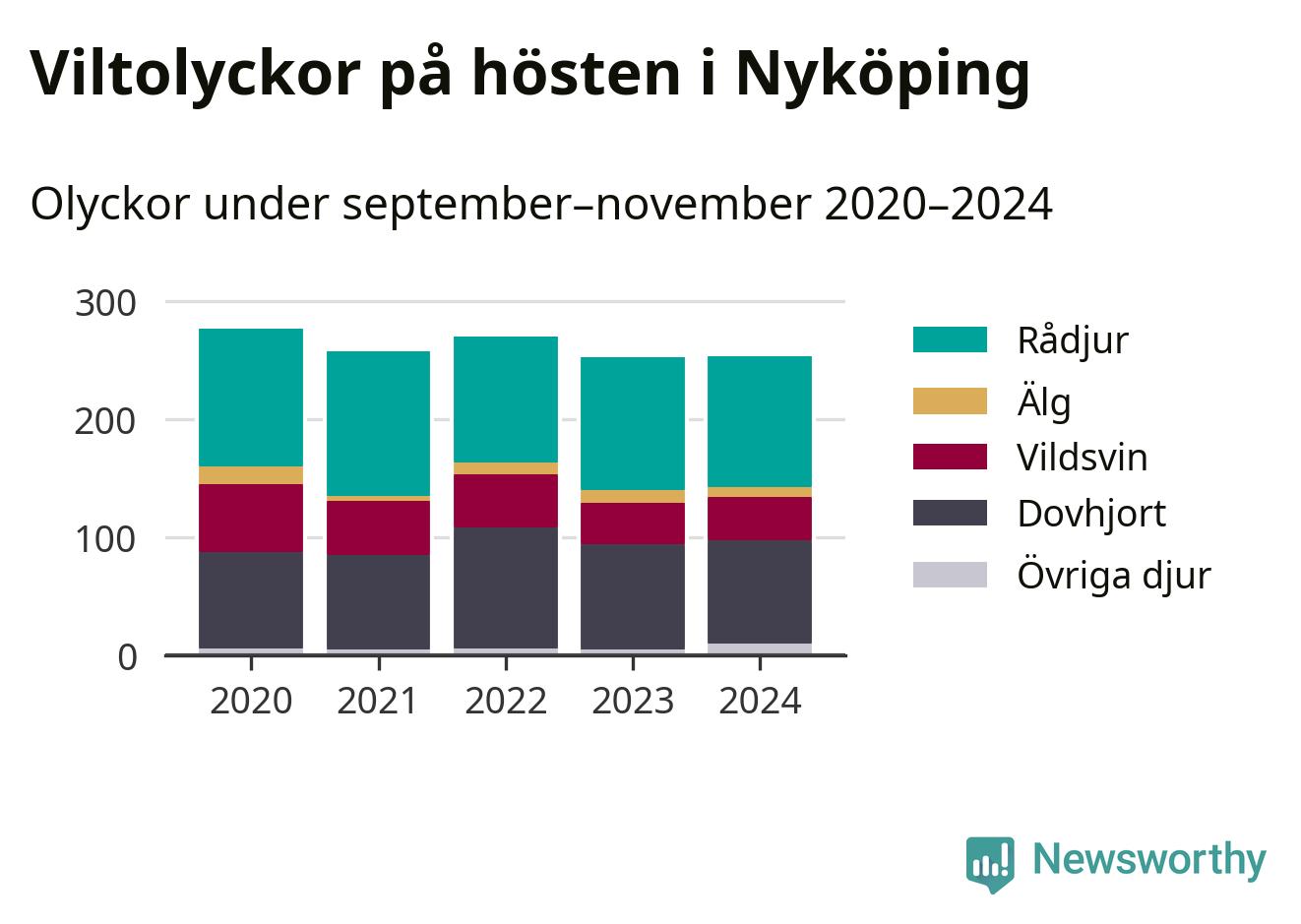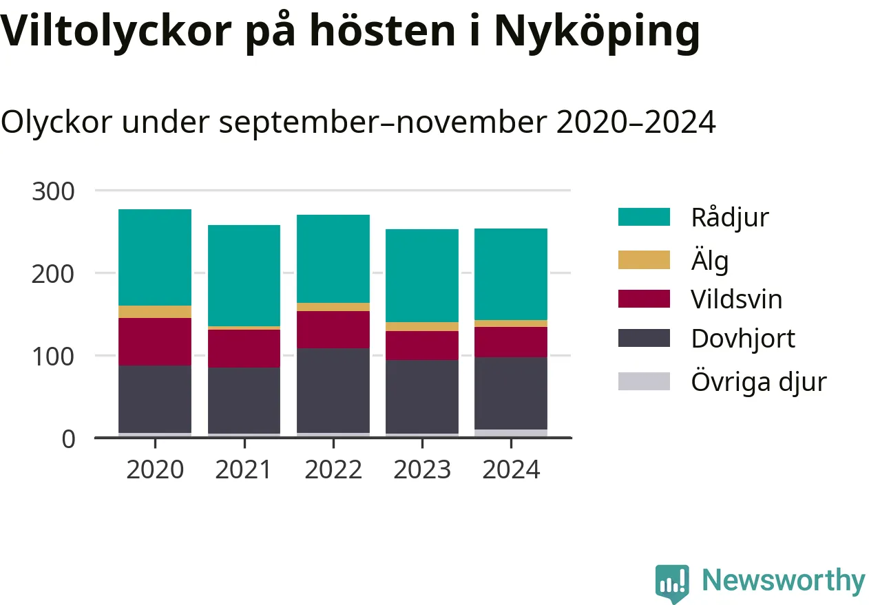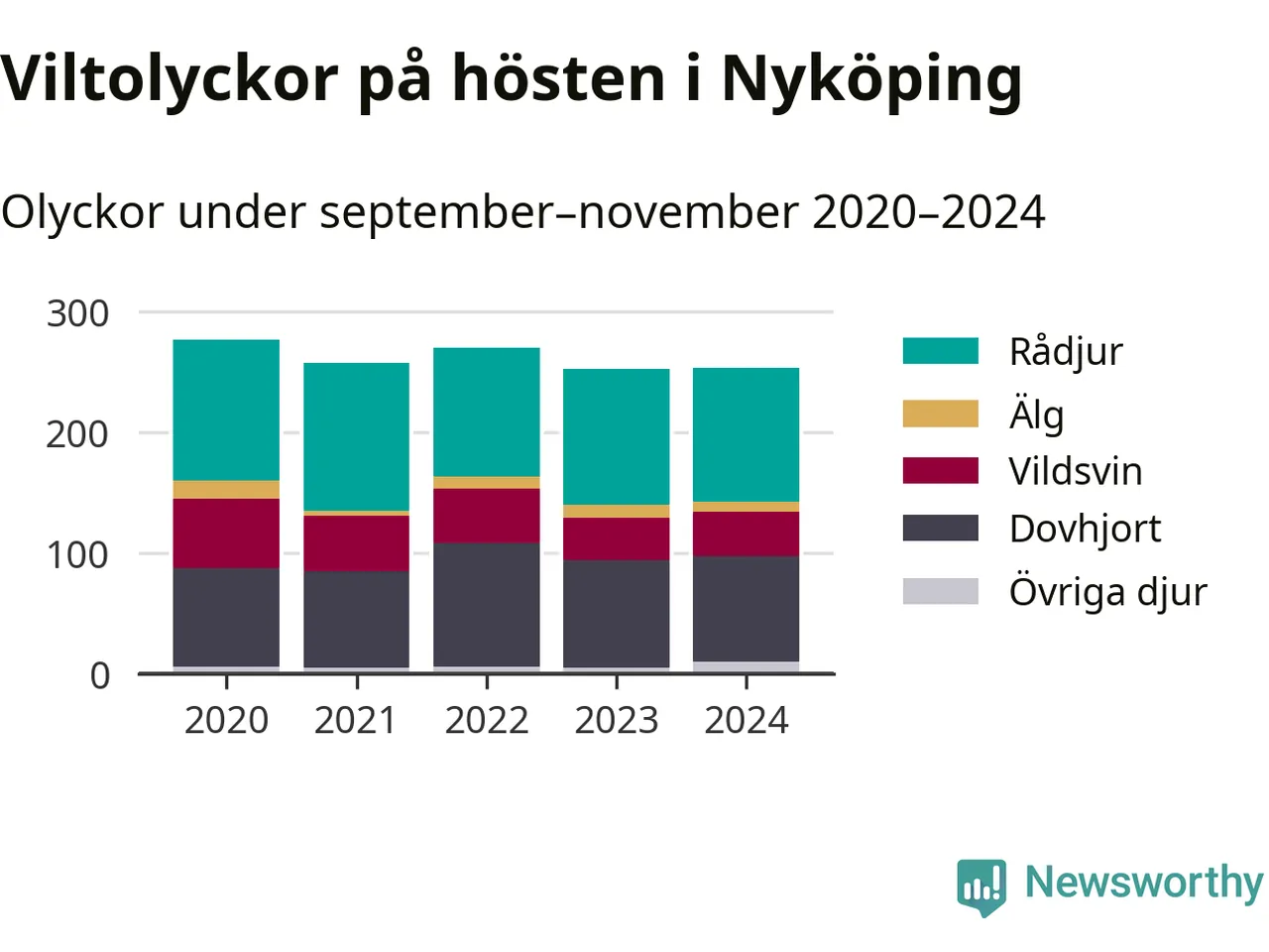 Under de senaste höstarna har antalet viltolyckor ökat i Sverige. Den höst med flest viltolyckor i Nyköping hittills under 2020-talet var 2020, 276 olyckor. I fjol höst rapporterades totalt 253 olyckor.