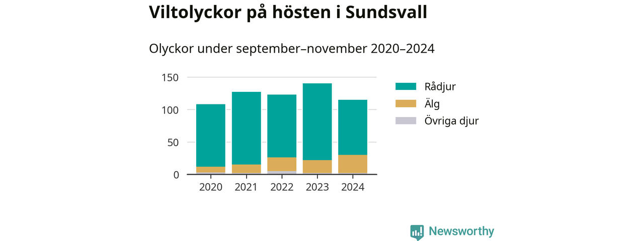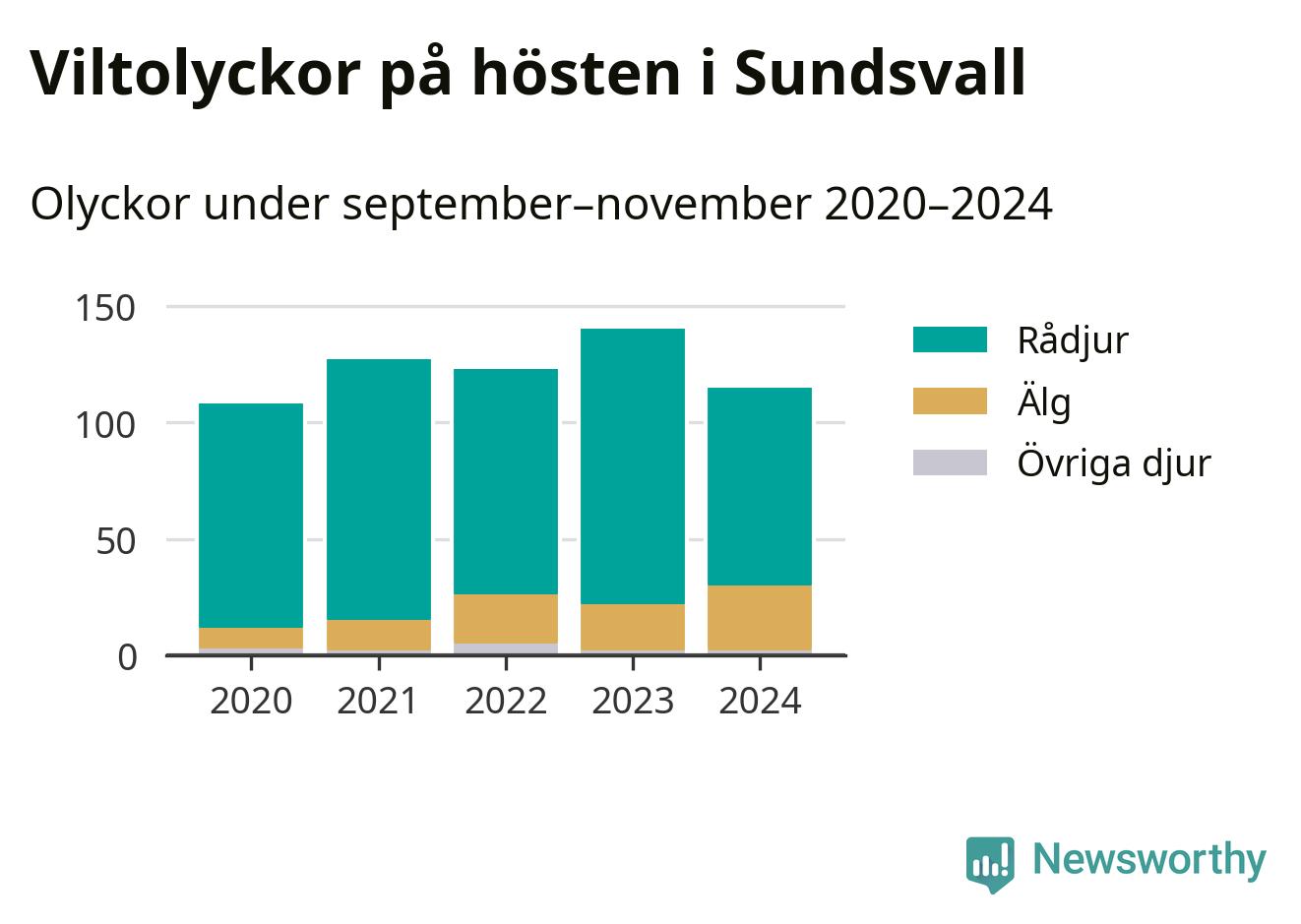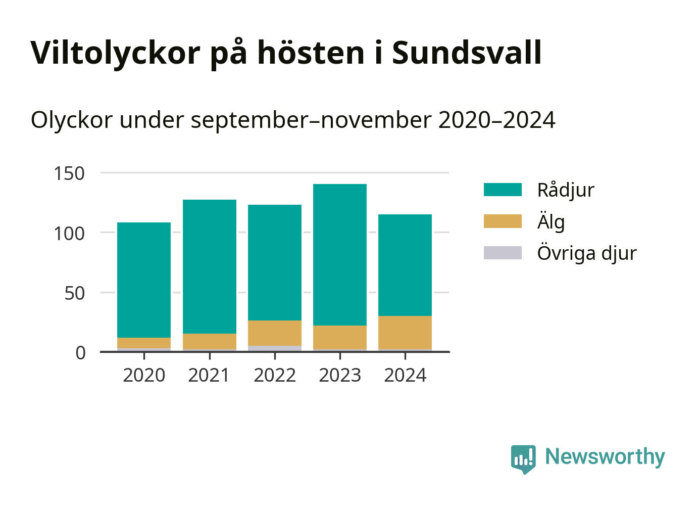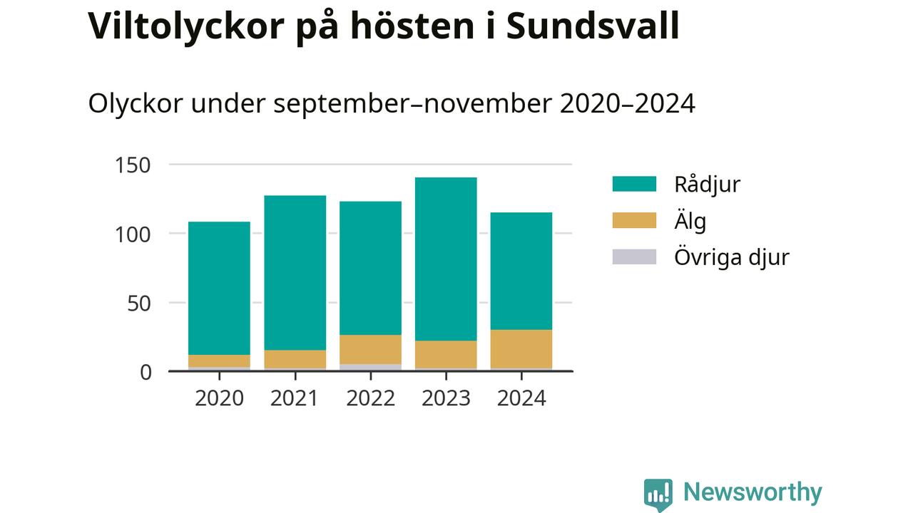 Under de senaste höstarna har antalet viltolyckor ökat i Sverige. Den höst med flest viltolyckor i Sundsvall hittills under 2020-talet var 2023, 140 olyckor. I fjol höst rapporterades totalt 115 olyckor.