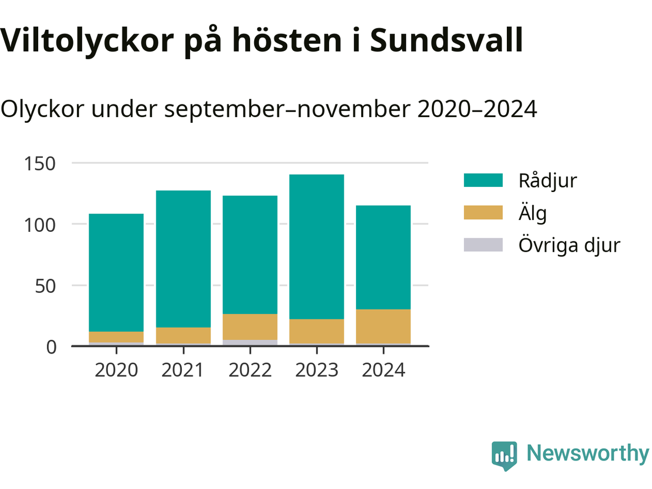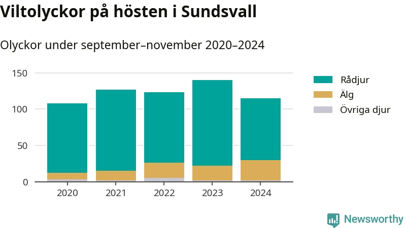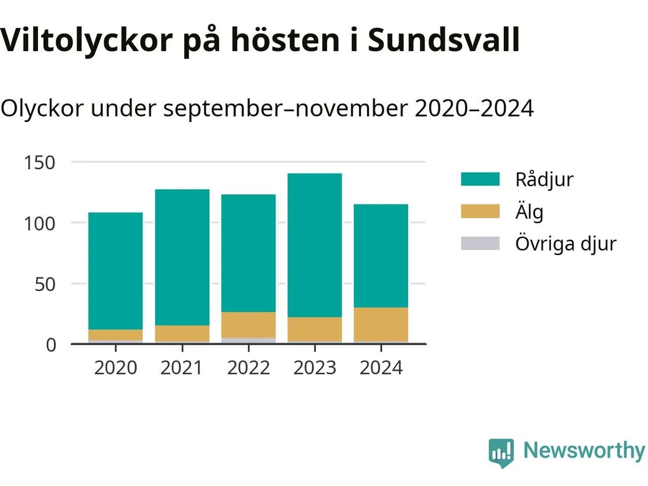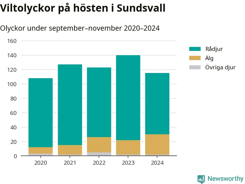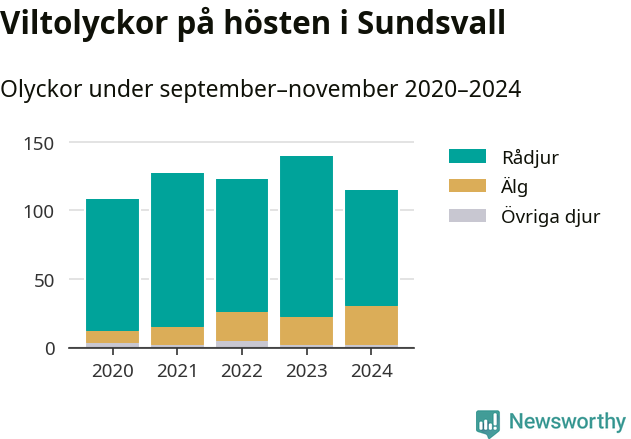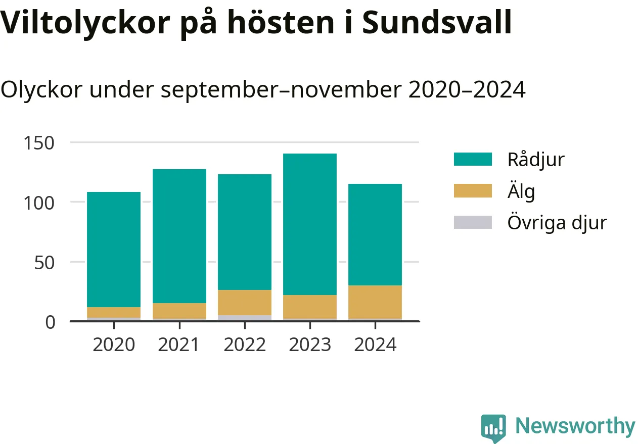 Under de senaste höstarna har antalet viltolyckor ökat i Sverige. Den höst med flest viltolyckor i Sundsvall hittills under 2020-talet var 2023, 140 olyckor. I fjol höst rapporterades totalt 115 olyckor.