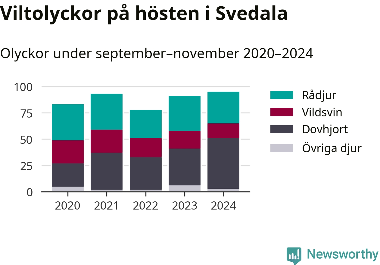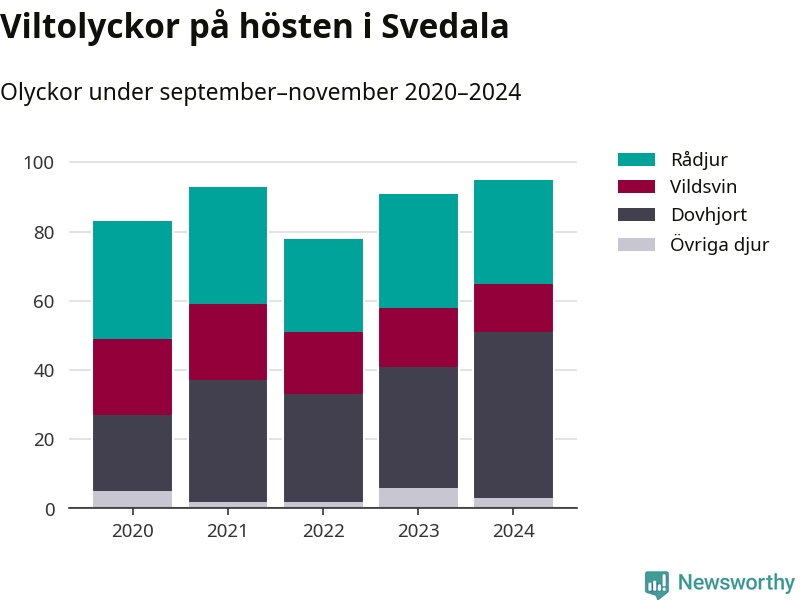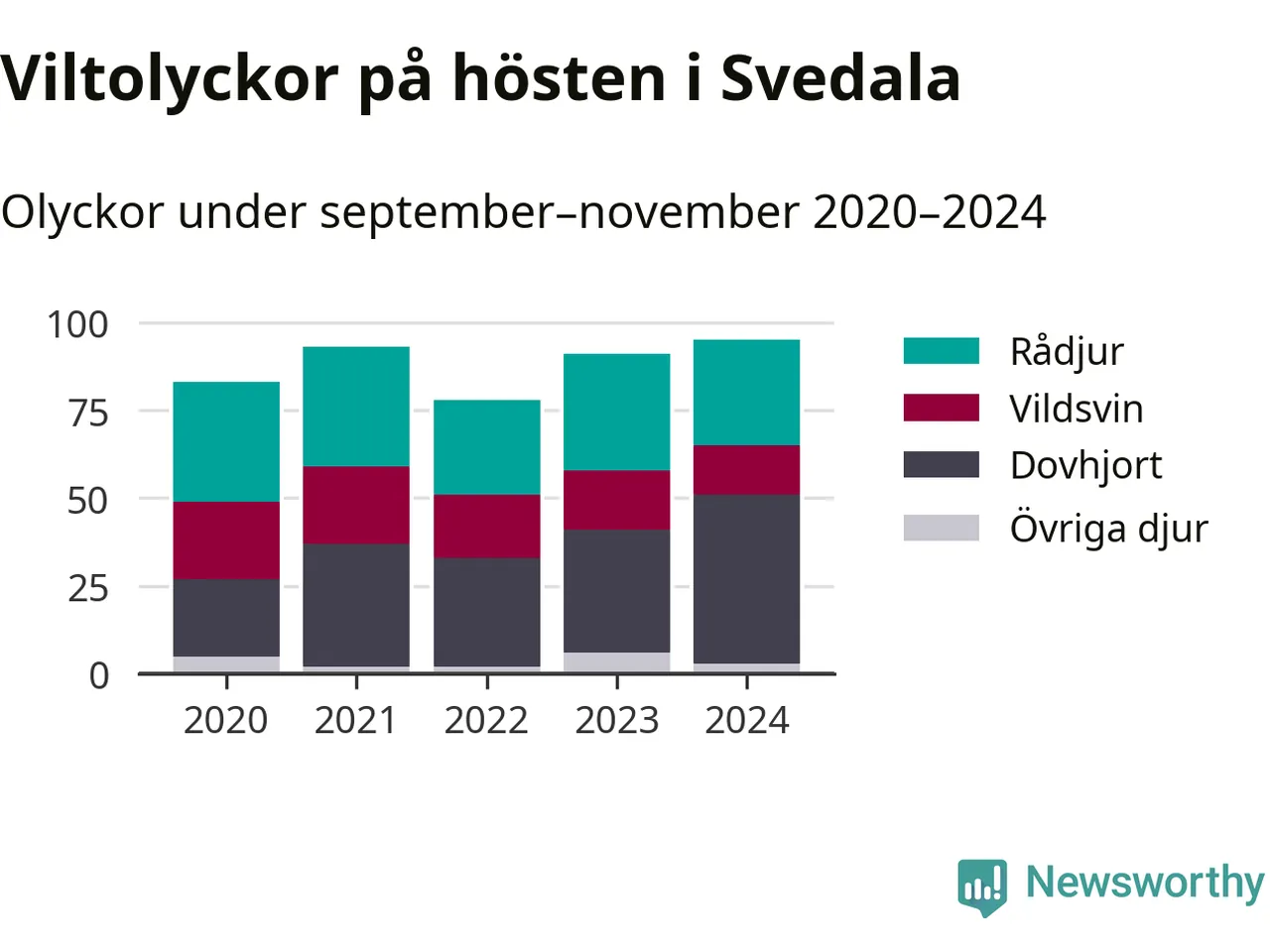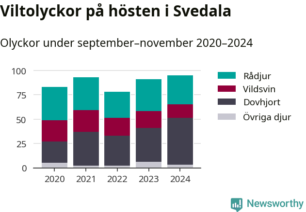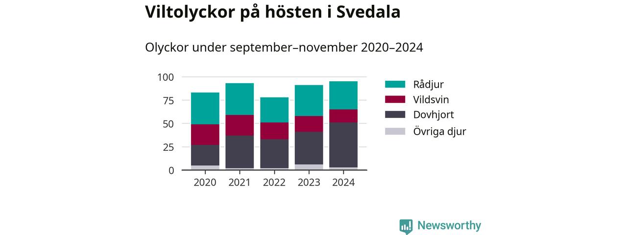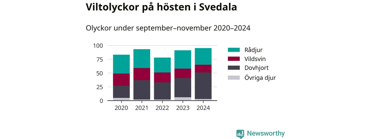 Viltolyckor i Svedala 2020–2024 uppdelat på viltslag