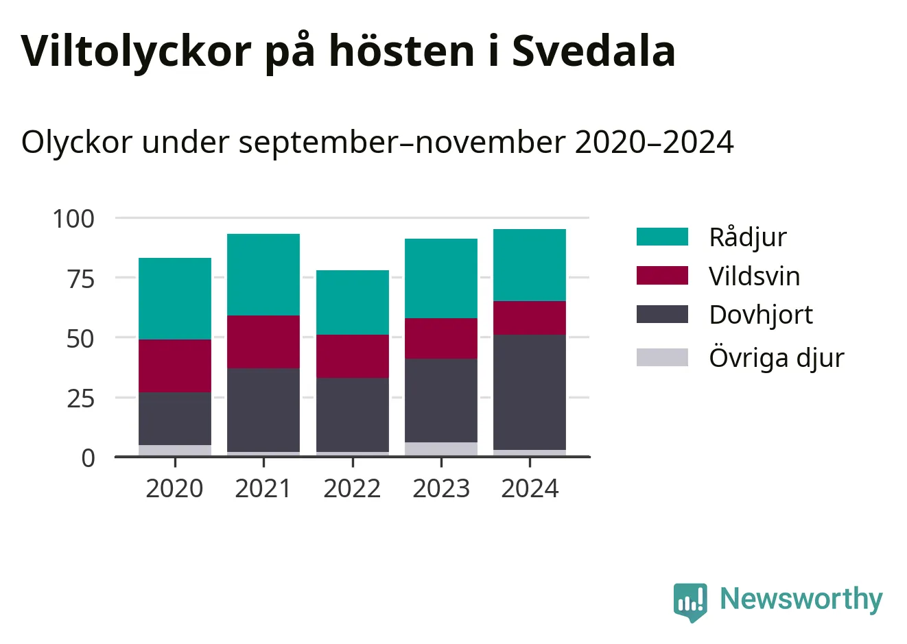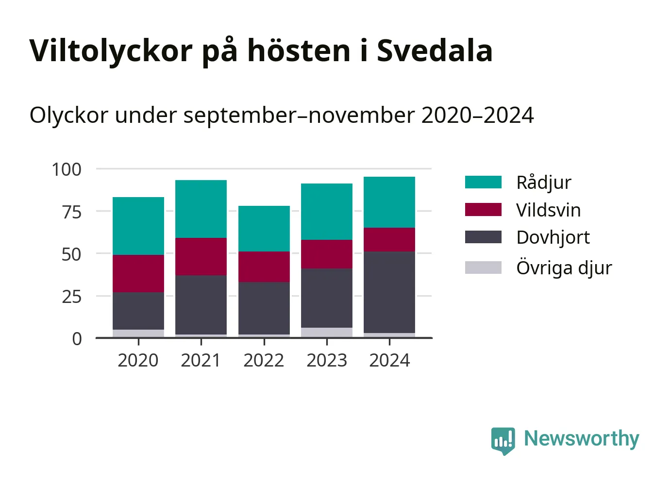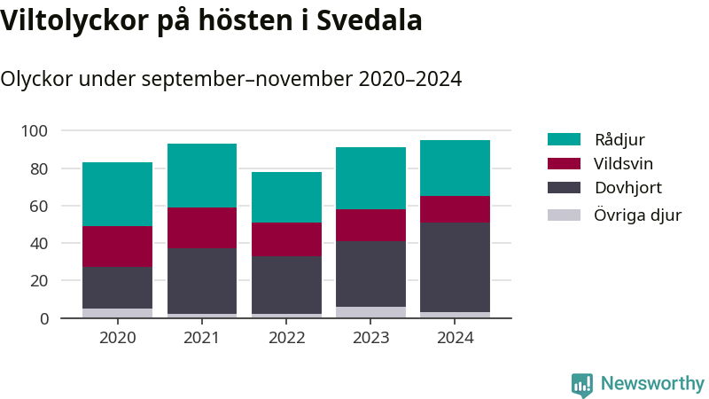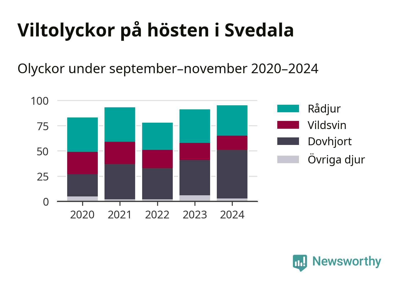 Viltolyckor i Svedala 2020–2024 uppdelat på viltslag