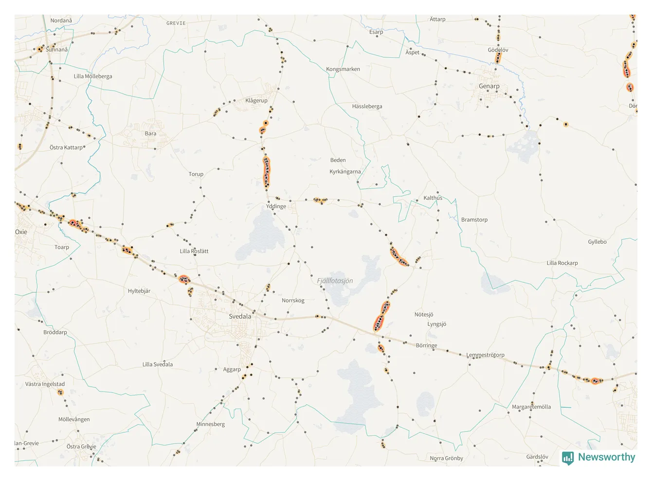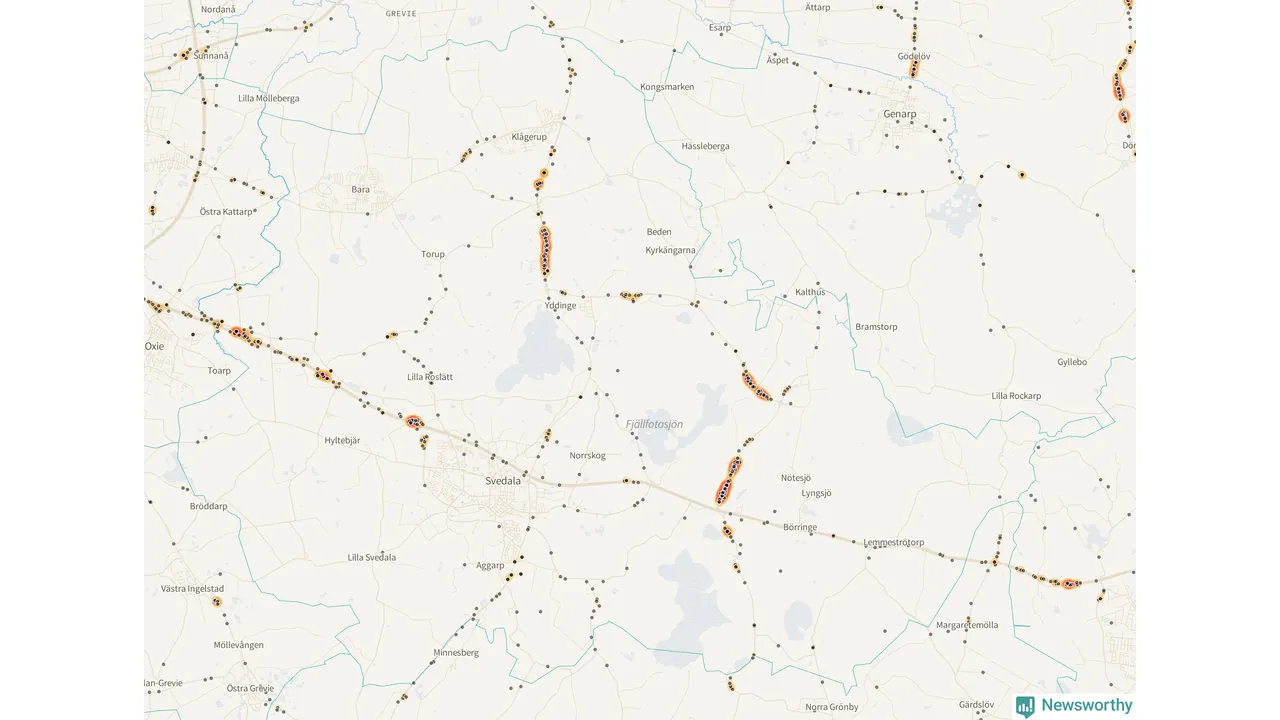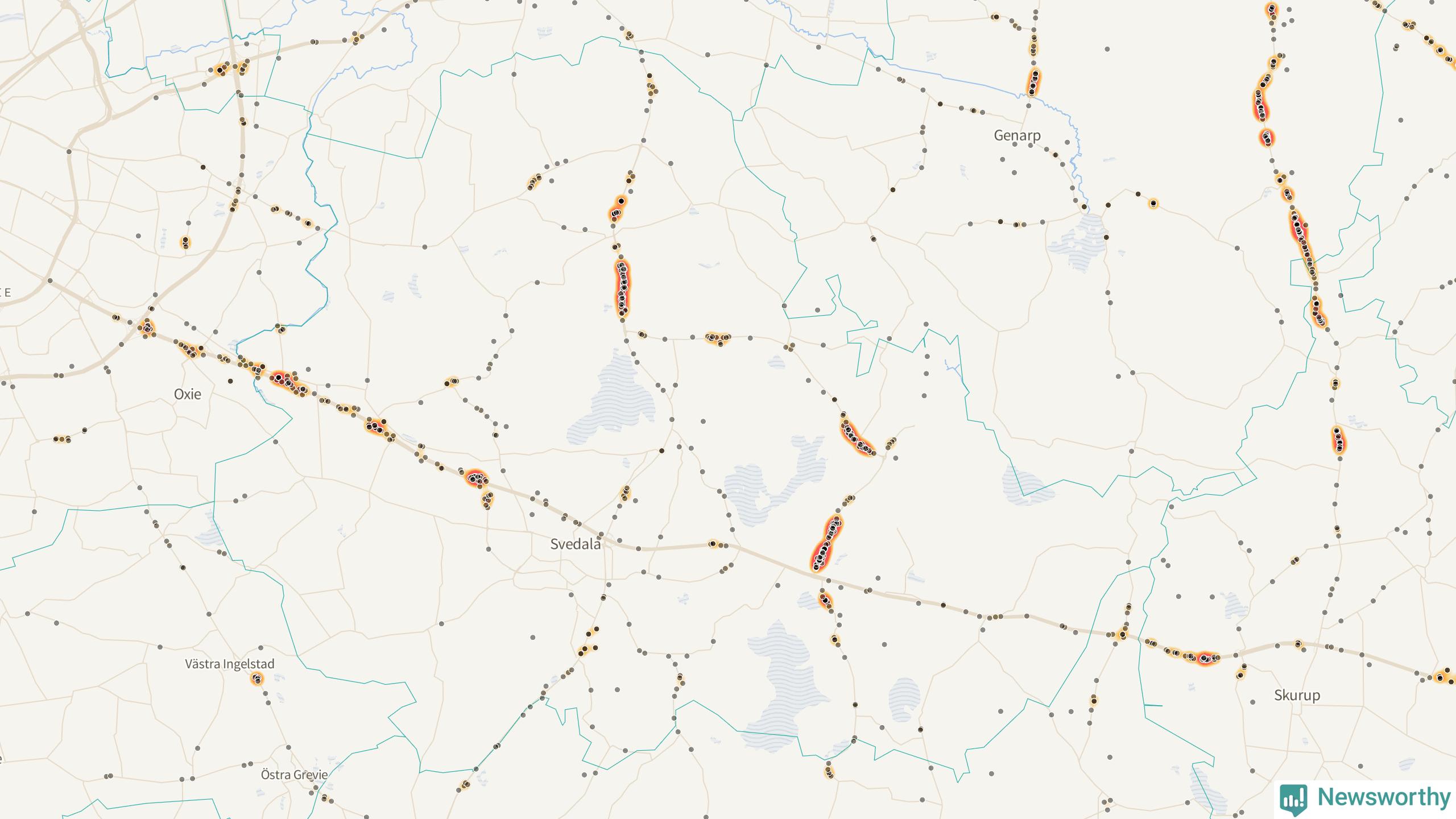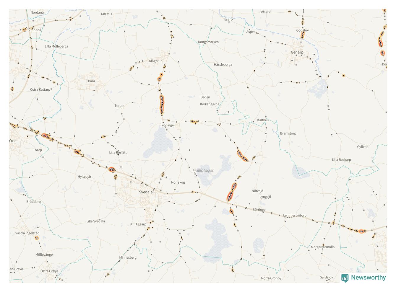 De mest viltolycksdrabbade vägarna i Svedala 2020–2024