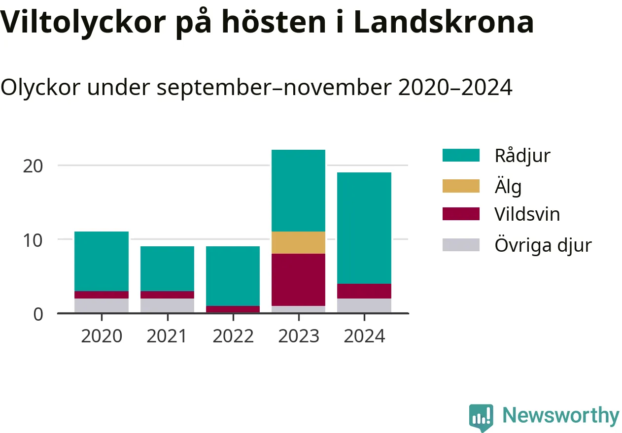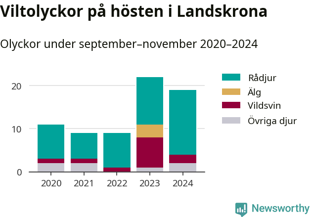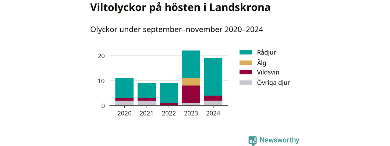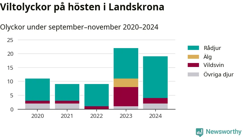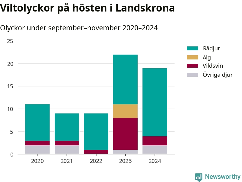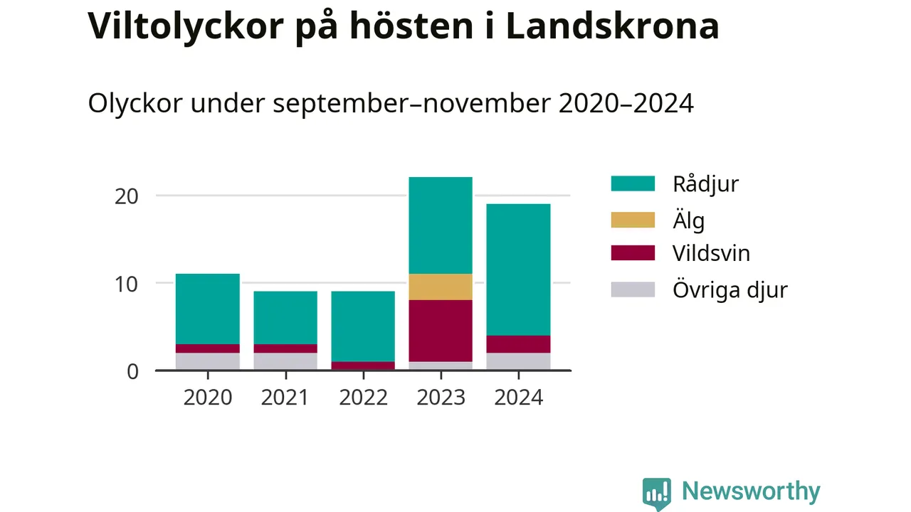 Under de senaste höstarna har antalet viltolyckor ökat i Sverige. Den höst med flest viltolyckor i Landskrona hittills under 2020-talet var 2023, 22 olyckor. I fjol höst rapporterades totalt 19 olyckor.