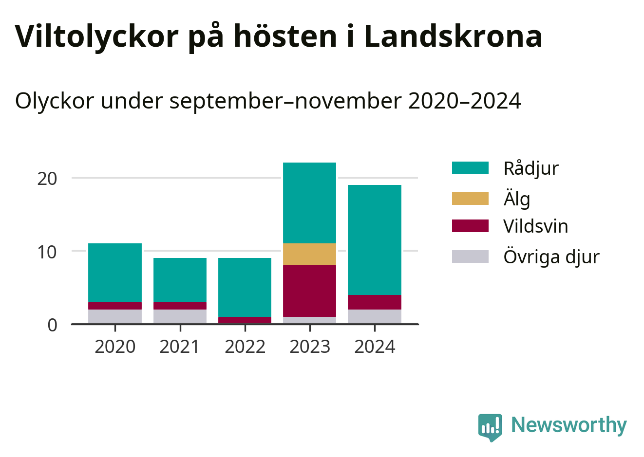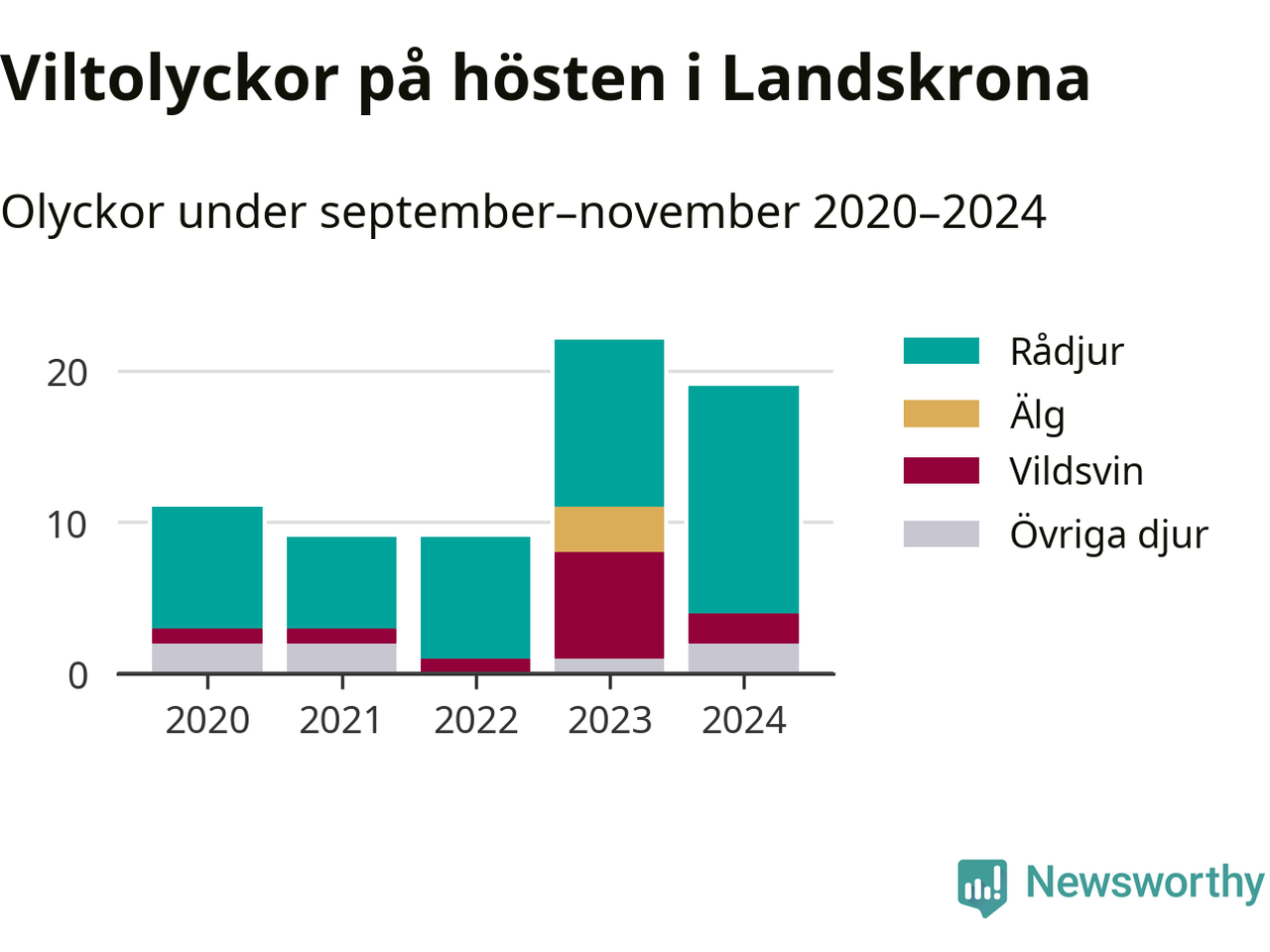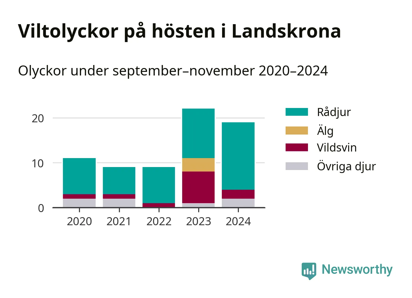 Under de senaste höstarna har antalet viltolyckor ökat i Sverige. Den höst med flest viltolyckor i Landskrona hittills under 2020-talet var 2023, 22 olyckor. I fjol höst rapporterades totalt 19 olyckor.