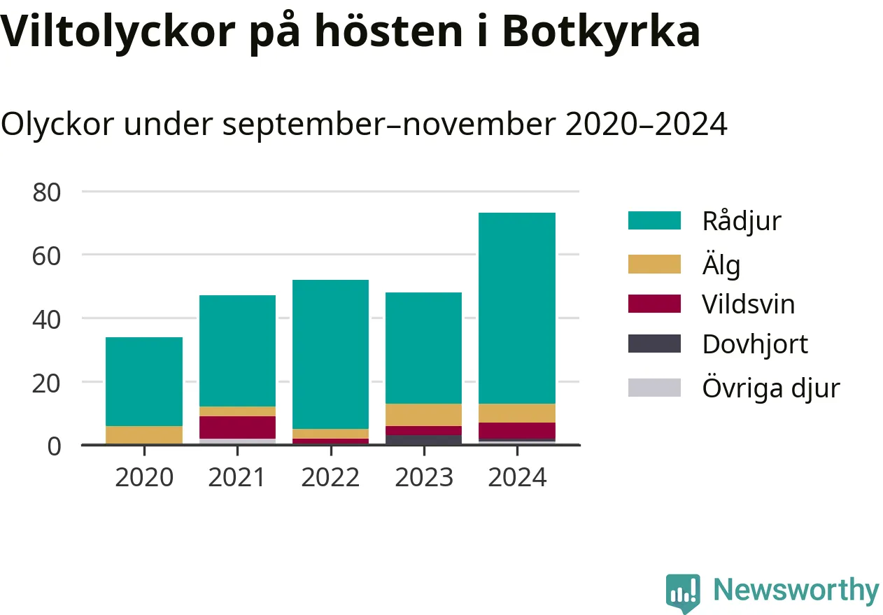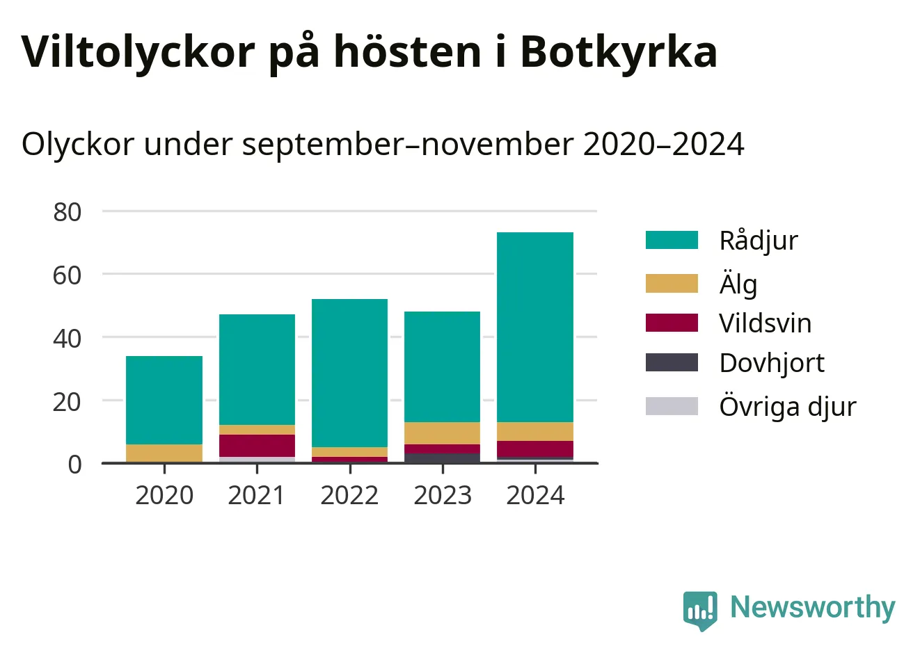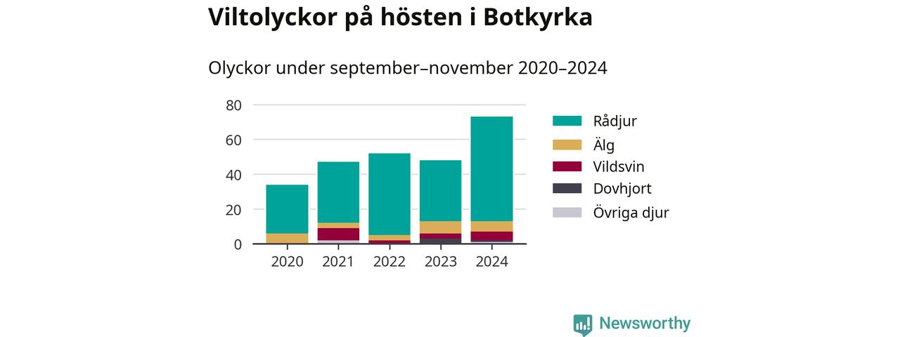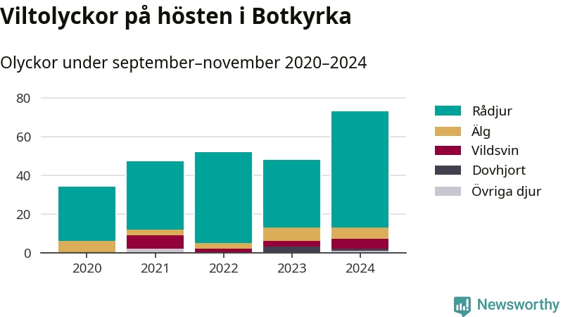Viltolyckor i Botkyrka 2020–2024 uppdelat på viltslag
