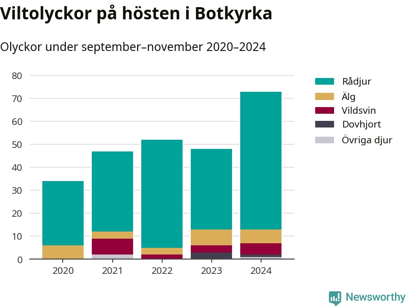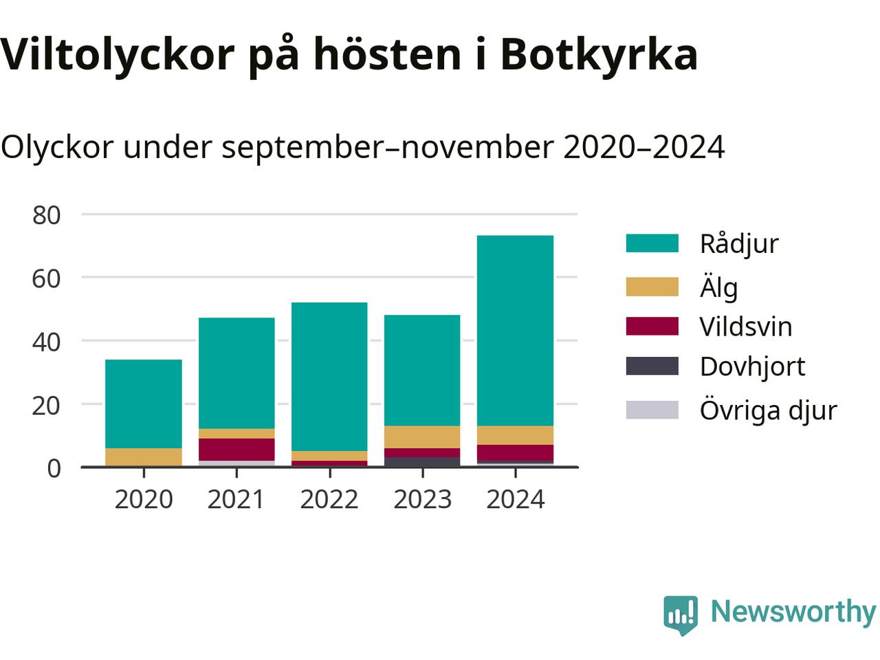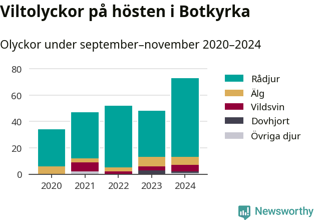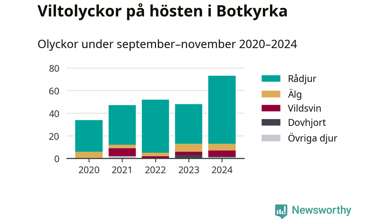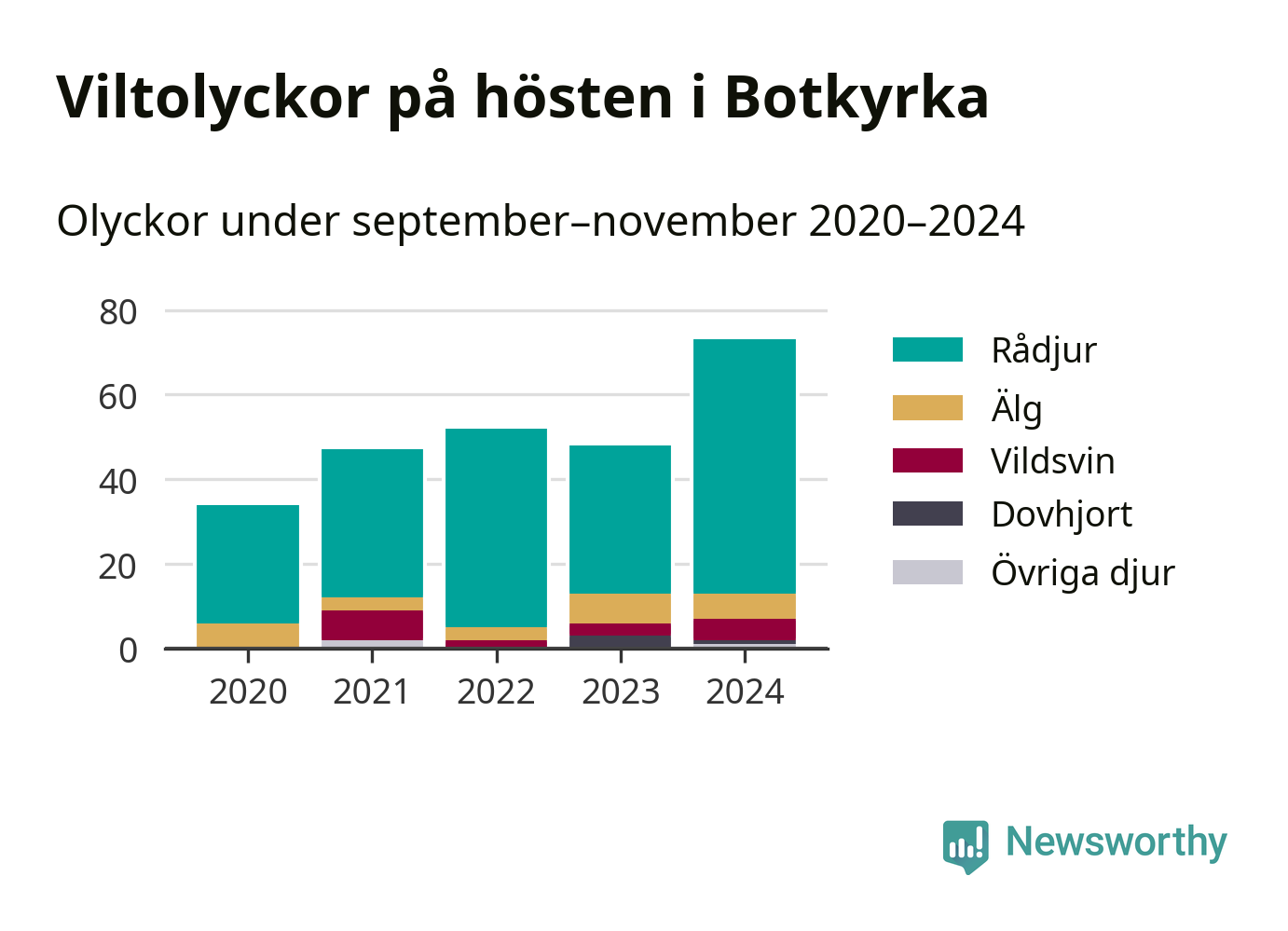 Viltolyckor i Botkyrka 2020–2024 uppdelat på viltslag