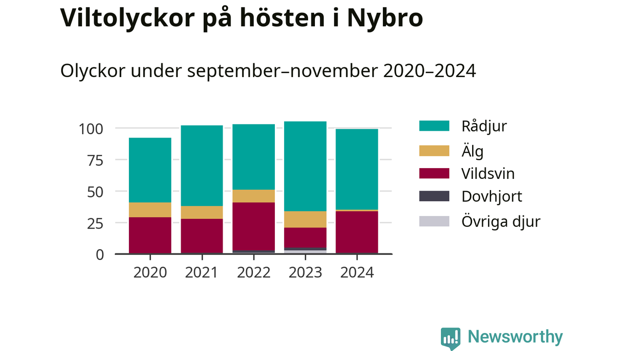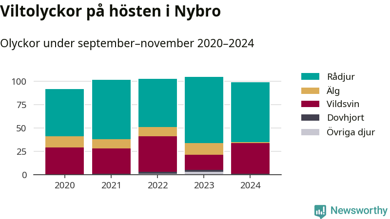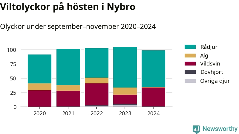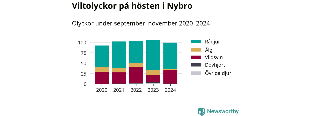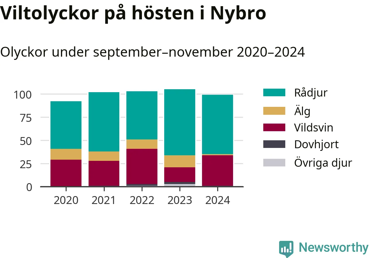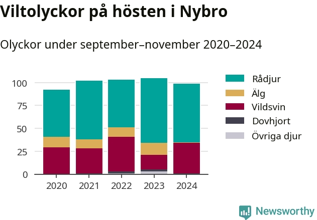 Under de senaste höstarna har antalet viltolyckor ökat i Sverige. Den höst med flest viltolyckor i Nybro hittills under 2020-talet var 2023, 105 olyckor. I fjol höst rapporterades totalt 99 olyckor.
