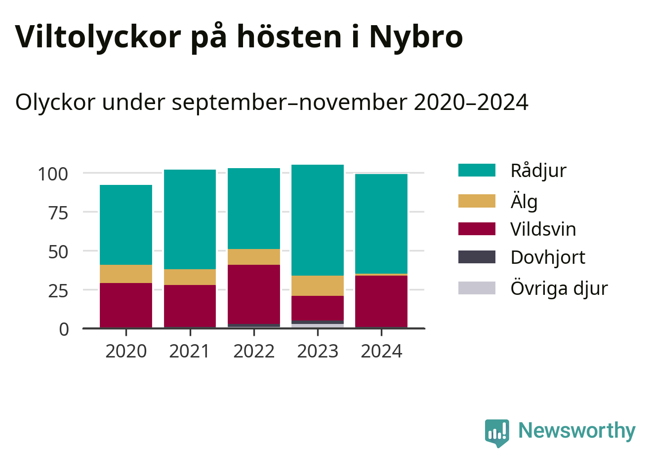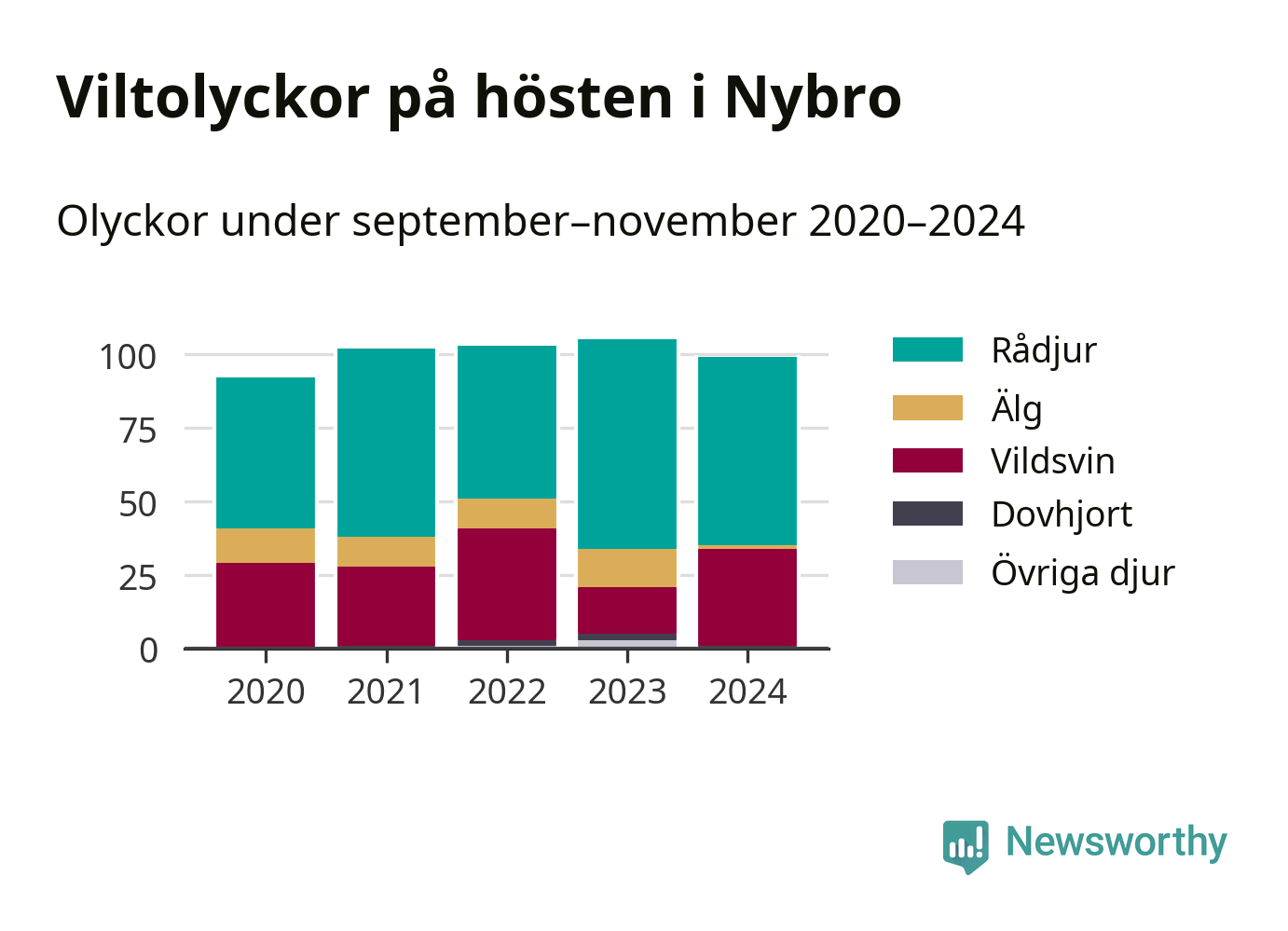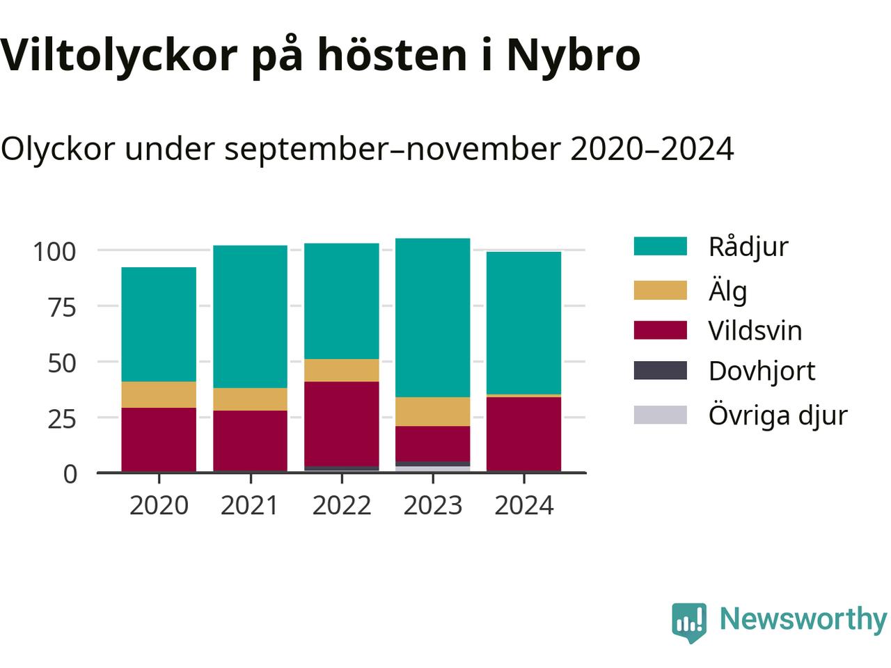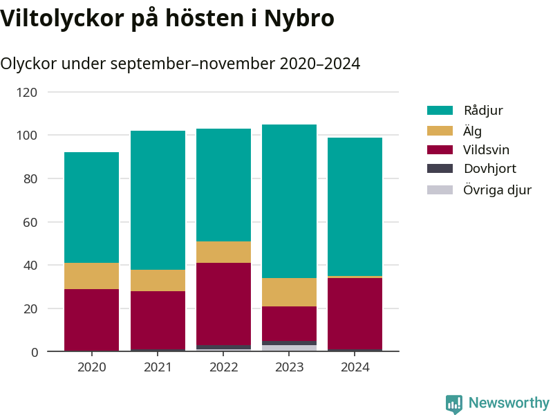 Under de senaste höstarna har antalet viltolyckor ökat i Sverige. Den höst med flest viltolyckor i Nybro hittills under 2020-talet var 2023, 105 olyckor. I fjol höst rapporterades totalt 99 olyckor.