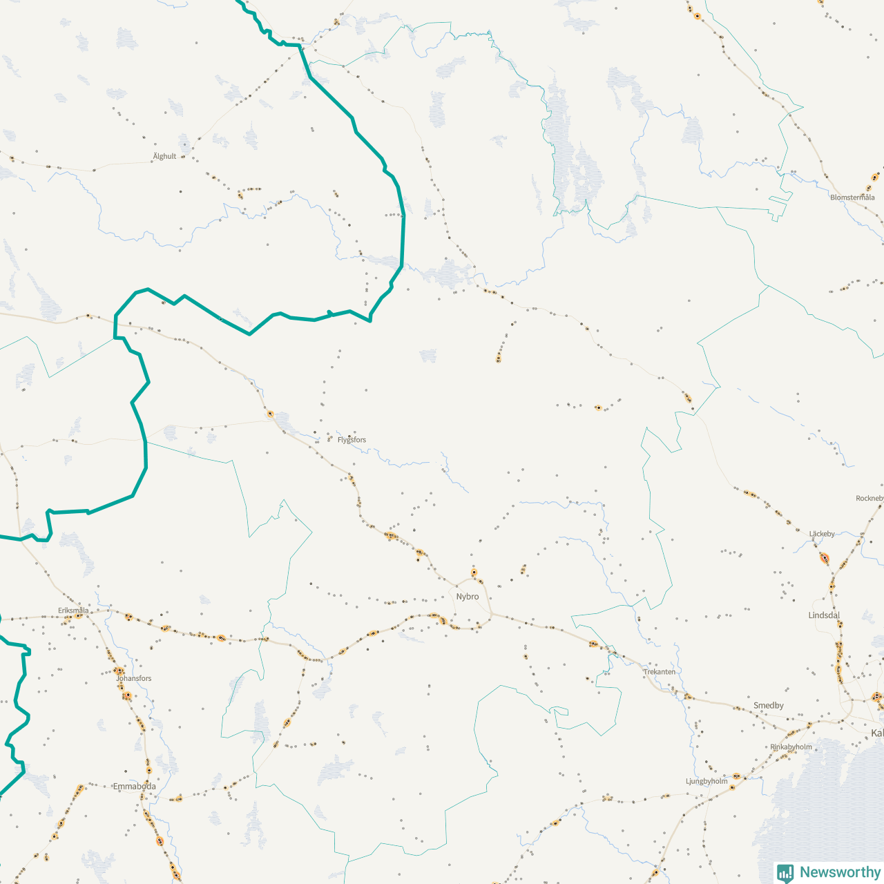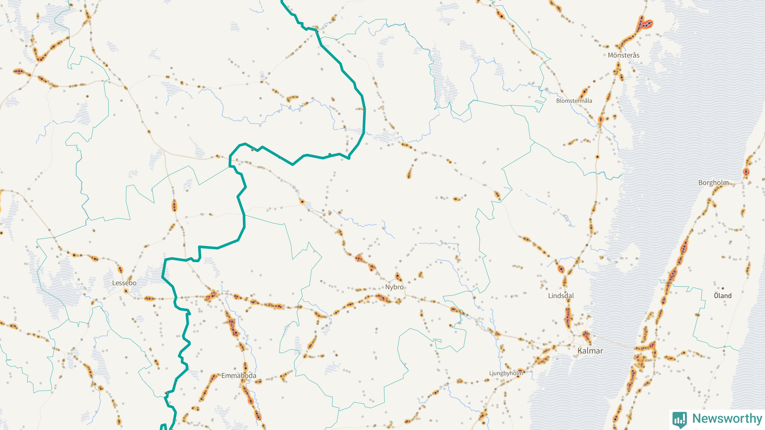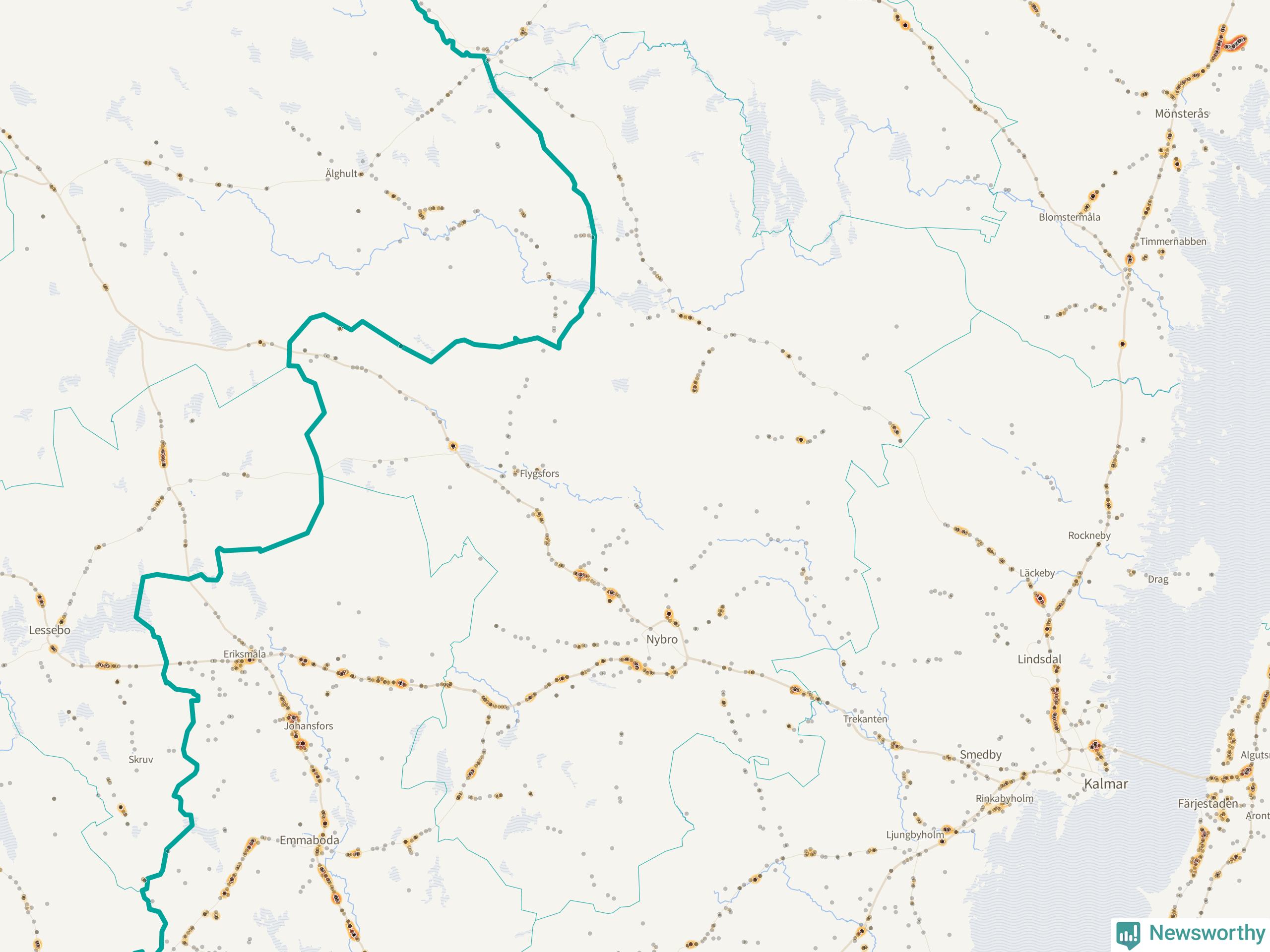 Den mest olycksdrabbade vägen i Kalmar län är E22 (inklusive väg 758/E22), med totalt 872 rapporterade viltolyckor i länet under femårsperioden. Flest olyckor längs E22 – 320 stycken – skedde i Västerviks kommun. Västervik är också den kommun med flest registrerade viltolyckor i länet totalt, 1 143 stycken under perioden september–november 2020–2024.