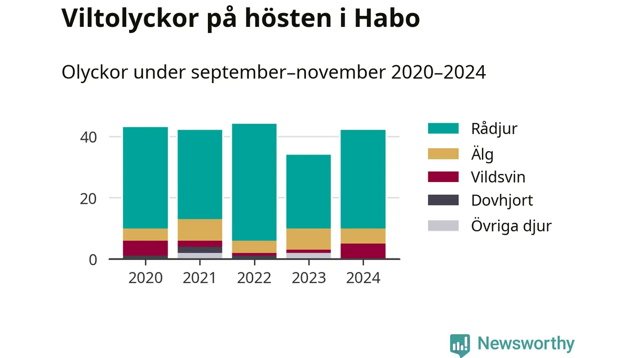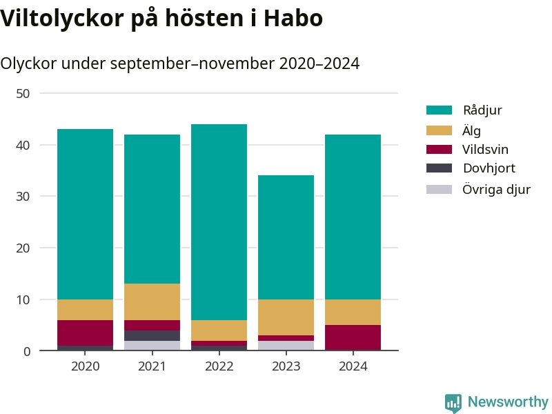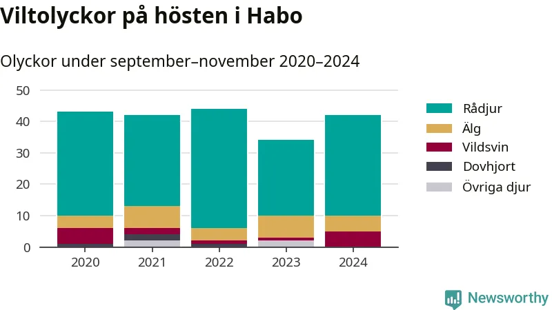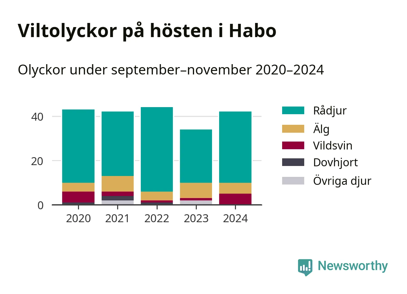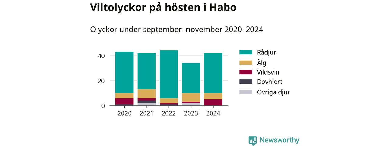 Under de senaste höstarna har antalet viltolyckor ökat i Sverige. Den höst med flest viltolyckor i Habo hittills under 2020-talet var 2022, 44 olyckor. I fjol höst rapporterades totalt 42 olyckor.
