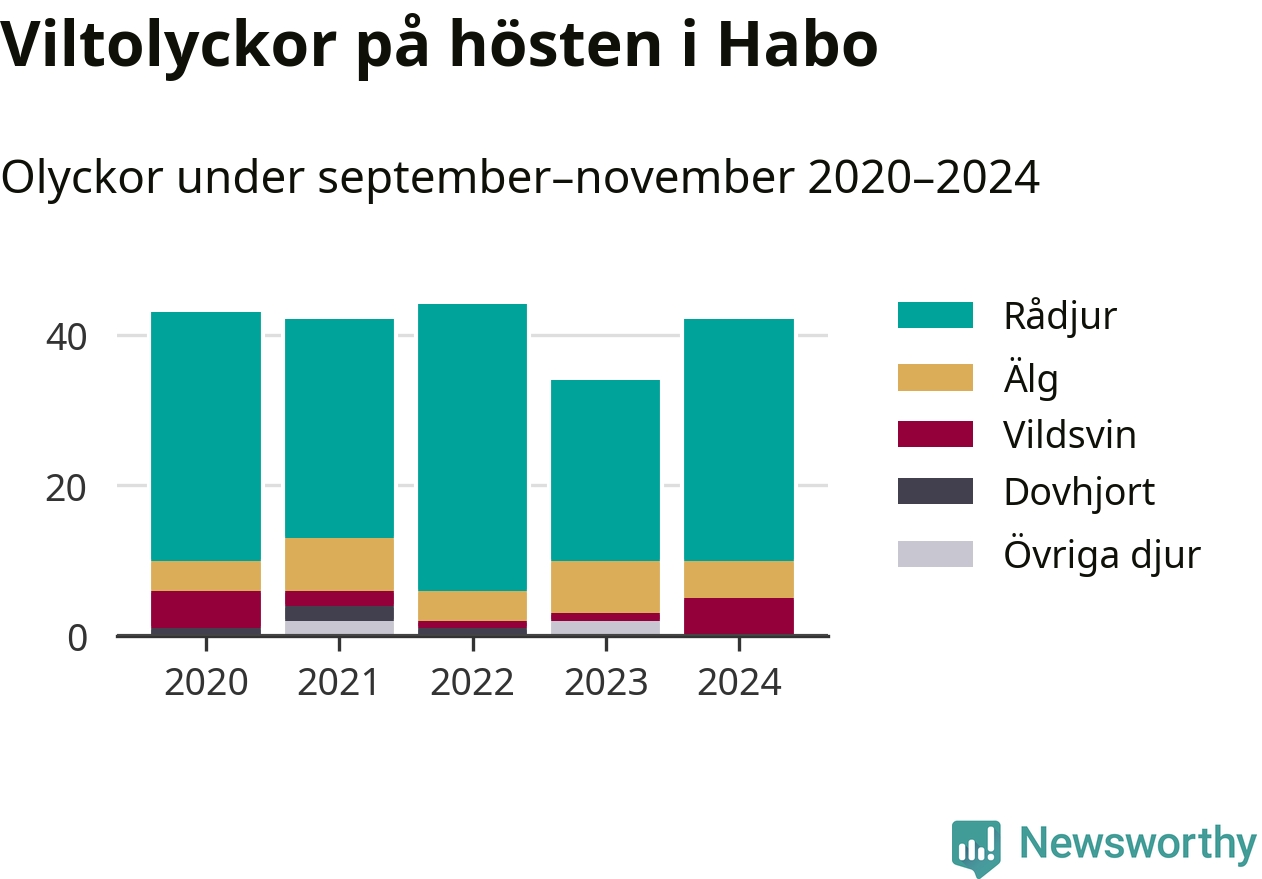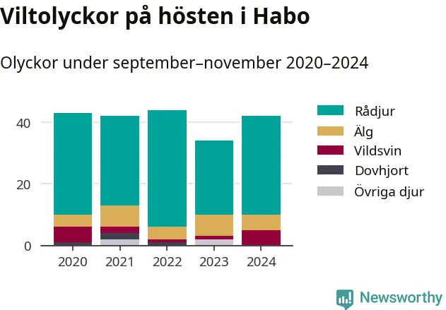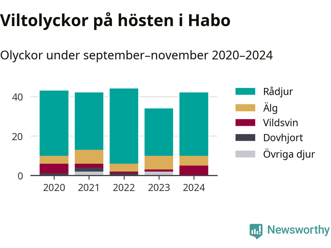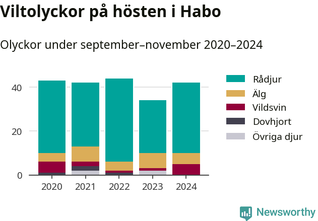 Under de senaste höstarna har antalet viltolyckor ökat i Sverige. Den höst med flest viltolyckor i Habo hittills under 2020-talet var 2022, 44 olyckor. I fjol höst rapporterades totalt 42 olyckor.