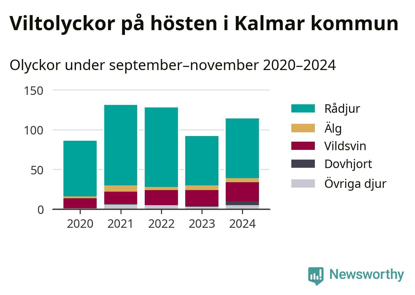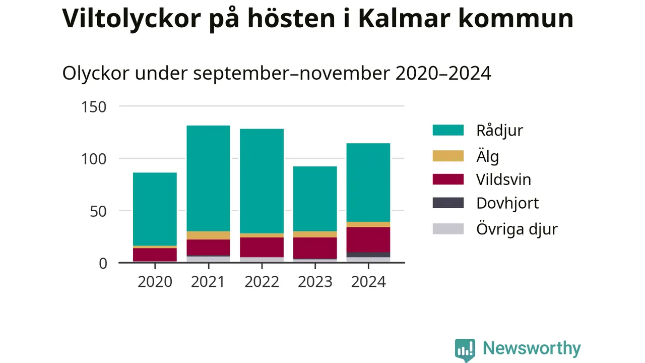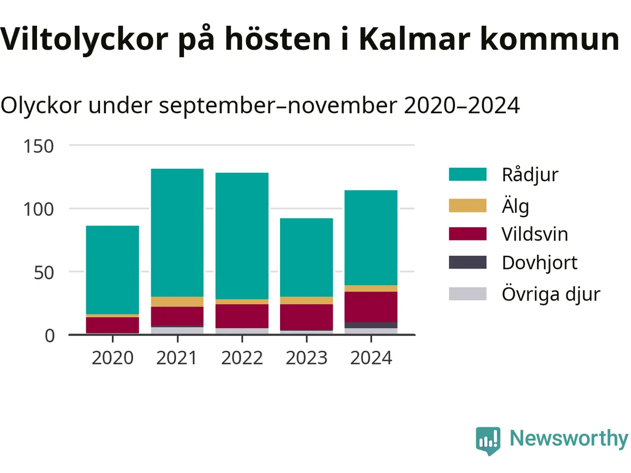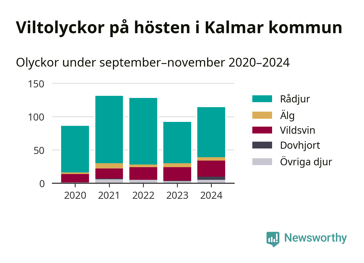 Under de senaste höstarna har antalet viltolyckor ökat i Sverige. Den höst med flest viltolyckor i Kalmar kommun hittills under 2020-talet var 2021, 131 olyckor. I fjol höst rapporterades totalt 114 olyckor.