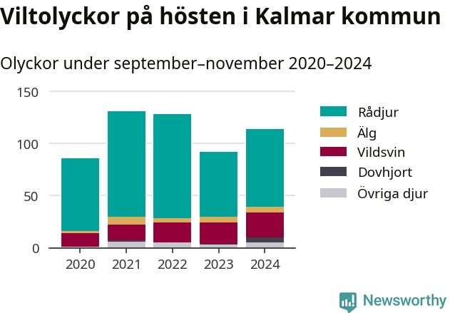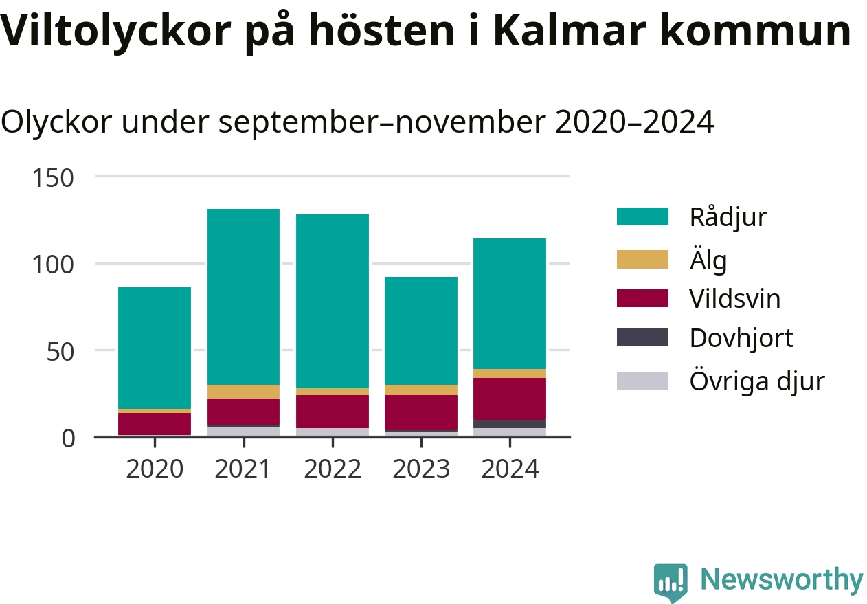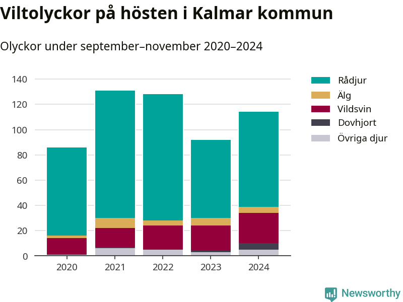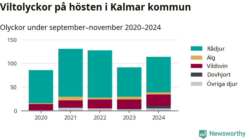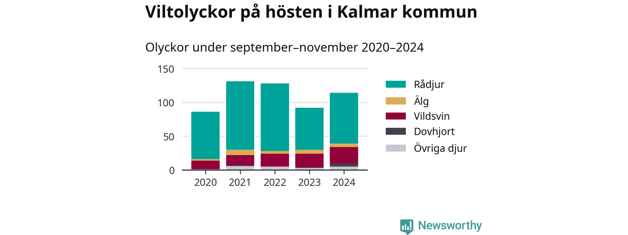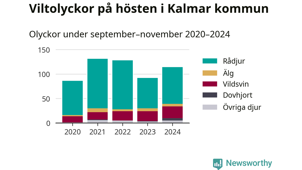 Under de senaste höstarna har antalet viltolyckor ökat i Sverige. Den höst med flest viltolyckor i Kalmar kommun hittills under 2020-talet var 2021, 131 olyckor. I fjol höst rapporterades totalt 114 olyckor.