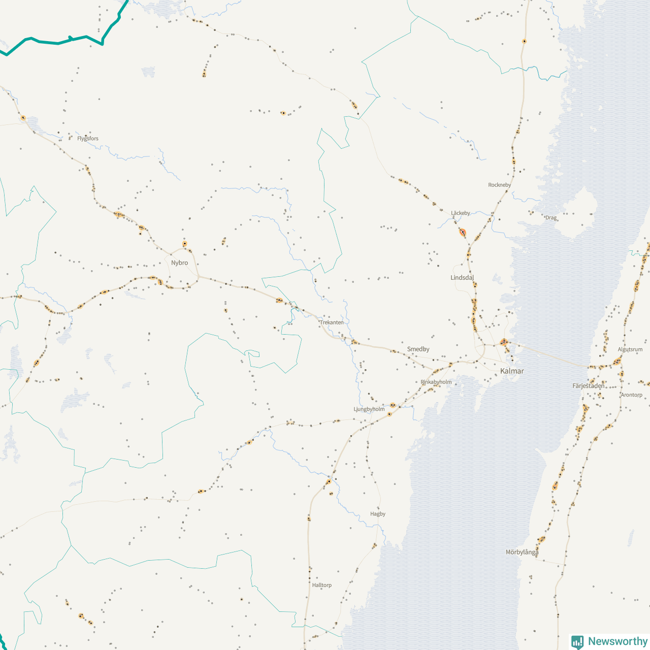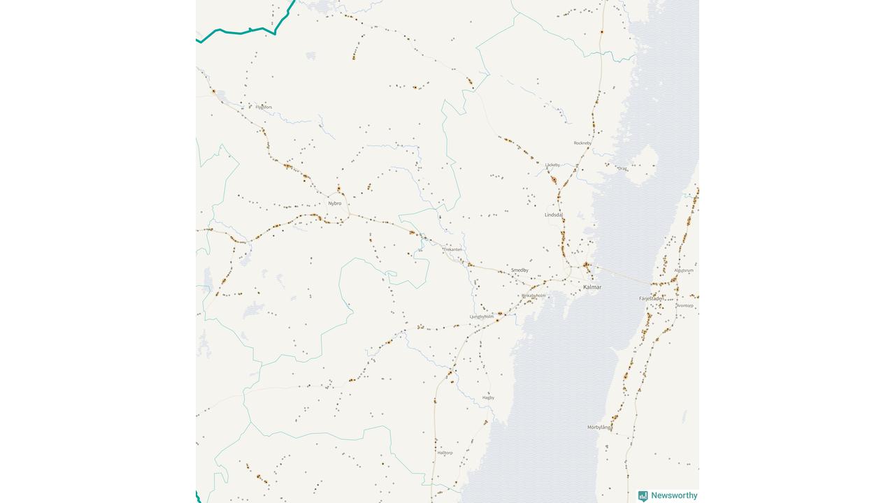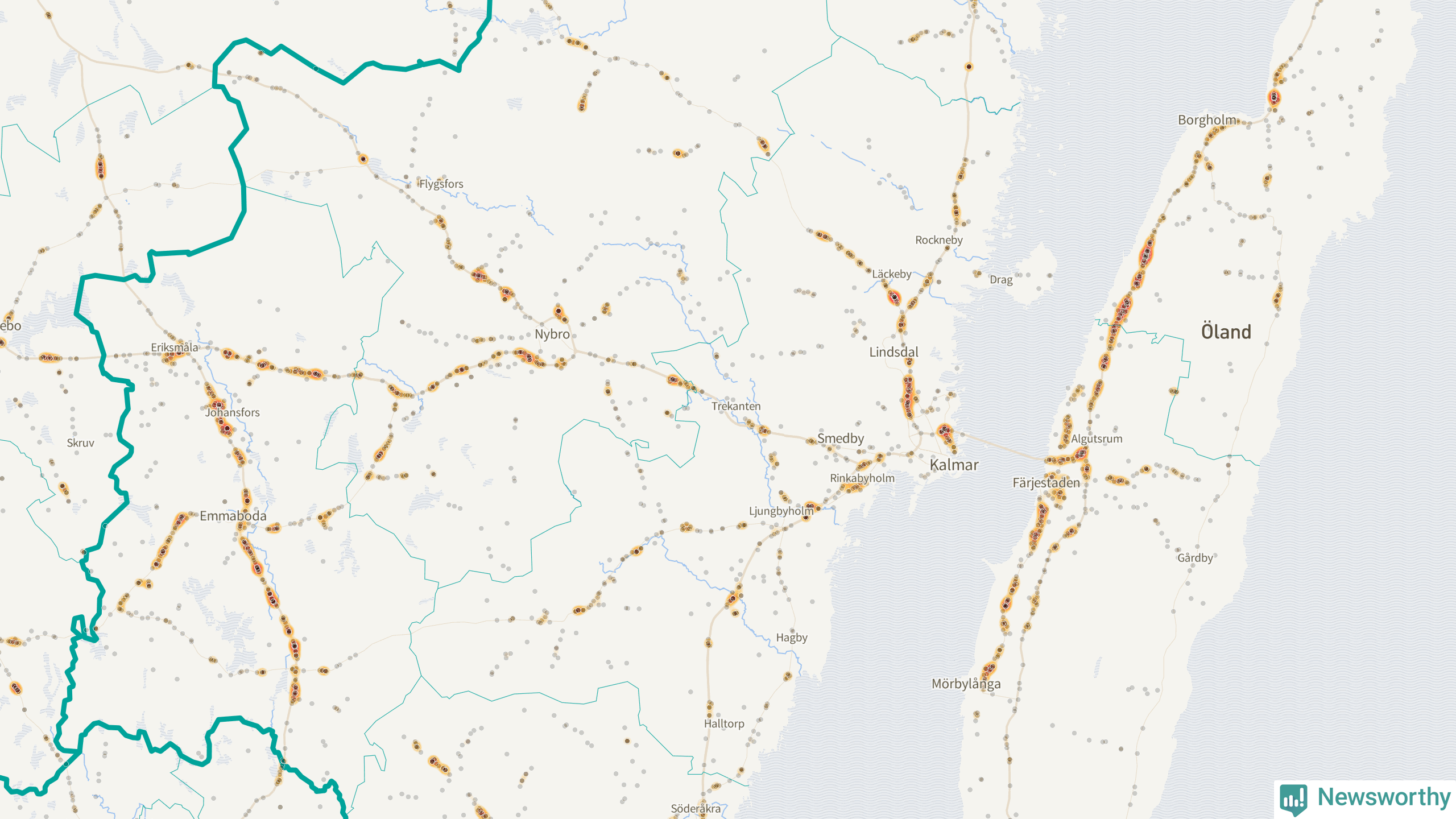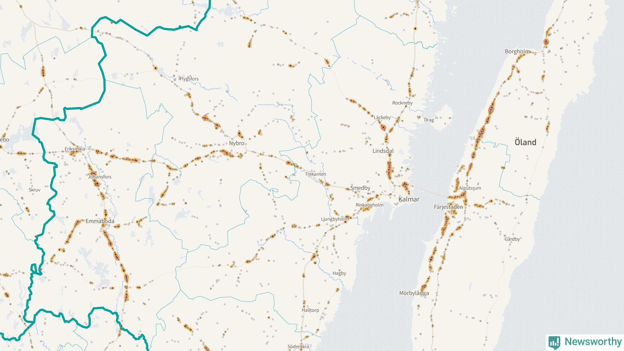 Den mest olycksdrabbade vägen i Kalmar län är E22 (inklusive väg 758/E22), med totalt 872 rapporterade viltolyckor i länet under femårsperioden. Flest olyckor längs E22 – 320 stycken – skedde i Västerviks kommun. Västervik är också den kommun med flest registrerade viltolyckor i länet totalt, 1 143 stycken under perioden september–november 2020–2024.
