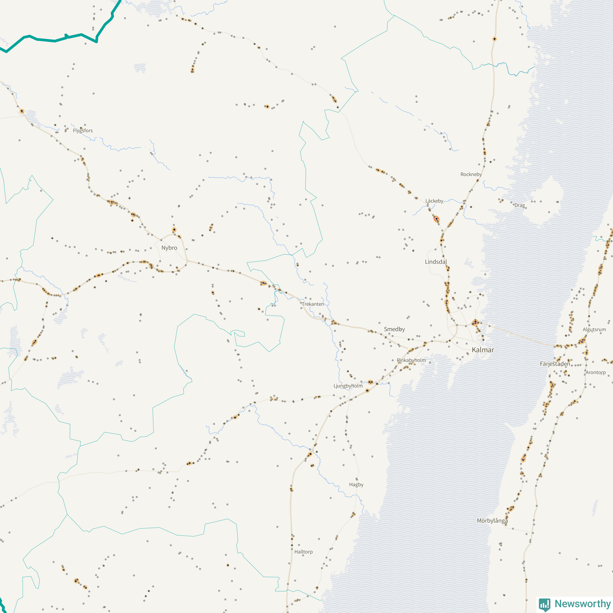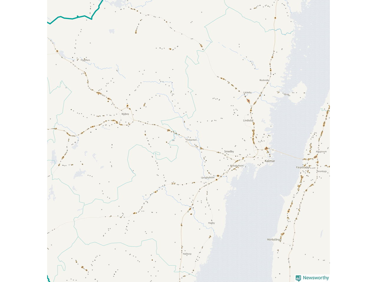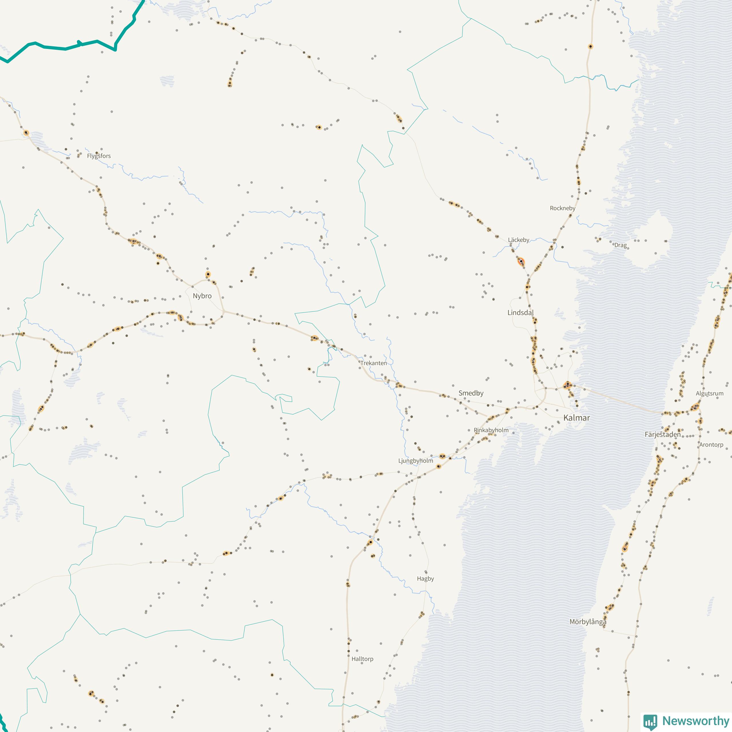 Den mest olycksdrabbade vägen i Kalmar län är E22 (inklusive väg 758/E22), med totalt 872 rapporterade viltolyckor i länet under femårsperioden. Flest olyckor längs E22 – 320 stycken – skedde i Västerviks kommun. Västervik är också den kommun med flest registrerade viltolyckor i länet totalt, 1 143 stycken under perioden september–november 2020–2024.