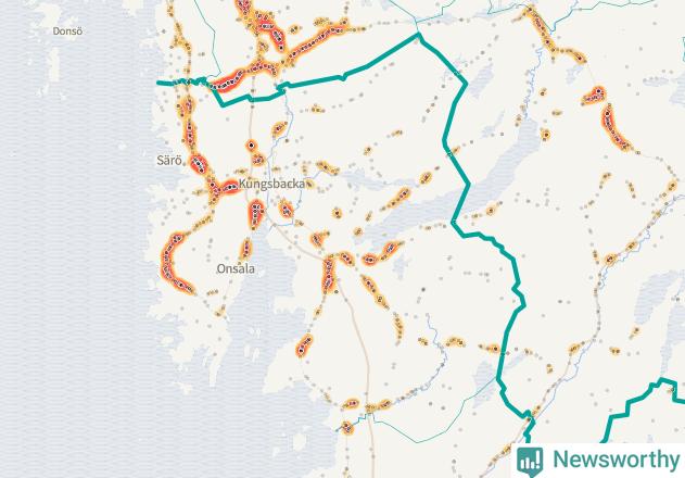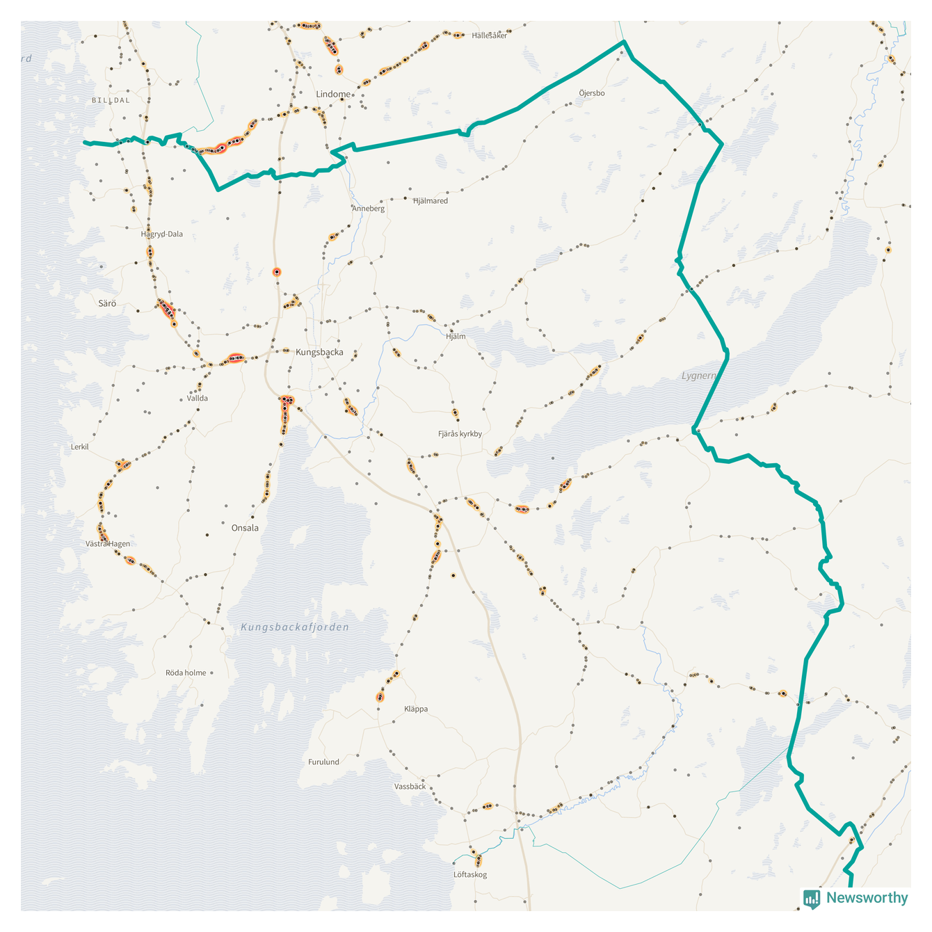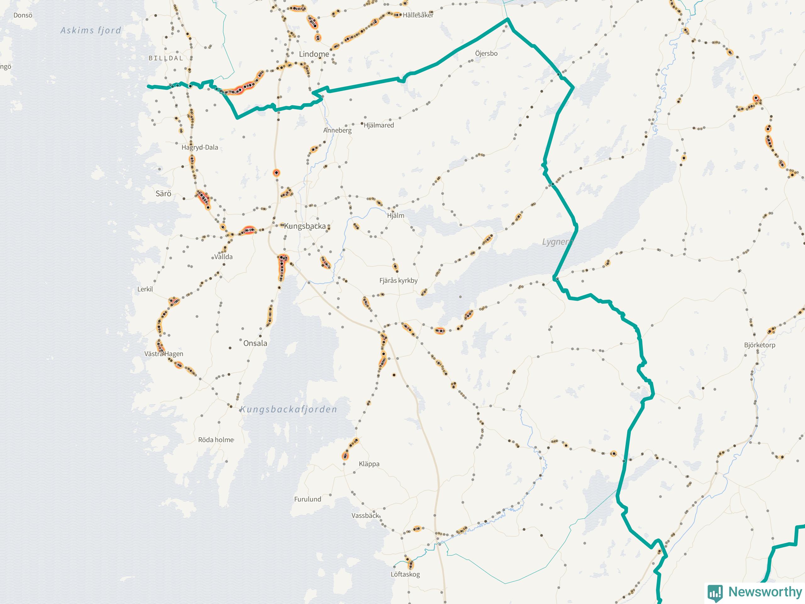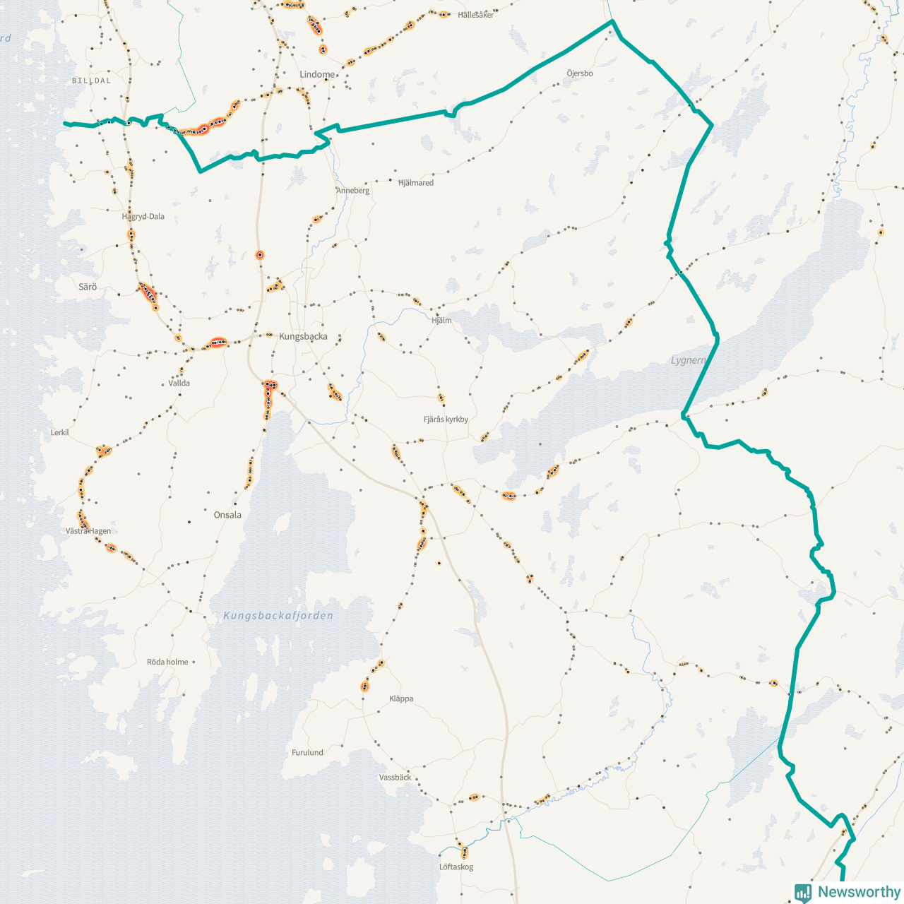 | Väg 953 (Gamla Särövägen, Lindomevägen) | 12 | rådjur (11 olyckor) |