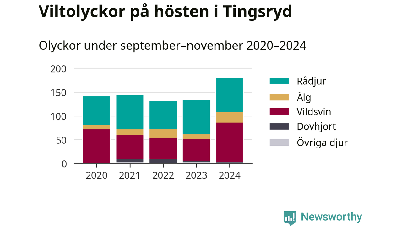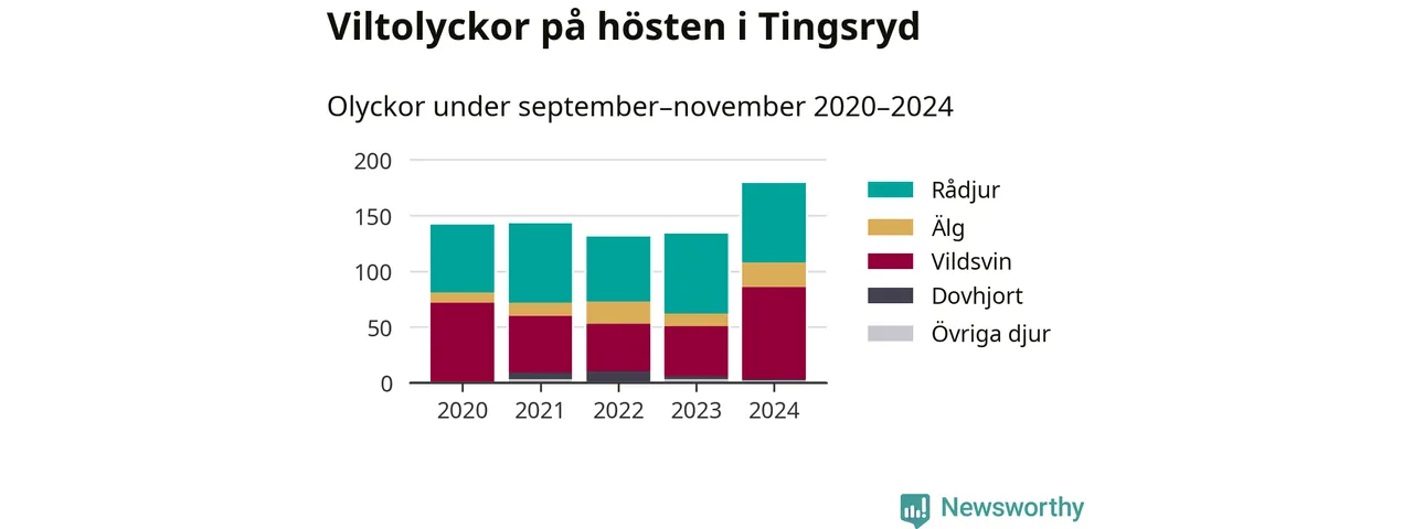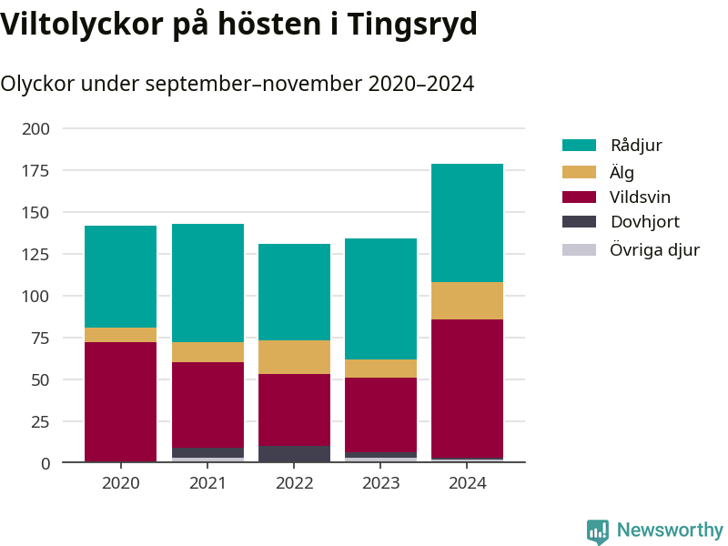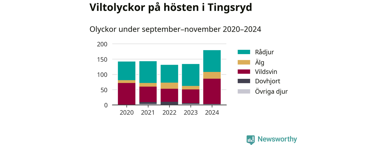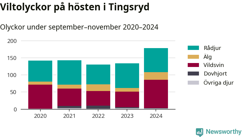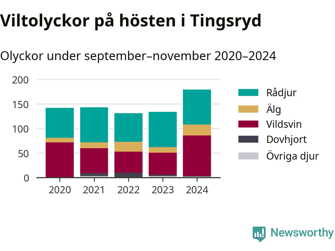 Viltolyckor i Tingsryd 2020–2024 uppdelat på viltslag