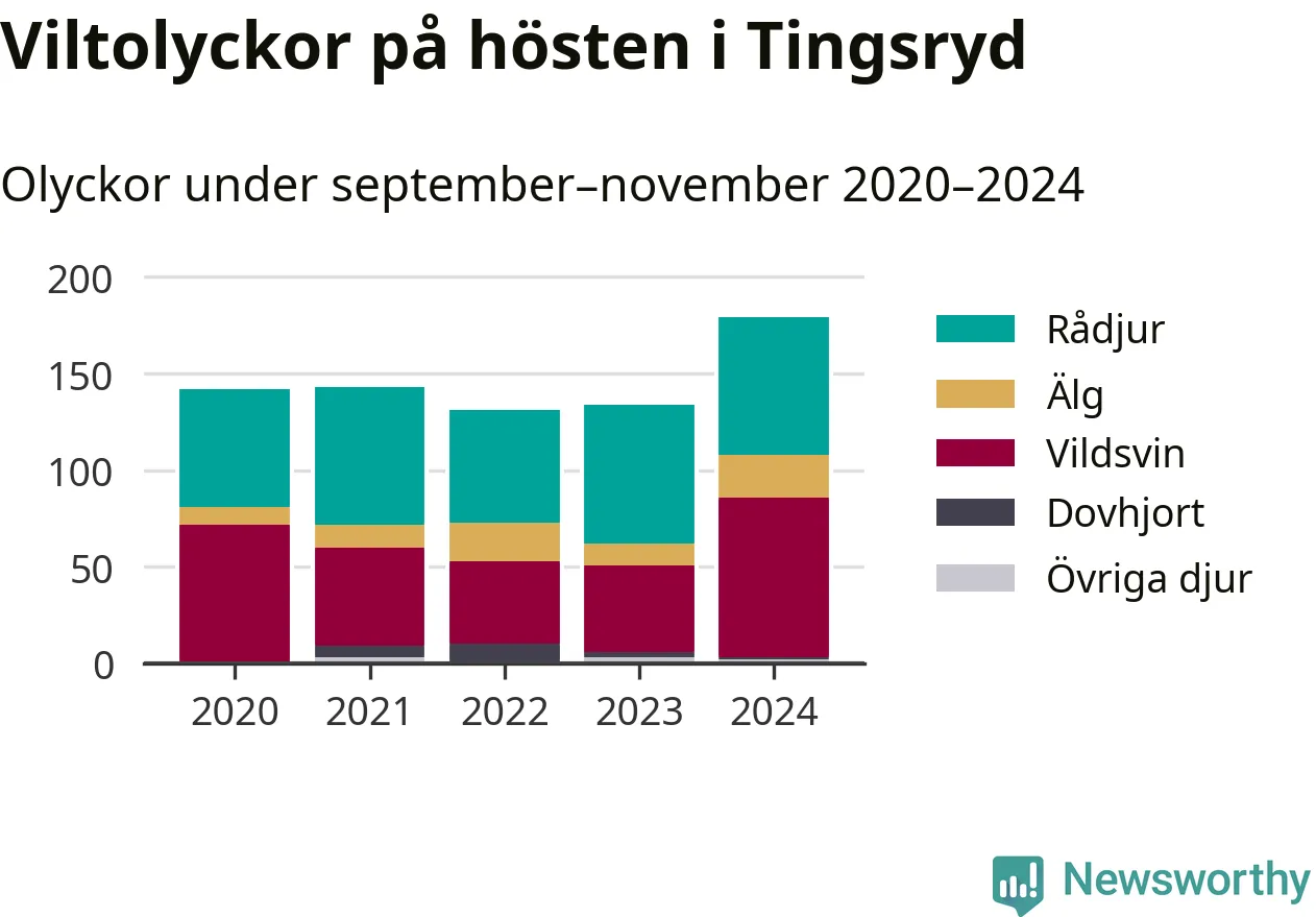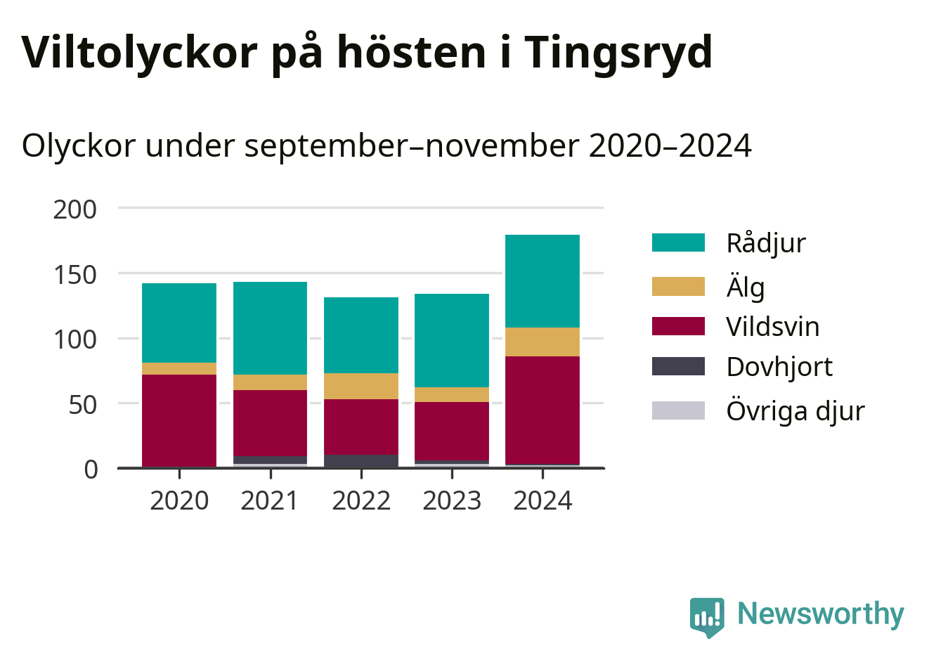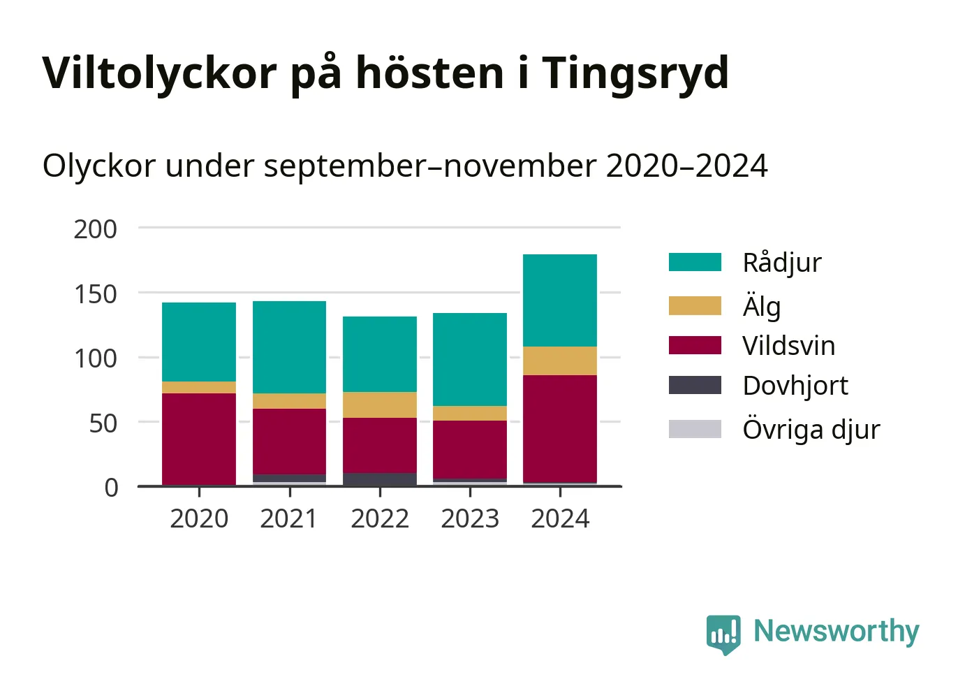 Viltolyckor i Tingsryd 2020–2024 uppdelat på viltslag