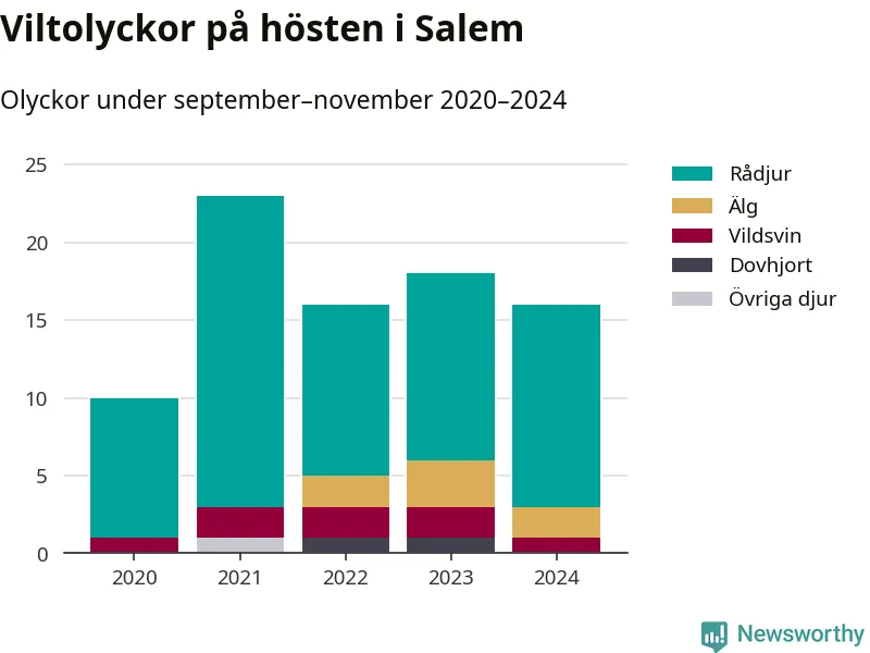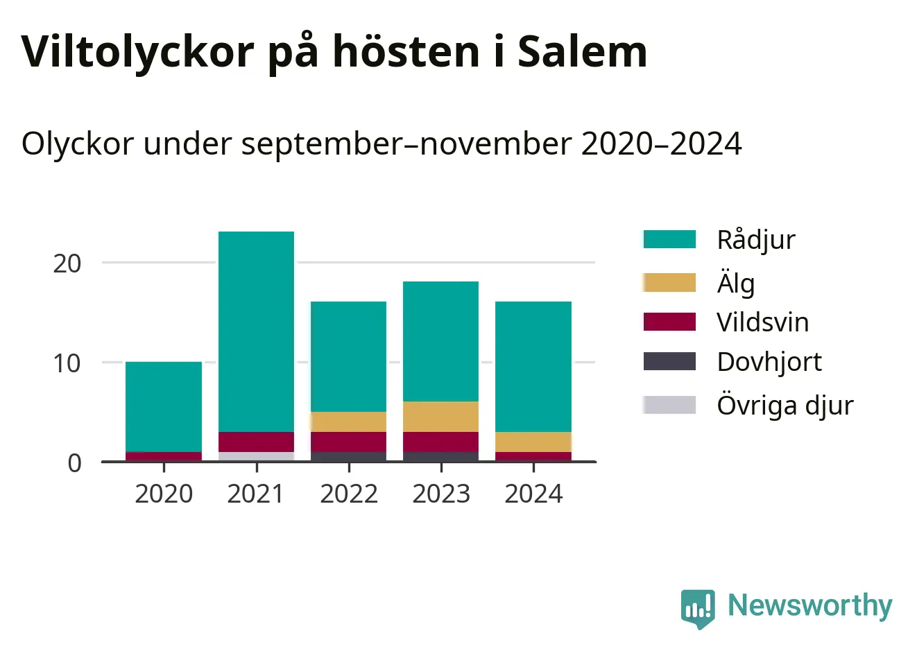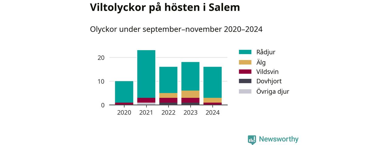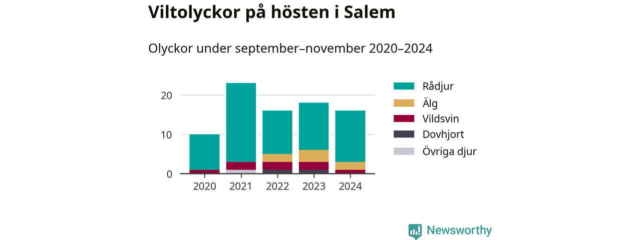 Under de senaste höstarna har antalet viltolyckor ökat i Sverige. Den höst med flest viltolyckor i Salem hittills under 2020-talet var 2021, 23 olyckor. I fjol höst rapporterades totalt 16 olyckor.