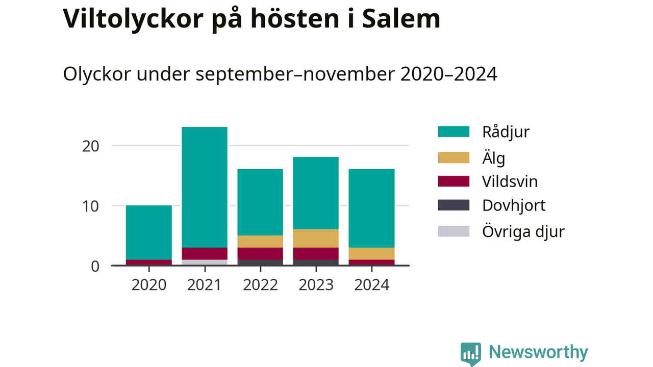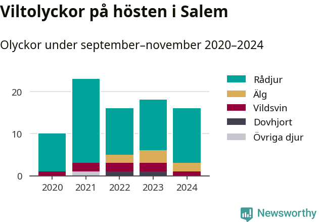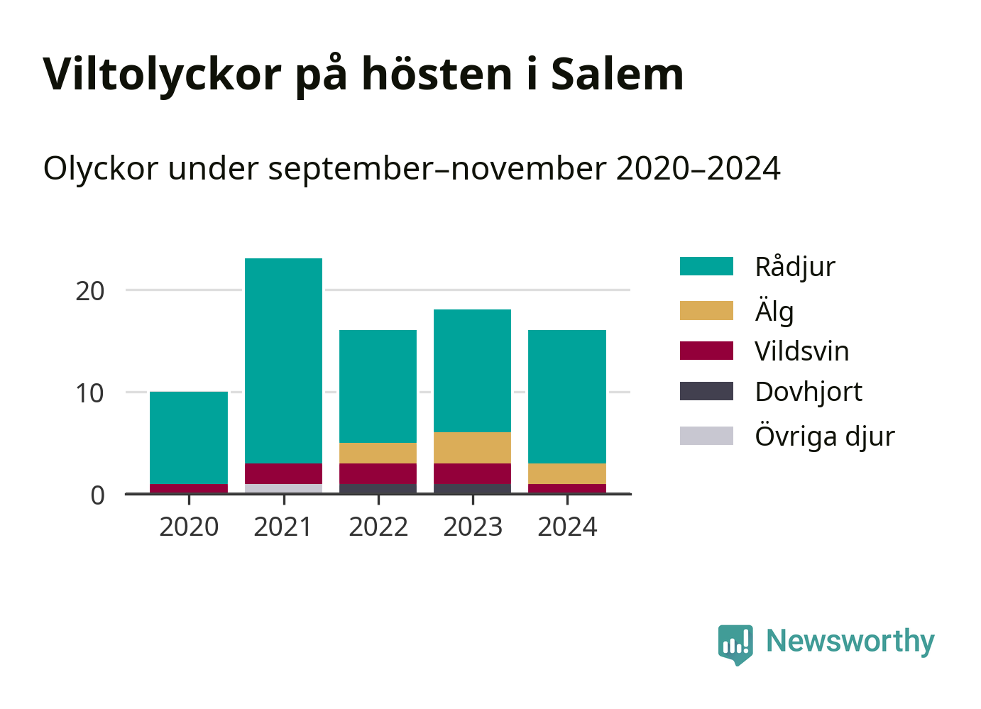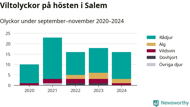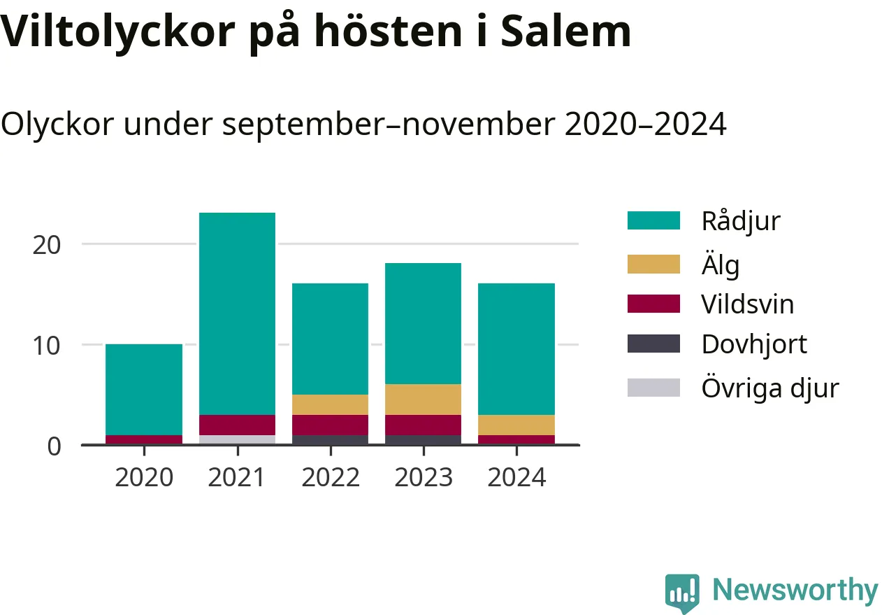 Under de senaste höstarna har antalet viltolyckor ökat i Sverige. Den höst med flest viltolyckor i Salem hittills under 2020-talet var 2021, 23 olyckor. I fjol höst rapporterades totalt 16 olyckor.