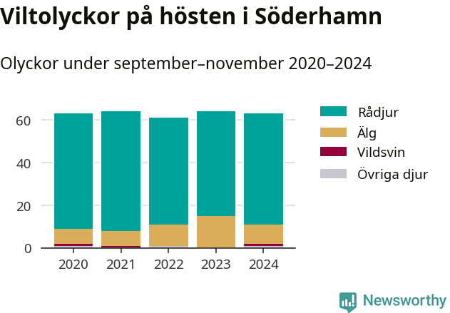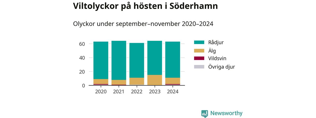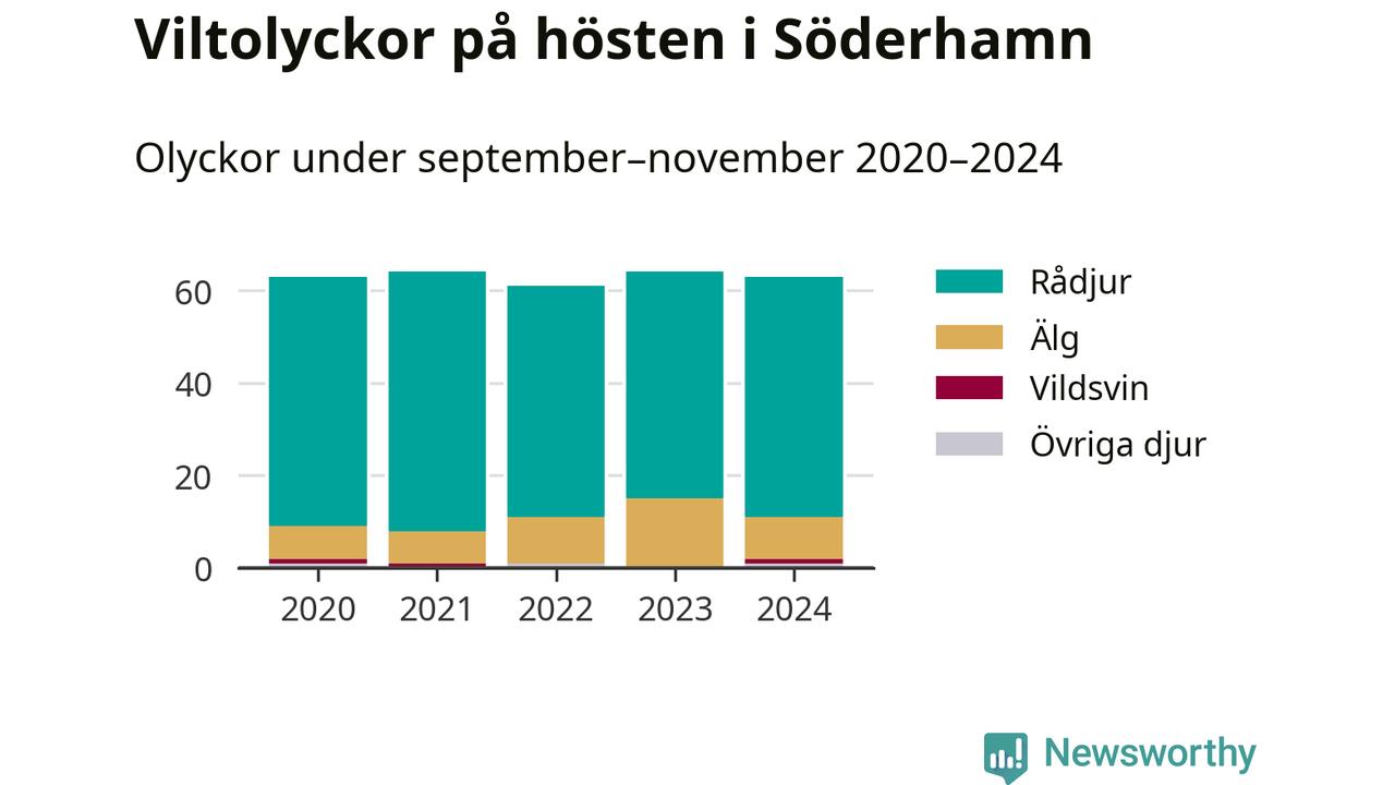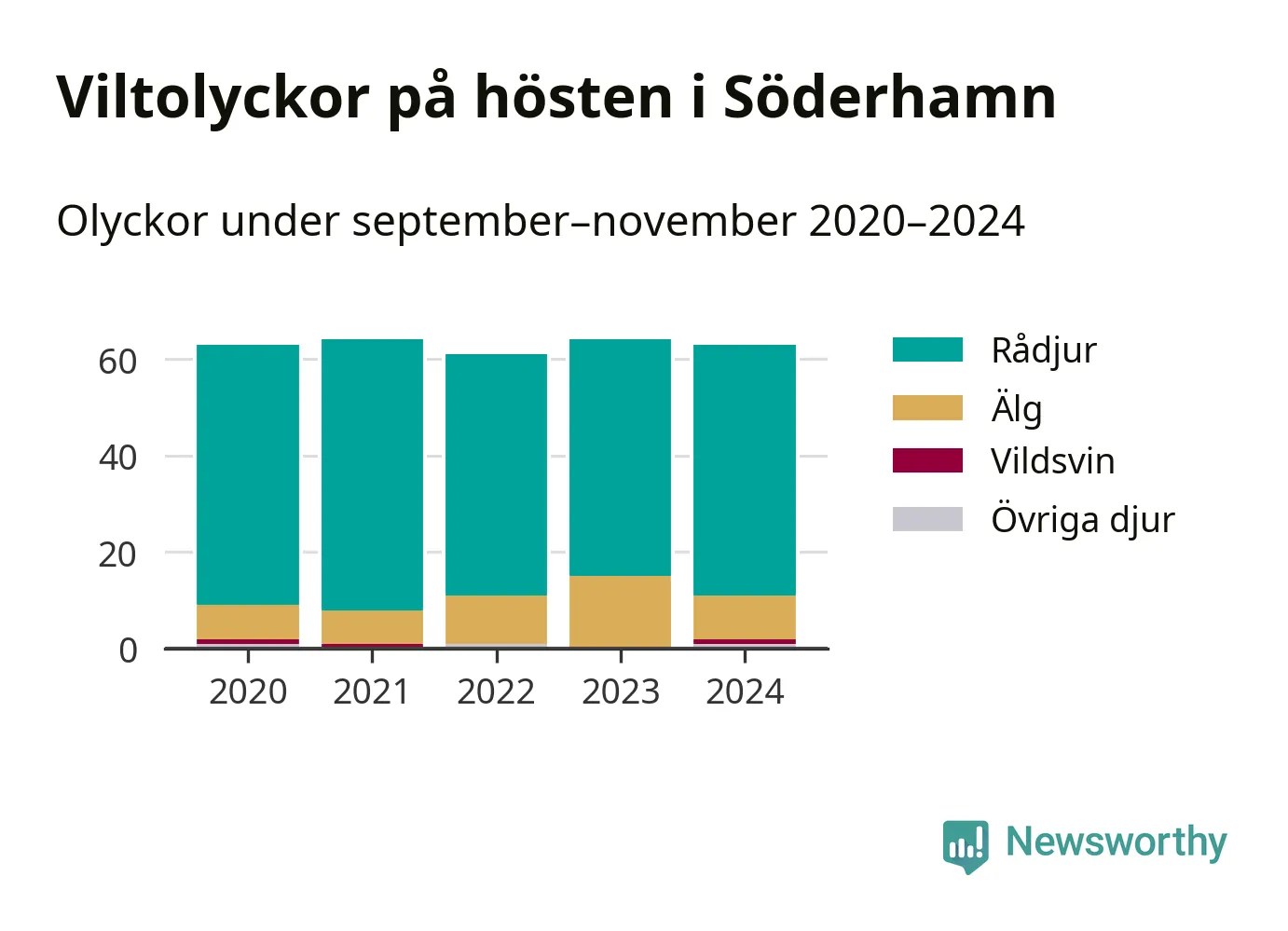 Under de senaste höstarna har antalet viltolyckor ökat i Sverige. Den höst med flest viltolyckor i Söderhamn hittills under 2020-talet var 2021 och 2023, 64 olyckor. I fjol höst rapporterades totalt 63 olyckor.