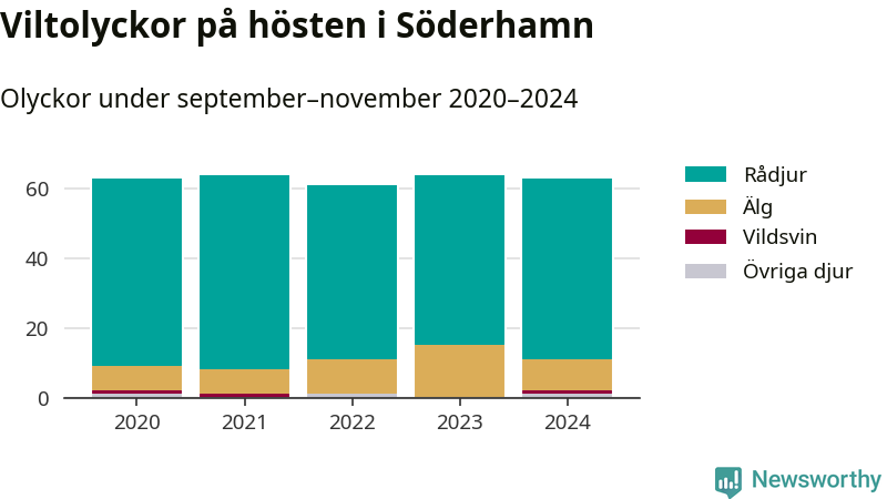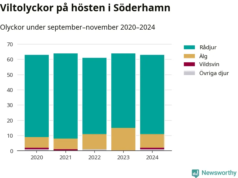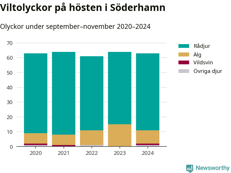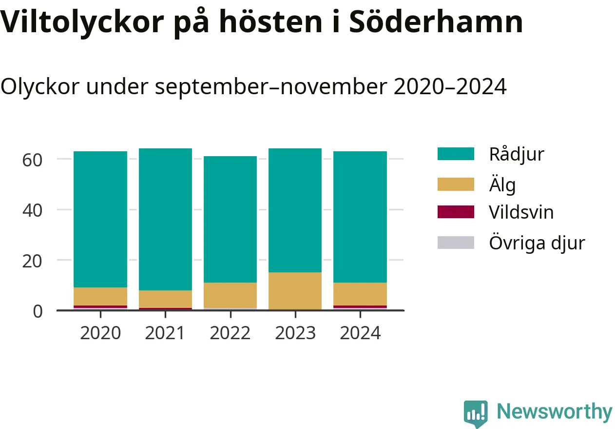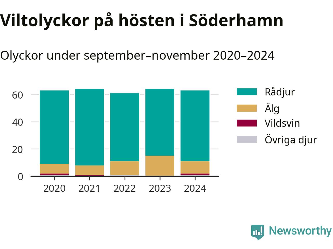 Under de senaste höstarna har antalet viltolyckor ökat i Sverige. Den höst med flest viltolyckor i Söderhamn hittills under 2020-talet var 2021 och 2023, 64 olyckor. I fjol höst rapporterades totalt 63 olyckor.