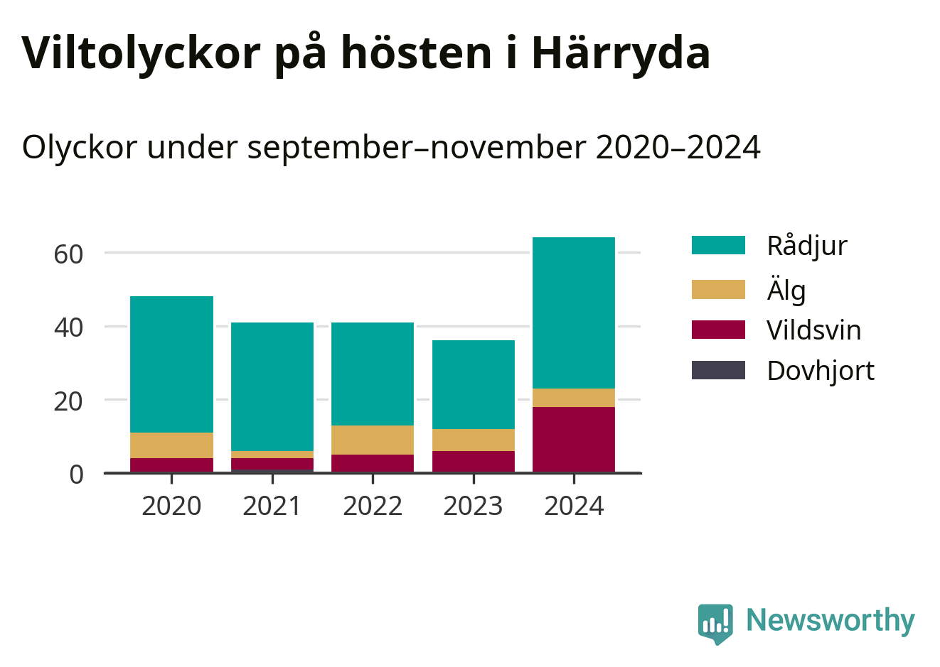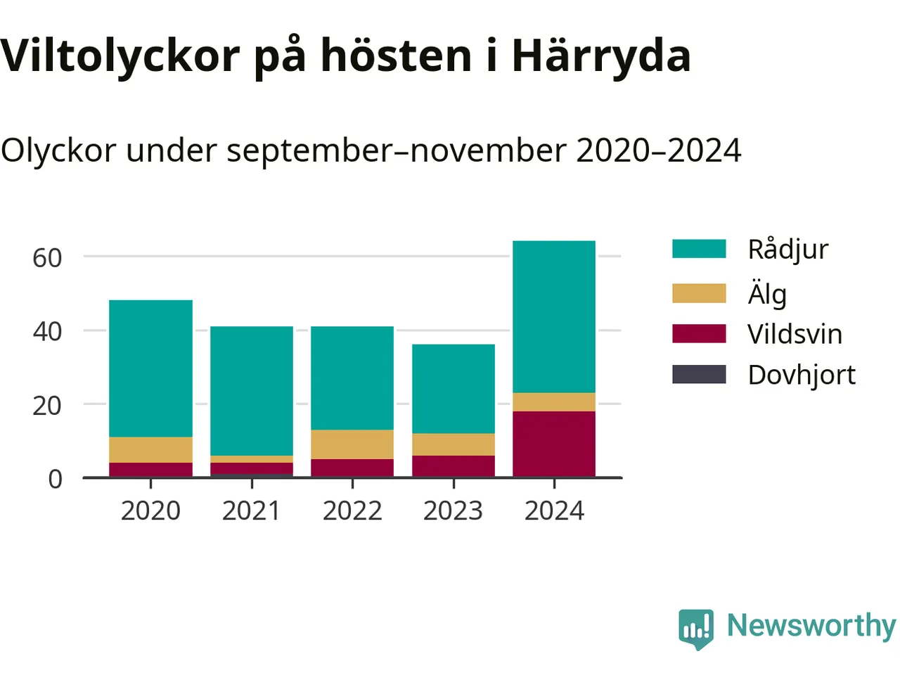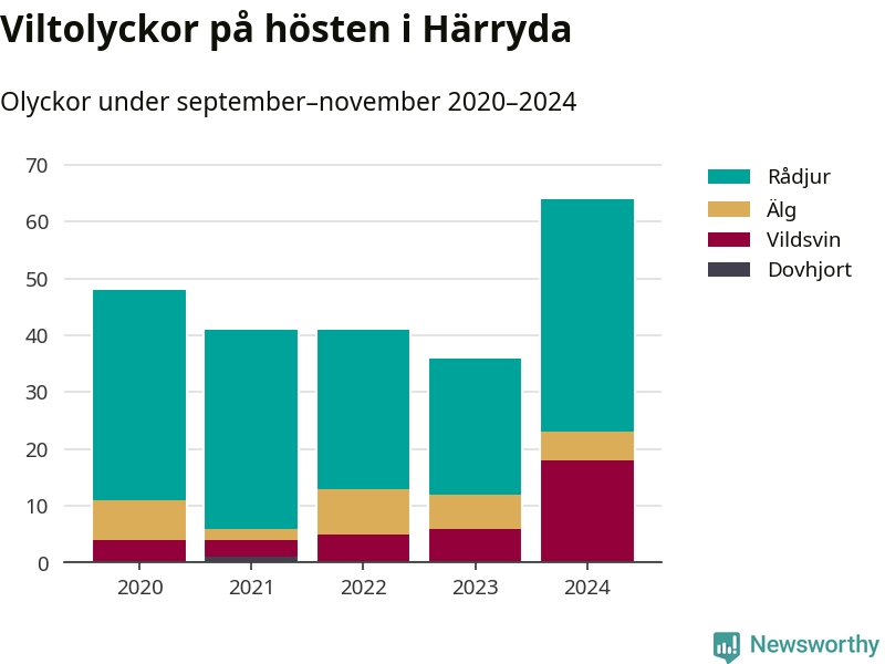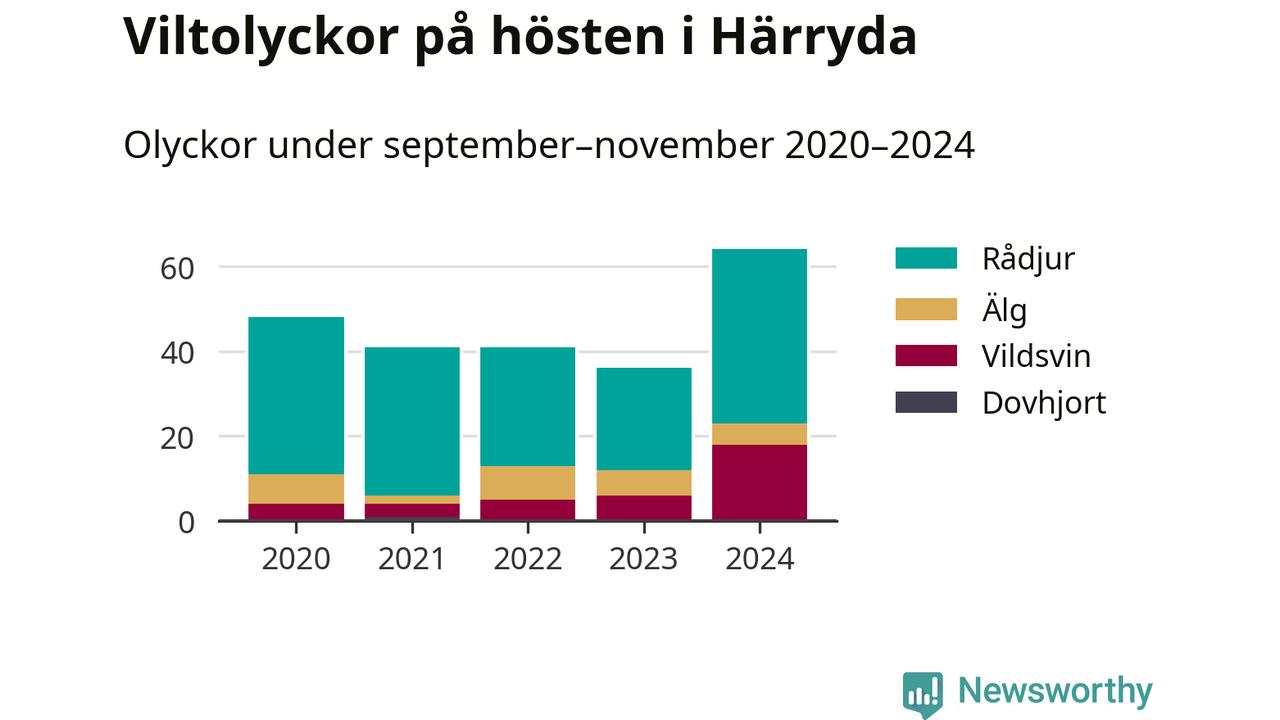 Under de senaste höstarna har antalet viltolyckor ökat i Sverige. I fjol höst noterades också flest viltolyckor i Härryda hittills under 2020-talet, totalt 64 stycken.