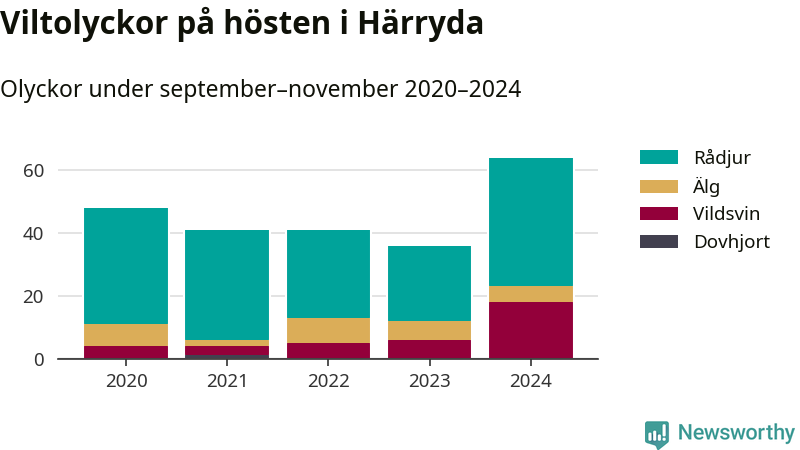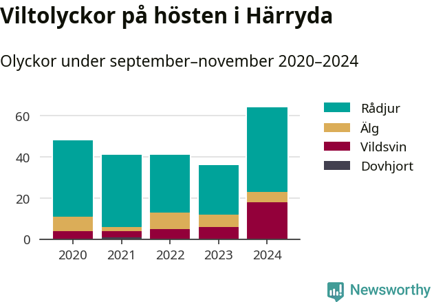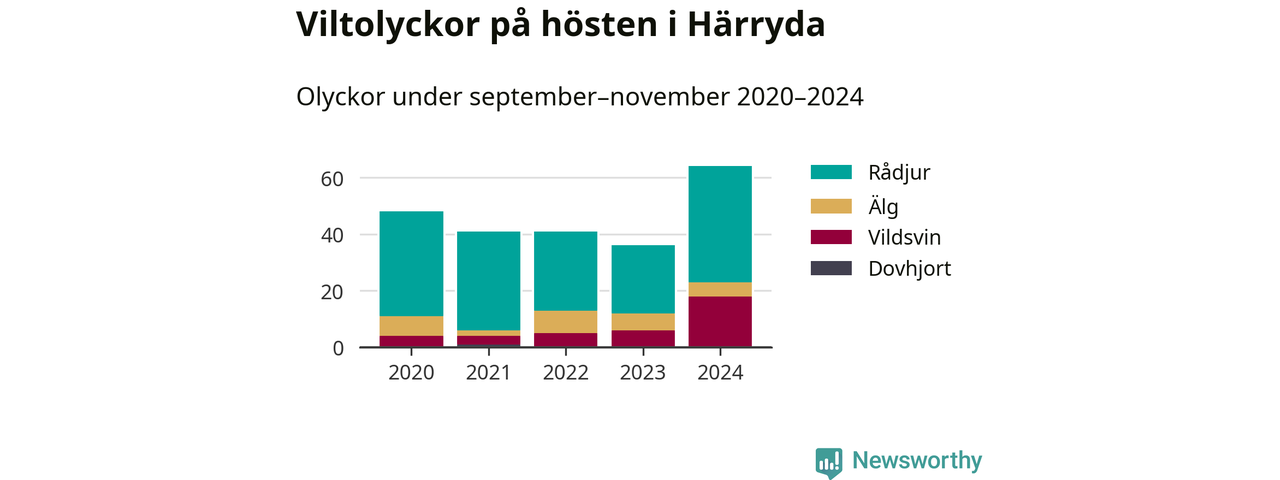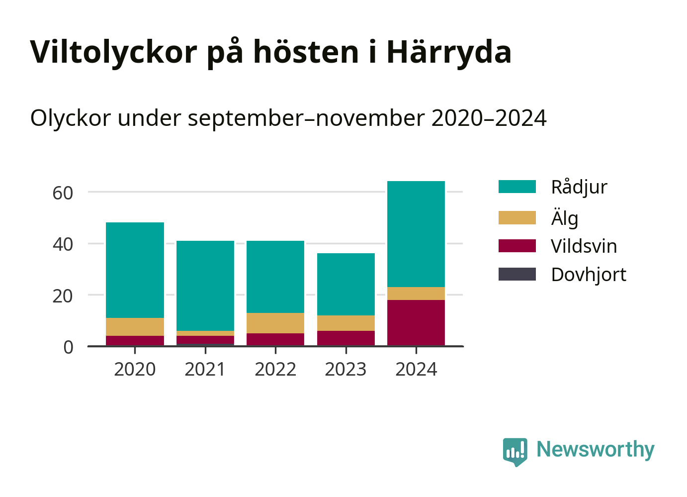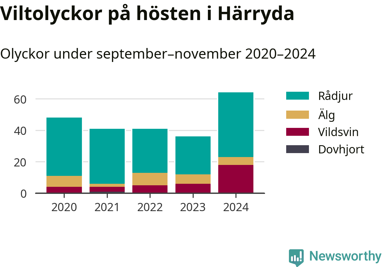 Under de senaste höstarna har antalet viltolyckor ökat i Sverige. I fjol höst noterades också flest viltolyckor i Härryda hittills under 2020-talet, totalt 64 stycken.