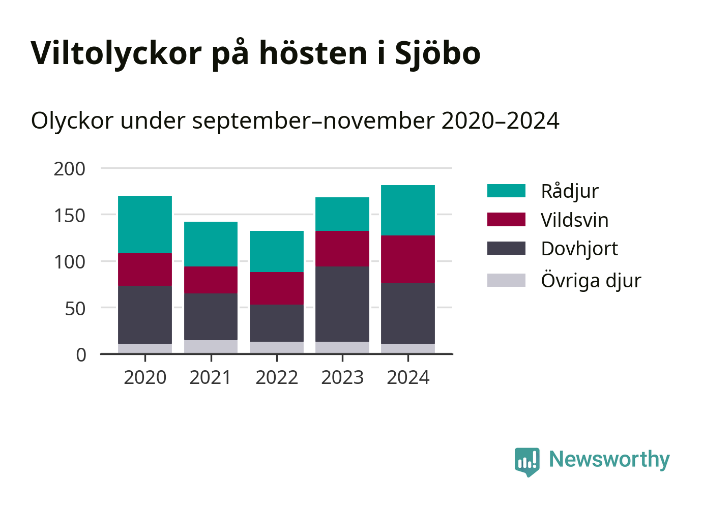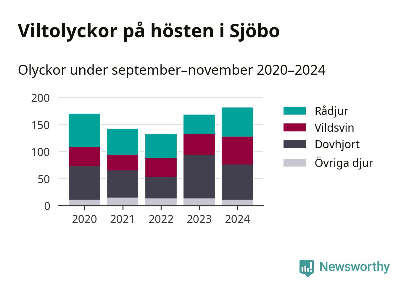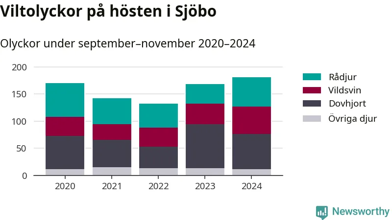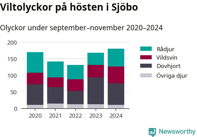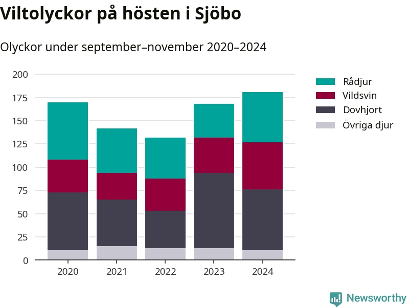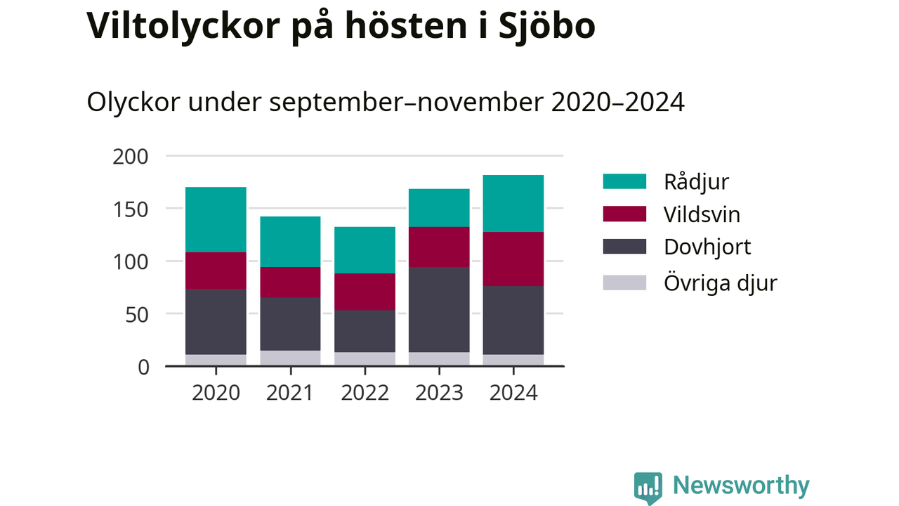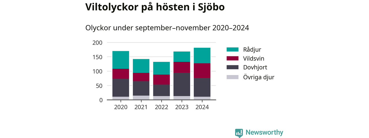 På hösten ökar risken för viltolyckor längs vägarna. Under de senaste fem höstarna har totalt 793 olyckor rapporterats i Sjöbo kommun – och antalet olyckor med vildsvin ökar stadigt. Här är de mest drabbade vägarna.