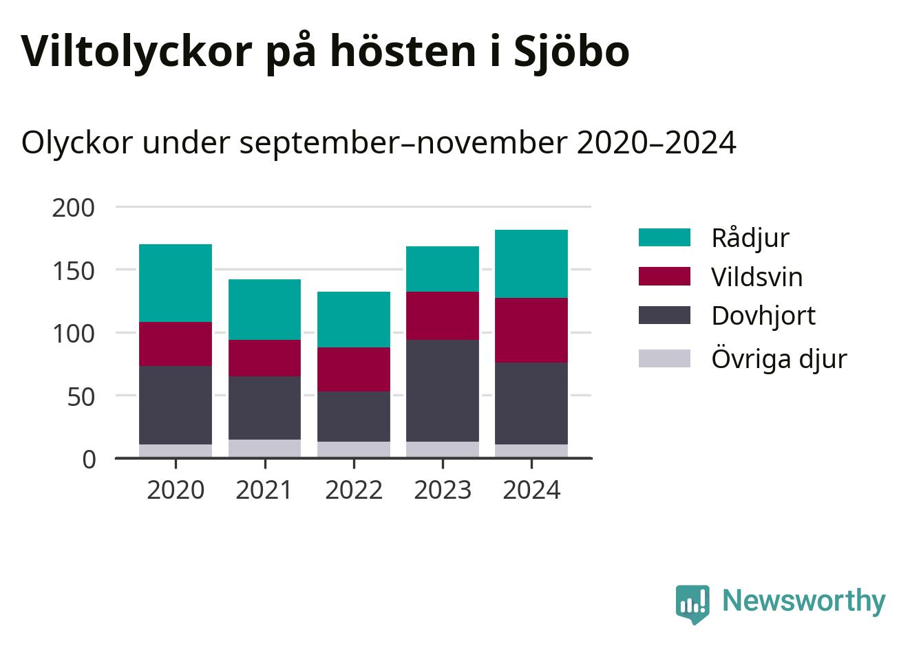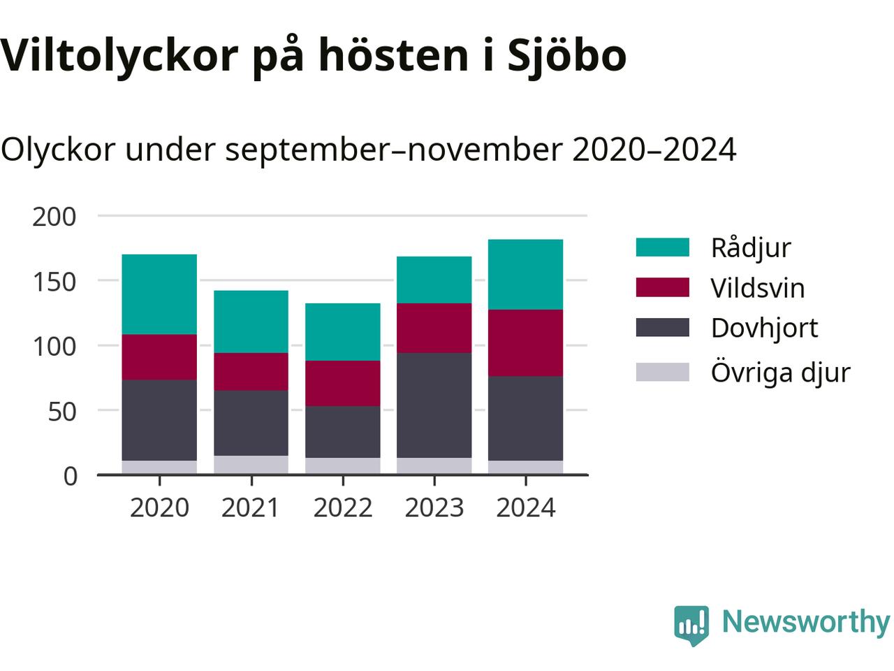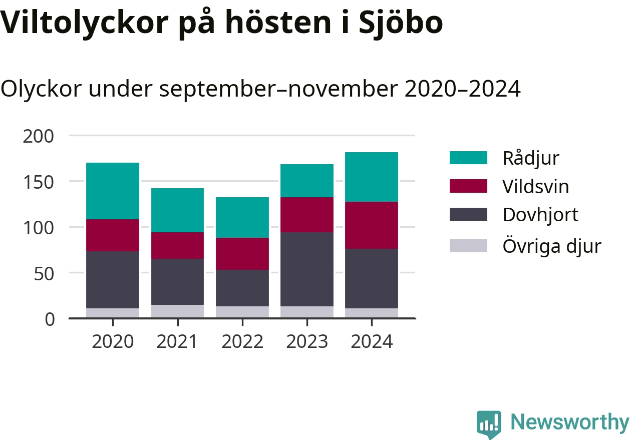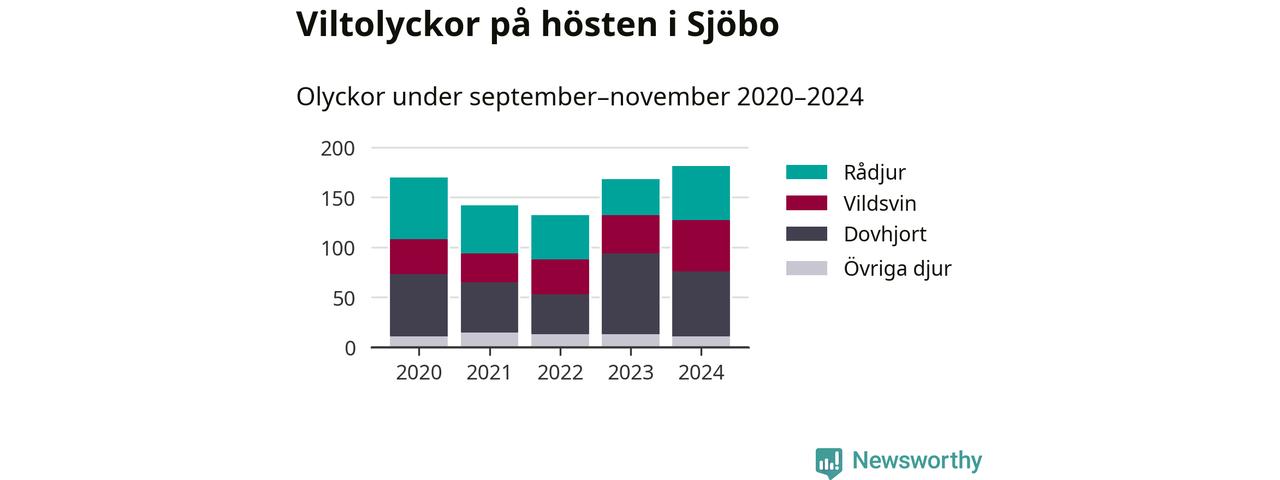 Det viltslag som orsakat flest olyckor i Sjöbo är dovhjort, 38 procent av olyckorna. Samtidigt har antalet vildsvinsolyckor i kommunen ökat de tre senaste åren och under 2024 rapporterades 51 olyckor med grisar.
