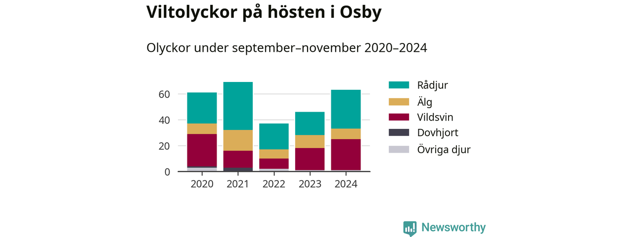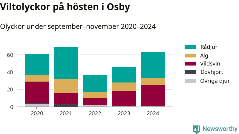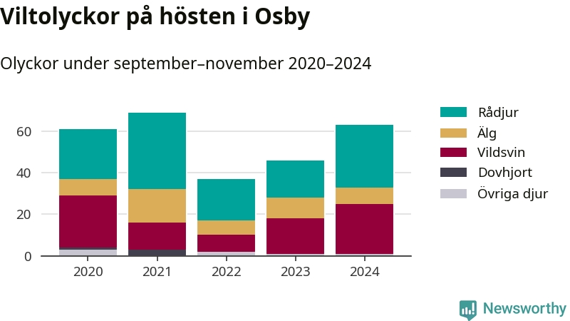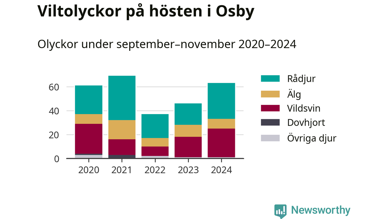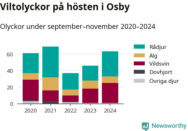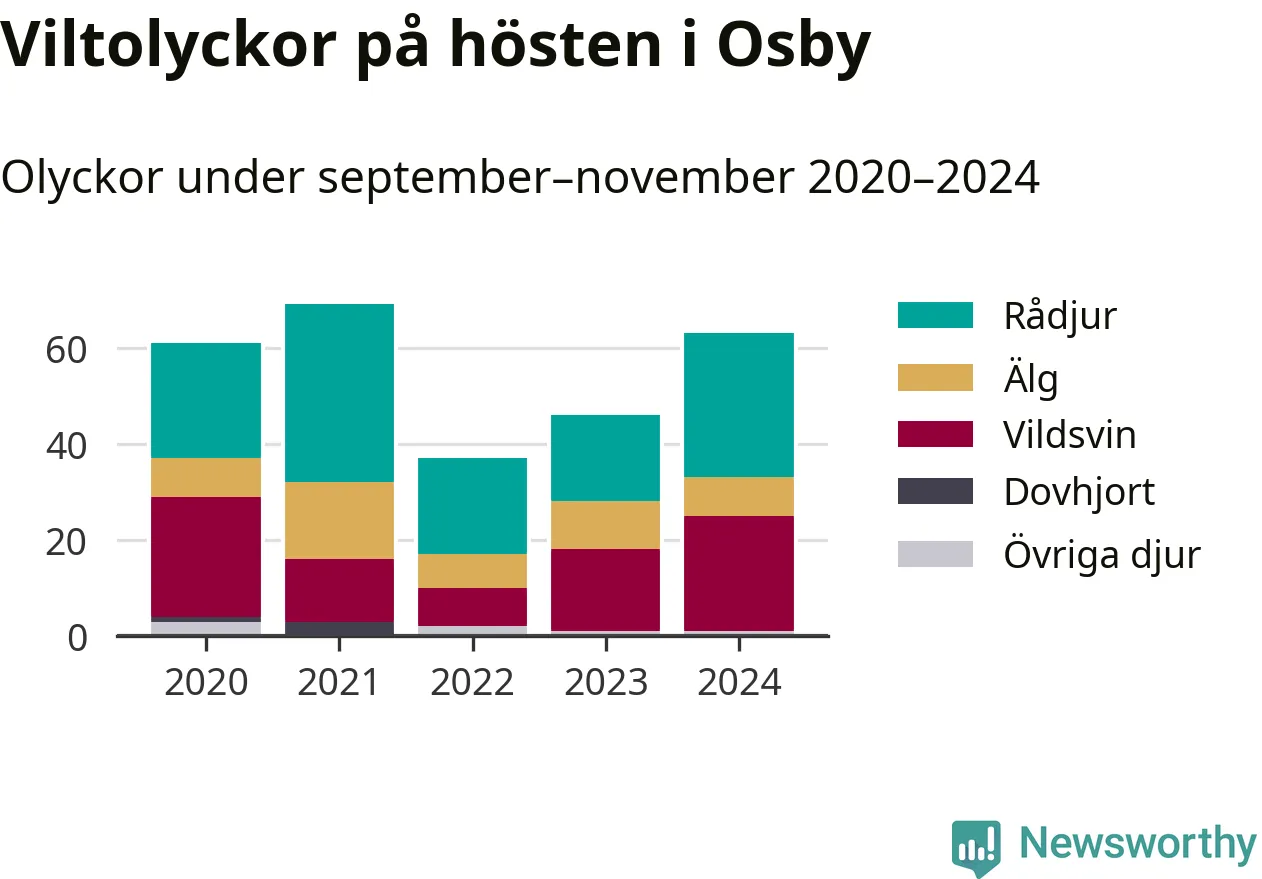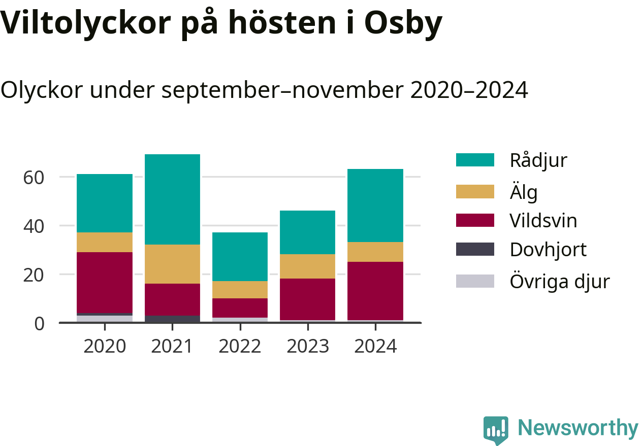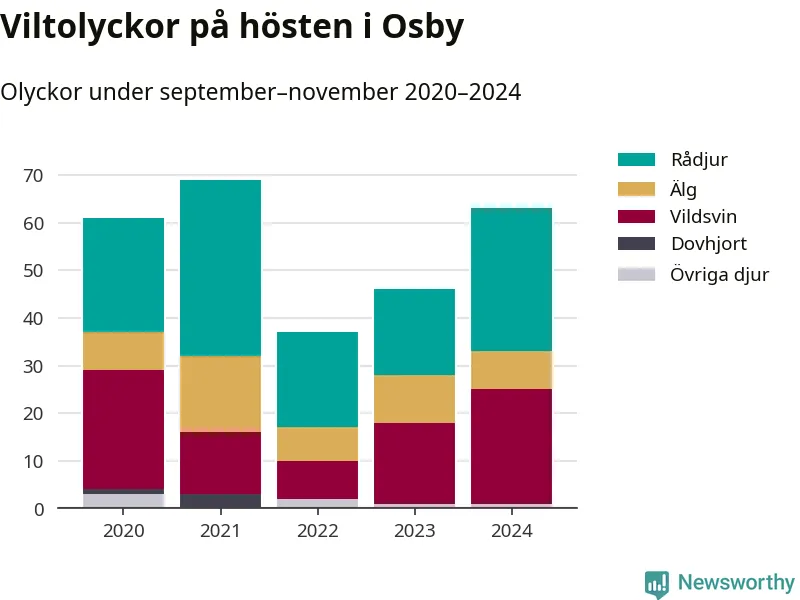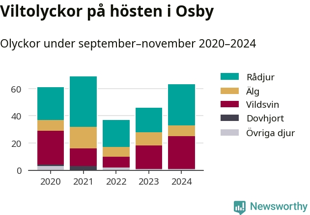 Under de senaste höstarna har antalet viltolyckor ökat i Sverige. Den höst med flest viltolyckor i Osby hittills under 2020-talet var 2021, 69 olyckor. I fjol höst rapporterades totalt 63 olyckor.