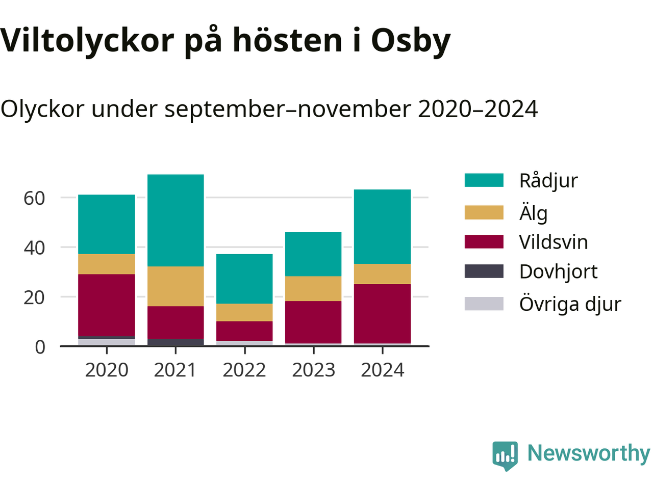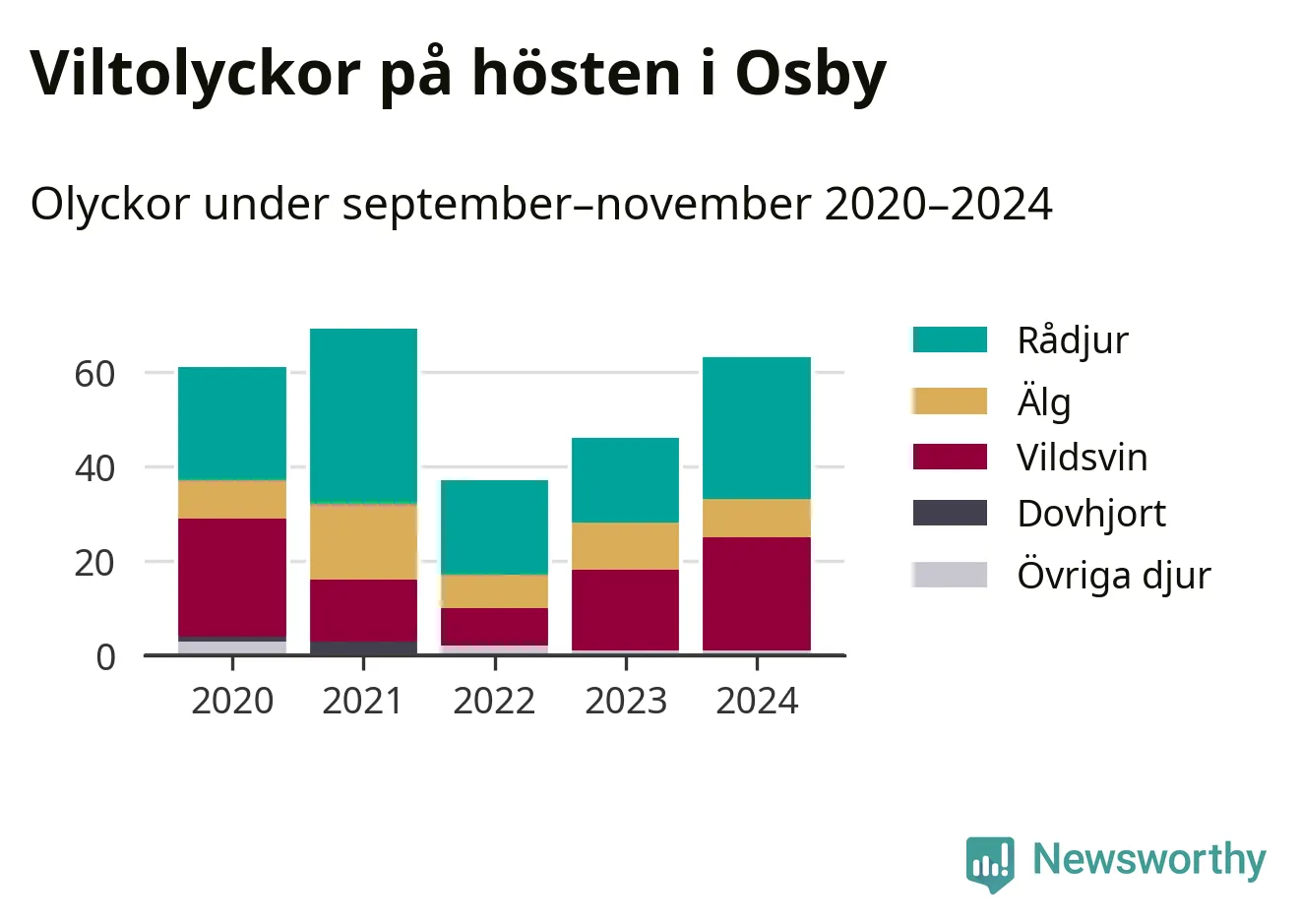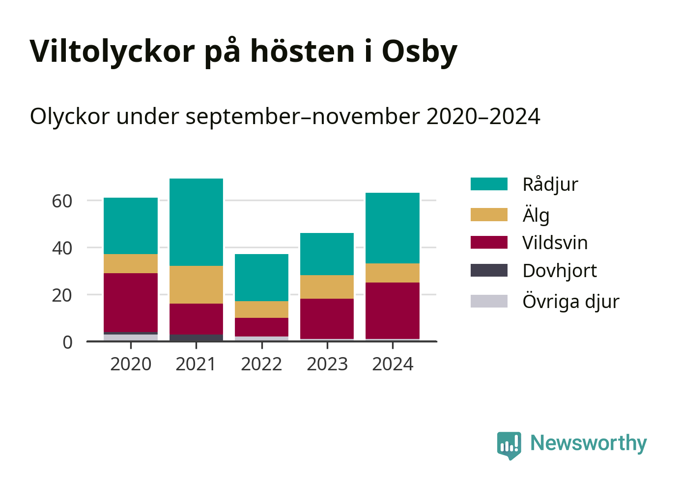 Viltolyckor i Osby 2020–2024 uppdelat på viltslag