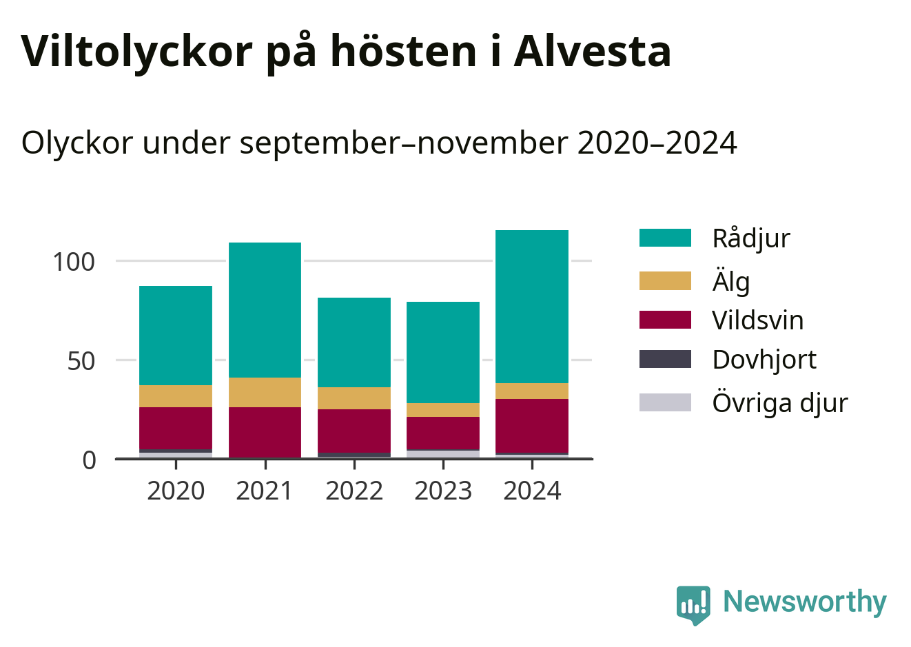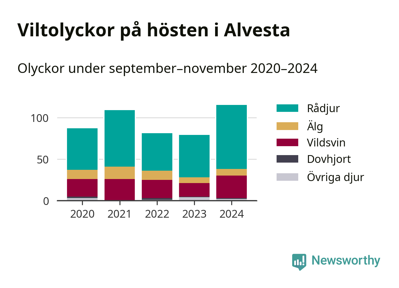Källa: Nationella viltolycksrådet. Gäller olyckor under månaderna september–november 2020–2024.