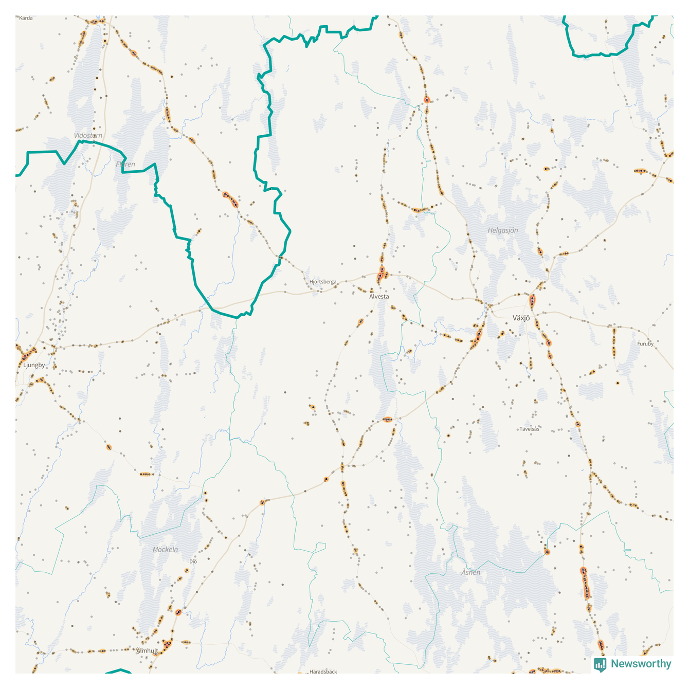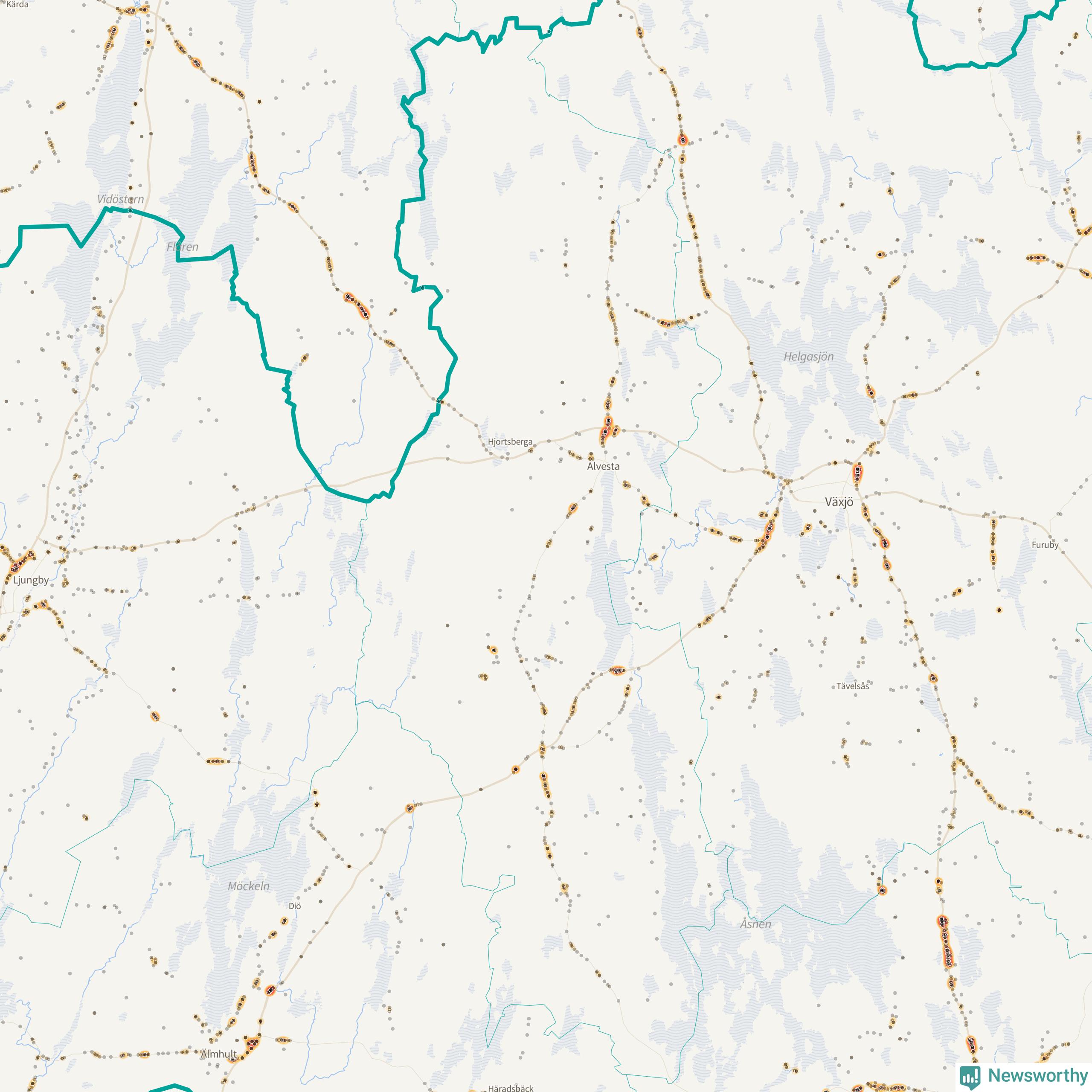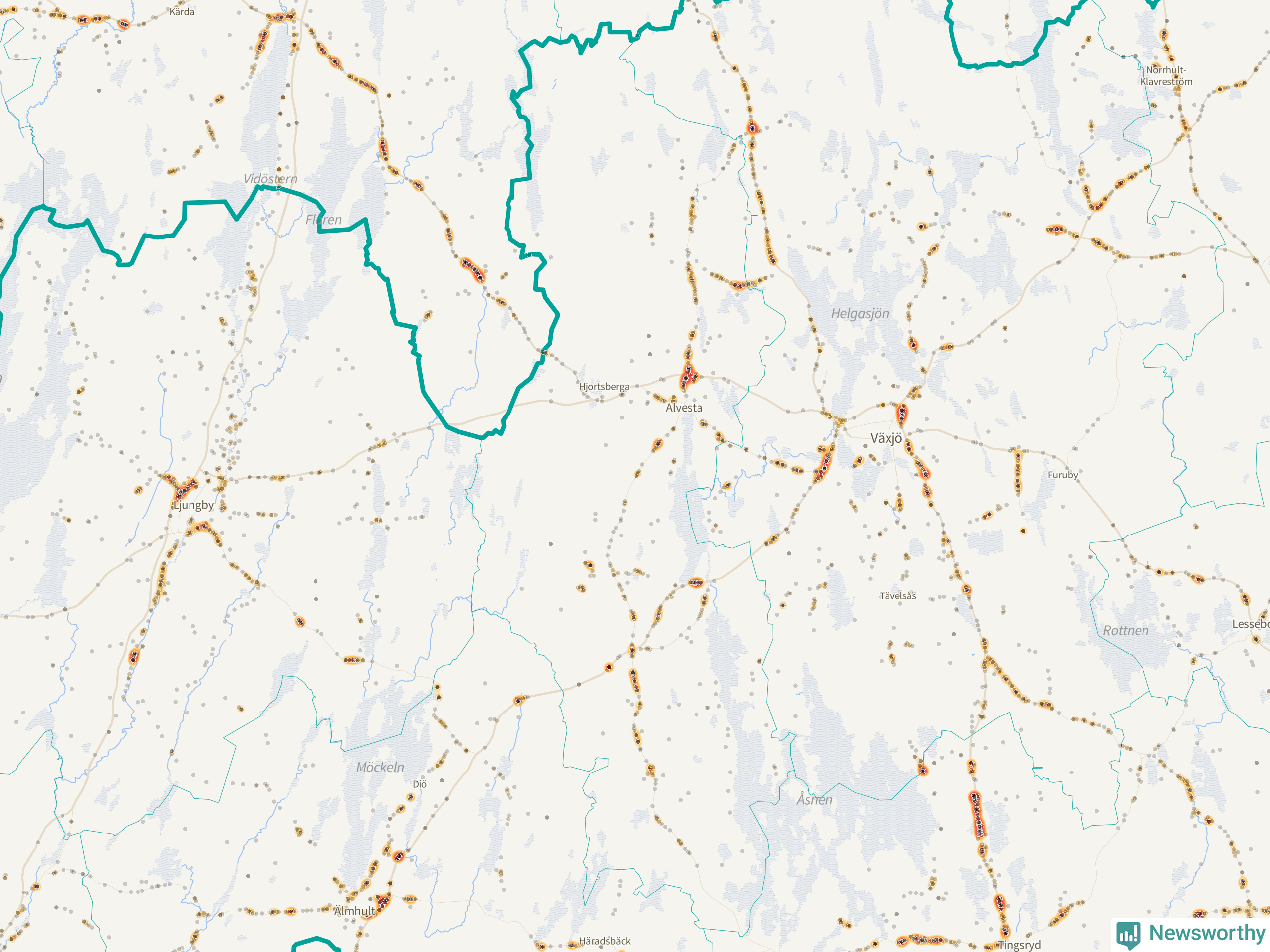 | Väg 738 (Växjövägen) | 19 | rådjur (16 olyckor) |