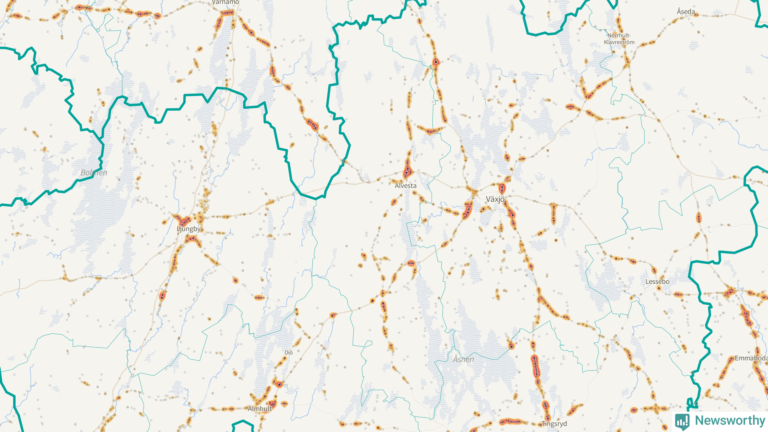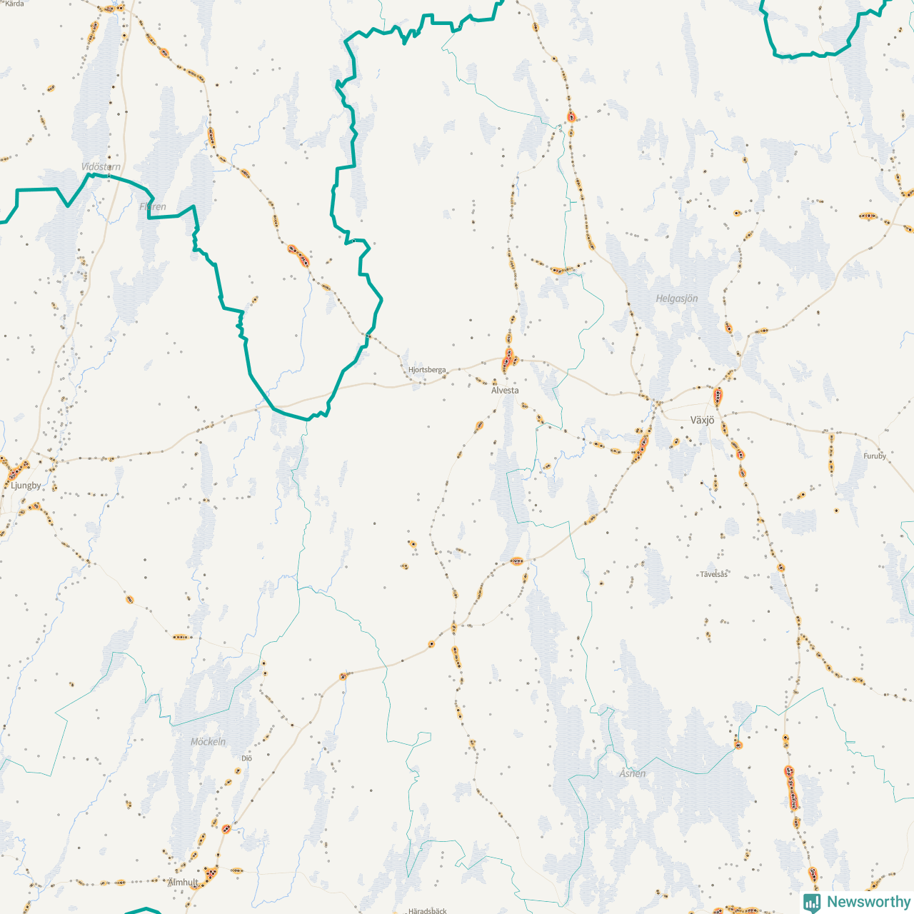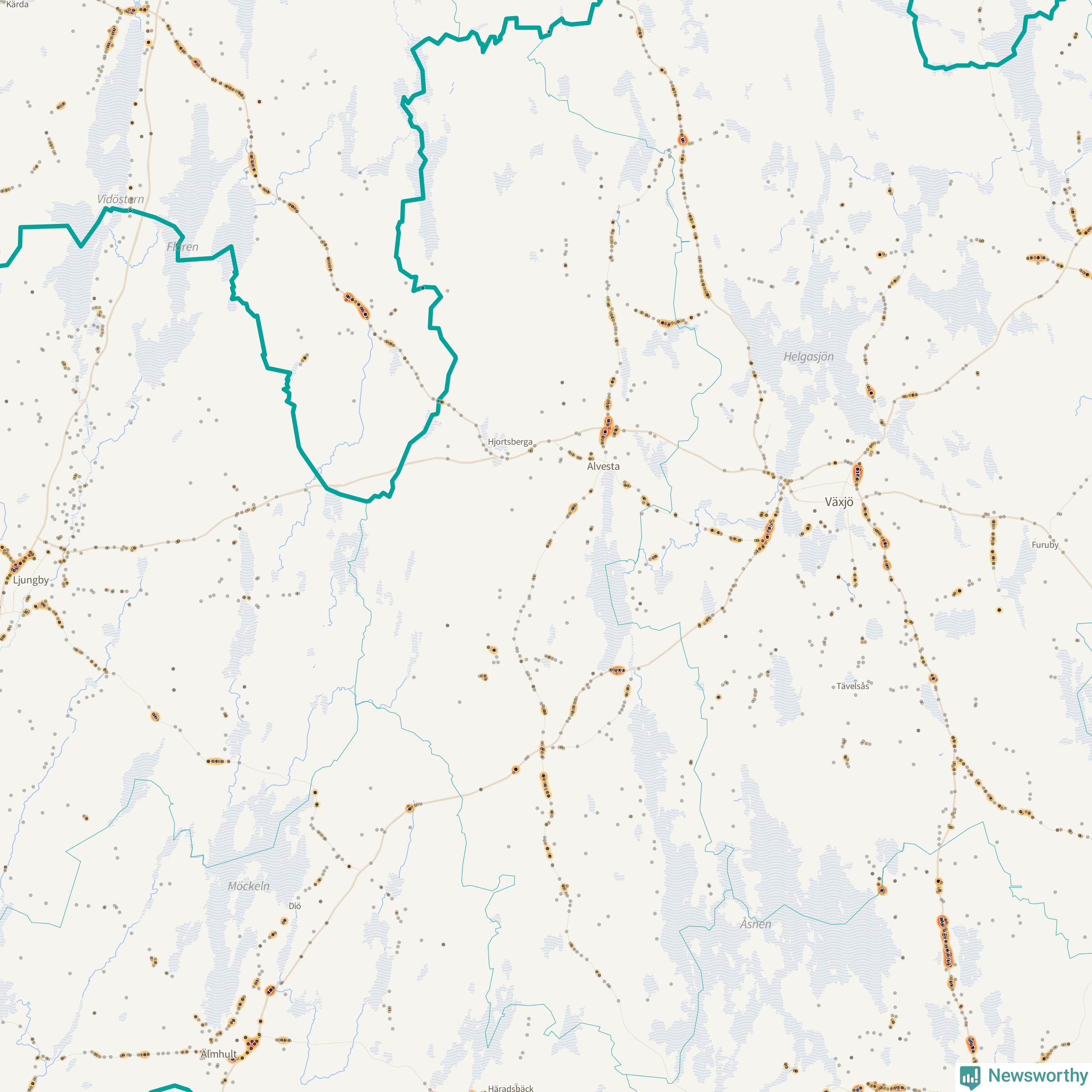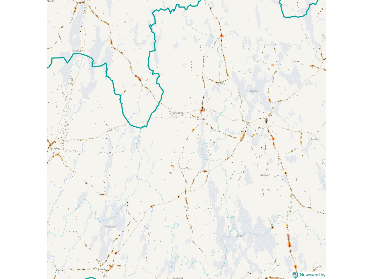 | Väg 738 (Växjövägen) | 19 | rådjur (16 olyckor) |