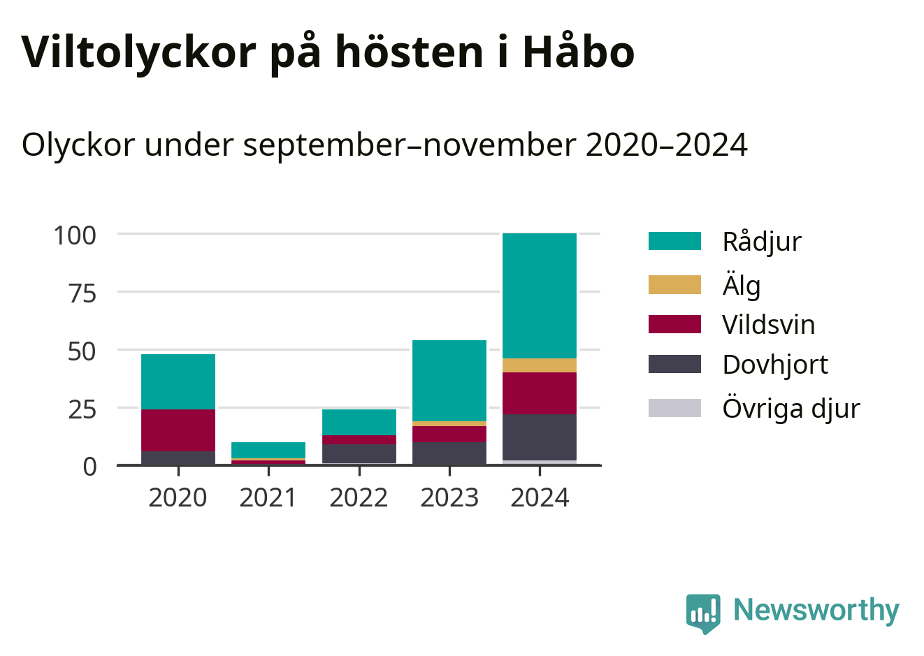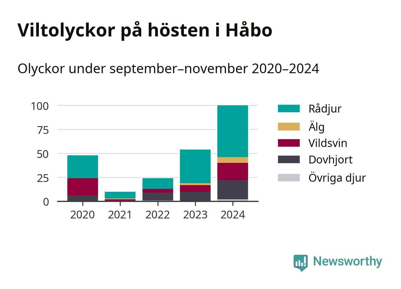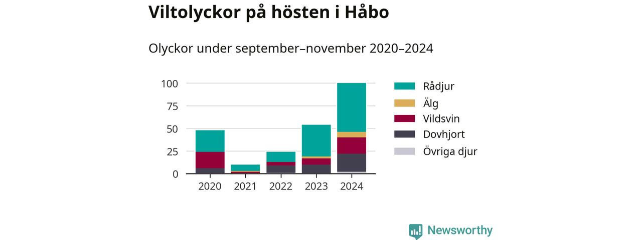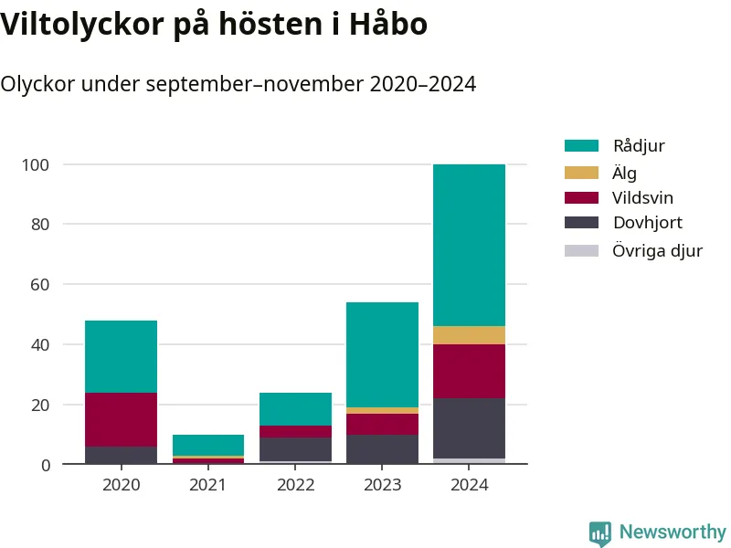 Viltolyckor i Håbo 2020–2024 uppdelat på viltslag