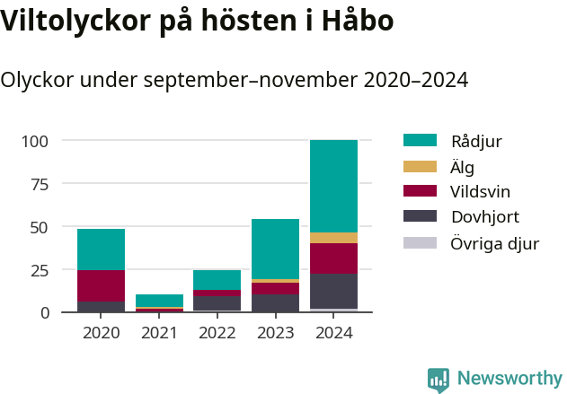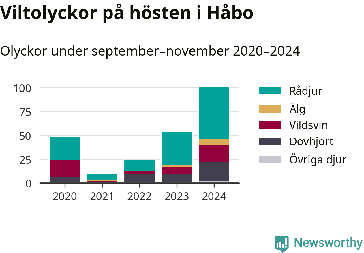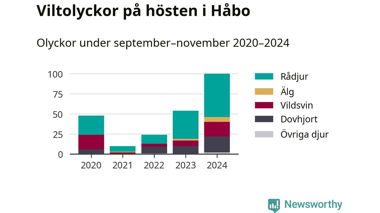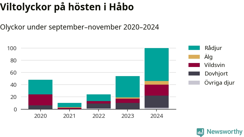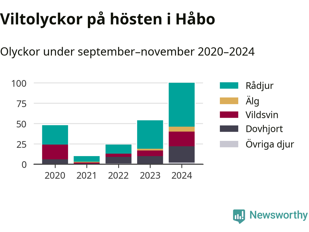 Viltolyckor i Håbo 2020–2024 uppdelat på viltslag