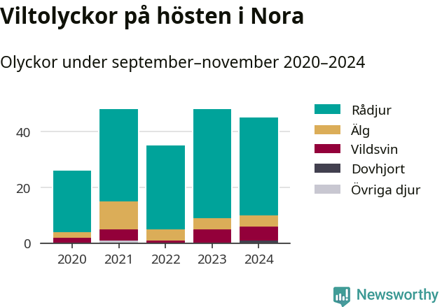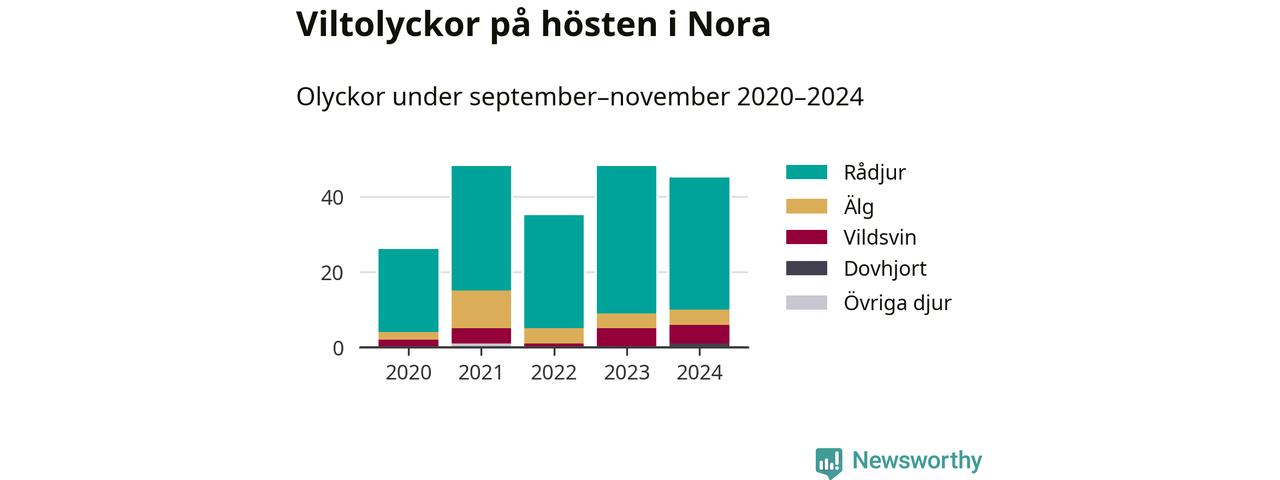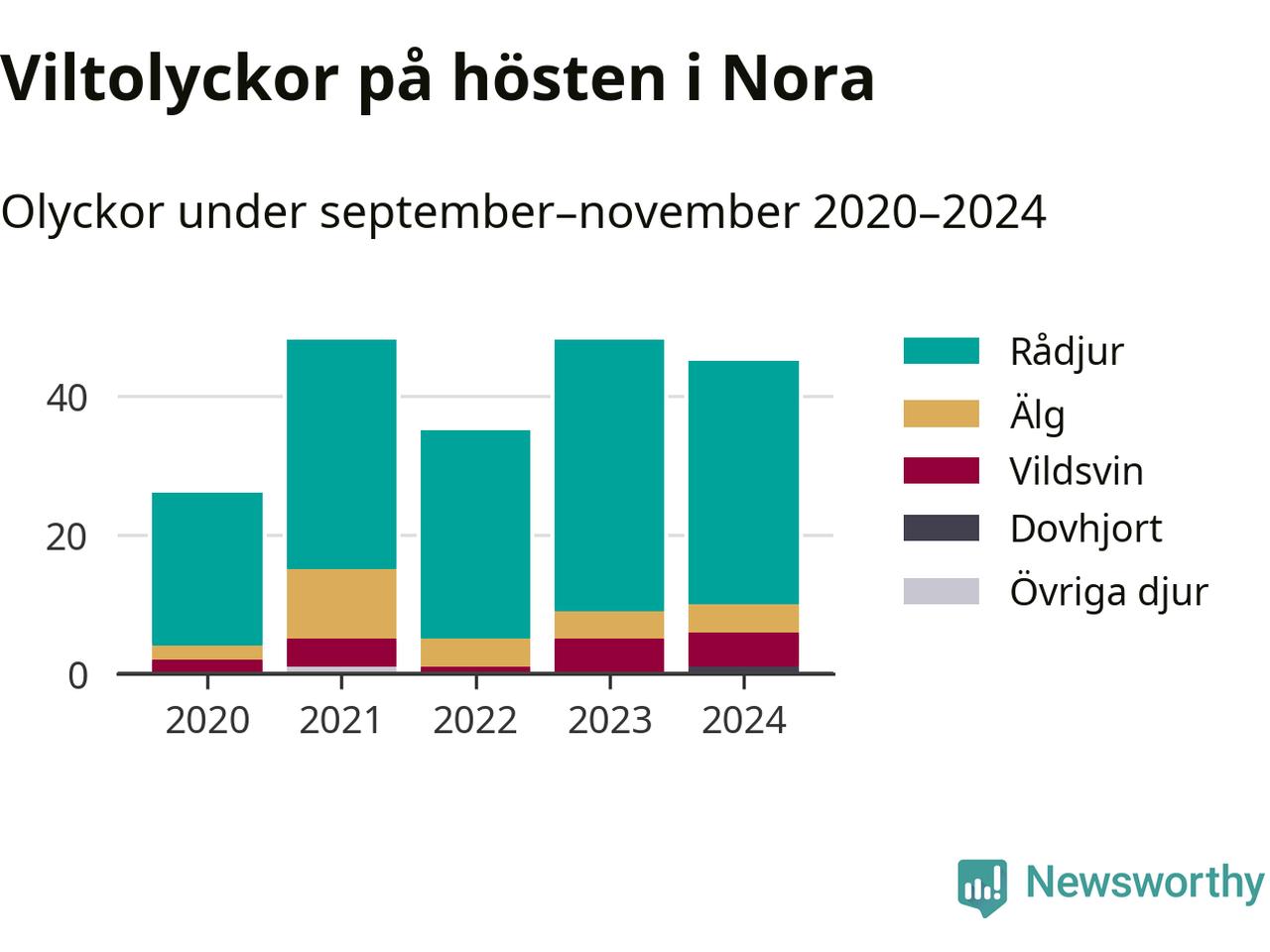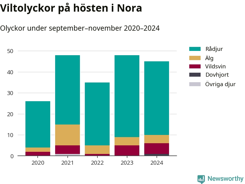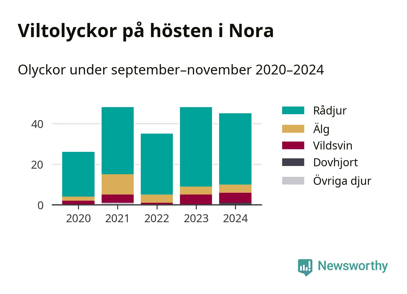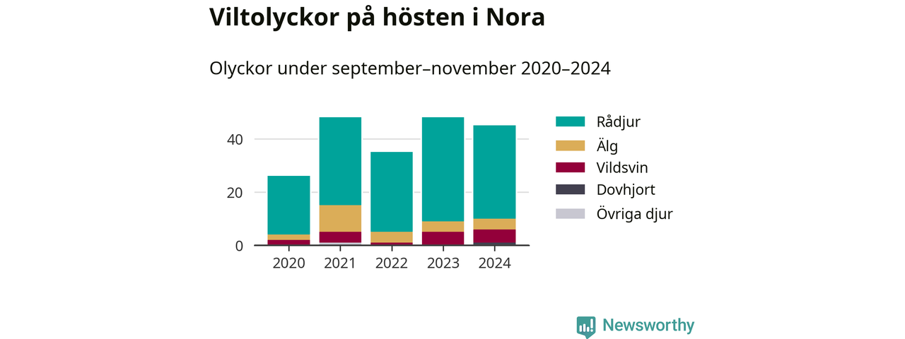 Under de senaste höstarna har antalet viltolyckor ökat i Sverige. Den höst med flest viltolyckor i Nora hittills under 2020-talet var 2021 och 2023, 48 olyckor. I fjol höst rapporterades totalt 45 olyckor.